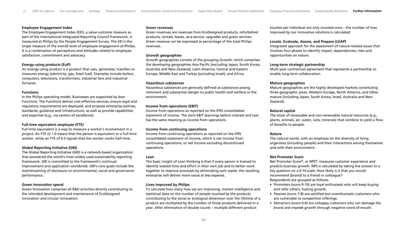 Employee Engagement Index The Employee Engagement Index (EEI), a value outcome measure as part of the International Integrated Reporting Council framework, is measured at Philips by the People Engagement Survey. The EEI is the single measure of the overall level of employee engagement at Philips. It is a combination of perceptions and attitudes related to employee satisfaction, commitment and advocacy. Energy-using products (EuP) An energy-using product is a product that uses, generates, transfers or measures energy (electricity, gas, fossil fuel). Examples include boilers, computers, televisions, transformers, industrial fans and industrial furnaces. Functions In the Philips operating model, Businesses are supported by lean Functions. The Functions deliver cost-effective services, ensure legal and regulatory requirements are deployed, and propose enterprise policies, standards, guidance and infrastructure, as well as provide capabilities and expertise (e.g., via centers of excellence). Full-time equivalent employee (FTE) Full-time equivalent is a way to measure a worker’s involvement in a project. An FTE of 1.0 means that the person is equivalent to a full-time worker, while an FTE of 0.5 signals that the worker works half-time. Global Reporting Initiative (GRI) The Global Reporting Initiative (GRI) is a network-based organization that pioneered the world’s most widely used sustainability reporting framework. GRI is committed to the framework’s continual improvement and application worldwide. GRI’s core goals include the mainstreaming of disclosure on environmental, social and governance performance. Green Innovation spend Green Innovation comprises all R&D activities directly contributing to the intended development and maintenance of EcoDesigned innovation and circular innovation. Green revenues Green revenues are revenues from EcoDesigned products, refurbished products, rentals, leases, as-a-service, upgrades and green services. Green revenue can be expressed as percentage of the total Philips revenues. Growth geographies Growth geographies consists of the grouping Growth, which comprises the developing geographies Asia Pacific (excluding Japan, South Korea, Australia and New Zealand), Latin America, Central and Eastern Europe, Middle East and Turkey (excluding Israel), and Africa. Hazardous substances Hazardous substances are generally defined as substances posing imminent and substantial danger to public health and welfare or the environment. Income from operations (EBIT) Income from operations as reported on the IFRS consolidated statement of income. The term EBIT (earnings before interest and tax) has the same meaning as income from operations. Income from continuing operations Income from continuing operations as reported on the IFRS consolidated statement of income, which is net income from continuing operations, or net income excluding discontinued operations. Lean The basic insight of Lean thinking is that if every person is trained to identify wasted time and effort in their own job and to better work together to improve processes by eliminating such waste, the resulting enterprise will deliver more value at less expense. Lives improved by Philips To calculate how many lives we are improving, market intelligence and statistical data on the number of people touched by the products contributing to the social or ecological dimension over the lifetime of a product are multiplied by the number of those products delivered in a year. After elimination of double counts – multiple different product touches per individual are only counted once – the number of lives improved by our innovative solutions is calculated. Locate, Evaluate, Assess, and Prepare (LEAP) Integrated approach for the assessment of nature-related issues that involves four phases to identify impact, dependencies, risks and opportunities on nature. Long-term strategic partnership Multi-year contractual agreement that represents a partnership to enable long-term collaboration. Mature geographies Mature geographies are the highly developed markets constituting three geographic areas: Western Europe, North America, and Other mature (including Japan, South Korea, Israel, Australia and New Zealand). Natural capital The stock of renewable and non-renewable natural resources (e.g., plants, animals, air, water, soils, minerals) that combine to yield a flow of benefits to people. Nature The natural world, with an emphasis on the diversity of living organisms (including people) and their interactions among themselves and with their environment. Net Promoter Score Net Promoter Score®, or NPS®, measures customer experience and predicts business growth. NPS is calculated by taking the answer to a key question on a 0-10 scale: How likely is it that you would recommend {brand} to a friend or colleague? Respondents are grouped as follows: • Promoters (score 9-10) are loyal enthusiasts who will keep buying and refer others, fueling growth. • Passives (score 7-8) are satisfied but unenthusiastic customers who are vulnerable to competitive offerings. • Detractors (score 0-6) are unhappy customers who can damage the brand and impede growth through negative word-of-mouth. ______ 2025 at a glance Our management Strategy Financial performance Environmental, Social and Governance Supervisory Board Group financial statements Company financial statements Sustainability statement Further information 304