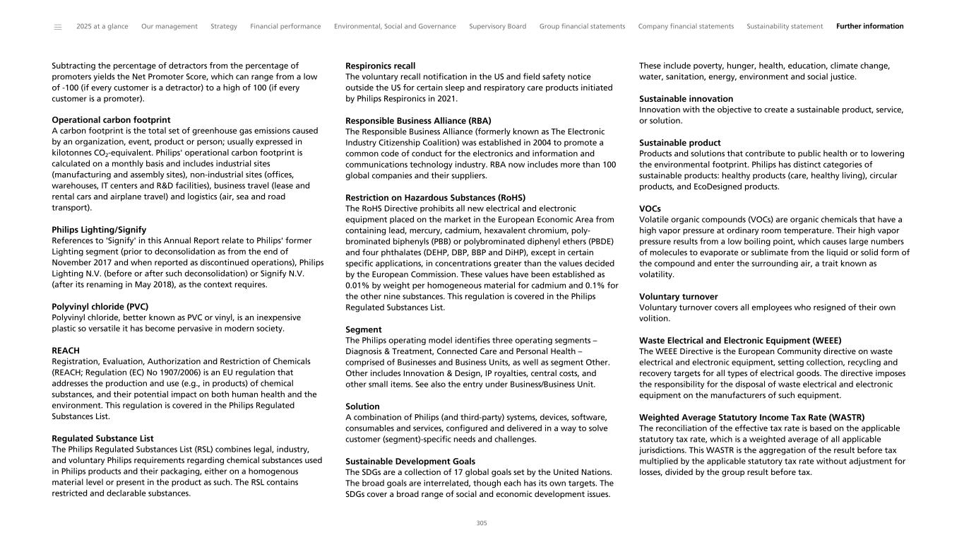 Subtracting the percentage of detractors from the percentage of promoters yields the Net Promoter Score, which can range from a low of -100 (if every customer is a detractor) to a high of 100 (if every customer is a promoter). Operational carbon footprint A carbon footprint is the total set of greenhouse gas emissions caused by an organization, event, product or person; usually expressed in kilotonnes CO2-equivalent. Philips' operational carbon footprint is calculated on a monthly basis and includes industrial sites (manufacturing and assembly sites), non-industrial sites (offices, warehouses, IT centers and R&D facilities), business travel (lease and rental cars and airplane travel) and logistics (air, sea and road transport). Philips Lighting/Signify References to 'Signify' in this Annual Report relate to Philips' former Lighting segment (prior to deconsolidation as from the end of November 2017 and when reported as discontinued operations), Philips Lighting N.V. (before or after such deconsolidation) or Signify N.V. (after its renaming in May 2018), as the context requires. Polyvinyl chloride (PVC) Polyvinyl chloride, better known as PVC or vinyl, is an inexpensive plastic so versatile it has become pervasive in modern society. REACH Registration, Evaluation, Authorization and Restriction of Chemicals (REACH; Regulation (EC) No 1907/2006) is an EU regulation that addresses the production and use (e.g., in products) of chemical substances, and their potential impact on both human health and the environment. This regulation is covered in the Philips Regulated Substances List. Regulated Substance List The Philips Regulated Substances List (RSL) combines legal, industry, and voluntary Philips requirements regarding chemical substances used in Philips products and their packaging, either on a homogenous material level or present in the product as such. The RSL contains restricted and declarable substances. Respironics recall The voluntary recall notification in the US and field safety notice outside the US for certain sleep and respiratory care products initiated by Philips Respironics in 2021. Responsible Business Alliance (RBA) The Responsible Business Alliance (formerly known as The Electronic Industry Citizenship Coalition) was established in 2004 to promote a common code of conduct for the electronics and information and communications technology industry. RBA now includes more than 100 global companies and their suppliers. Restriction on Hazardous Substances (RoHS) The RoHS Directive prohibits all new electrical and electronic equipment placed on the market in the European Economic Area from containing lead, mercury, cadmium, hexavalent chromium, poly- brominated biphenyls (PBB) or polybrominated diphenyl ethers (PBDE) and four phthalates (DEHP, DBP, BBP and DiHP), except in certain specific applications, in concentrations greater than the values decided by the European Commission. These values have been established as 0.01% by weight per homogeneous material for cadmium and 0.1% for the other nine substances. This regulation is covered in the Philips Regulated Substances List. Segment The Philips operating model identifies three operating segments – Diagnosis & Treatment, Connected Care and Personal Health – comprised of Businesses and Business Units, as well as segment Other. Other includes Innovation & Design, IP royalties, central costs, and other small items. See also the entry under Business/Business Unit. Solution A combination of Philips (and third-party) systems, devices, software, consumables and services, configured and delivered in a way to solve customer (segment)-specific needs and challenges. Sustainable Development Goals The SDGs are a collection of 17 global goals set by the United Nations. The broad goals are interrelated, though each has its own targets. The SDGs cover a broad range of social and economic development issues. These include poverty, hunger, health, education, climate change, water, sanitation, energy, environment and social justice. Sustainable innovation Innovation with the objective to create a sustainable product, service, or solution. Sustainable product Products and solutions that contribute to public health or to lowering the environmental footprint. Philips has distinct categories of sustainable products: healthy products (care, healthy living), circular products, and EcoDesigned products. VOCs Volatile organic compounds (VOCs) are organic chemicals that have a high vapor pressure at ordinary room temperature. Their high vapor pressure results from a low boiling point, which causes large numbers of molecules to evaporate or sublimate from the liquid or solid form of the compound and enter the surrounding air, a trait known as volatility. Voluntary turnover Voluntary turnover covers all employees who resigned of their own volition. Waste Electrical and Electronic Equipment (WEEE) The WEEE Directive is the European Community directive on waste electrical and electronic equipment, setting collection, recycling and recovery targets for all types of electrical goods. The directive imposes the responsibility for the disposal of waste electrical and electronic equipment on the manufacturers of such equipment. Weighted Average Statutory Income Tax Rate (WASTR) The reconciliation of the effective tax rate is based on the applicable statutory tax rate, which is a weighted average of all applicable jurisdictions. This WASTR is the aggregation of the result before tax multiplied by the applicable statutory tax rate without adjustment for losses, divided by the group result before tax. ______ 2025 at a glance Our management Strategy Financial performance Environmental, Social and Governance Supervisory Board Group financial statements Company financial statements Sustainability statement Further information 305