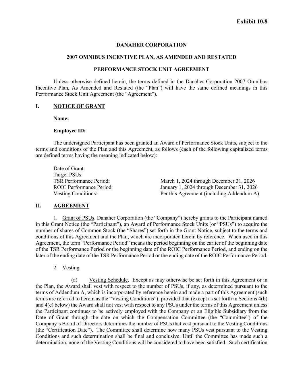 Exhibit 10.8 DANAHER CORPORATION 2007 OMNIBUS INCENTIVE PLAN, AS AMENDED AND RESTATED PERFORMANCE STOCK UNIT AGREEMENT Unless otherwise defined herein, the terms defined in the Danaher Corporation 2007 Omnibus Incentive Plan, As Amended and Restated (the “Plan”) will have the same defined meanings in this Performance Stock Unit Agreement (the “Agreement”). I. NOTICE OF GRANT Name: Employee ID: The undersigned Participant has been granted an Award of Performance Stock Units, subject to the terms and conditions of the Plan and this Agreement, as follows (each of the following capitalized terms are defined terms having the meaning indicated below): Date of Grant: Target PSUs: TSR Performance Period: March 1, 2024 through December 31, 2026 ROIC Performance Period: January 1, 2024 through December 31, 2026 Vesting Conditions: Per this Agreement (including Addendum A) II. AGREEMENT 1. Grant of PSUs. Danaher Corporation (the “Company”) hereby grants to the Participant named in this Grant Notice (the “Participant”), an Award of Performance Stock Units (or “PSUs”) to acquire the number of shares of Common Stock (the “Shares”) set forth in the Grant Notice, subject to the terms and conditions of this Agreement and the Plan, which are incorporated herein by reference. When used in this Agreement, the term “Performance Period” means the period beginning on the earlier of the beginning date of the TSR Performance Period or the beginning date of the ROIC Performance Period, and ending on the later of the ending date of the TSR Performance Period or the ending date of the ROIC Performance Period. 2. Vesting. (a) Vesting Schedule. Except as may otherwise be set forth in this Agreement or in the Plan, the Award shall vest with respect to the number of PSUs, if any, as determined pursuant to the terms of Addendum A, which is incorporated by reference herein and made a part of this Agreement (such terms are referred to herein as the “Vesting Conditions”); provided that (except as set forth in Sections 4(b) and 4(c) below) the Award shall not vest with respect to any PSUs under the terms of this Agreement unless the Participant continues to be actively employed with the Company or an Eligible Subsidiary from the Date of Grant through the date on which the Compensation Committee (the “Committee”) of the Company’s Board of Directors determines the number of PSUs that vest pursuant to the Vesting Conditions (the “Certification Date”). The Committee shall determine how many PSUs vest pursuant to the Vesting Conditions and such determination shall be final and conclusive. Until the Committee has made such a determination, none of the Vesting Conditions will be considered to have been satisfied. Such certification