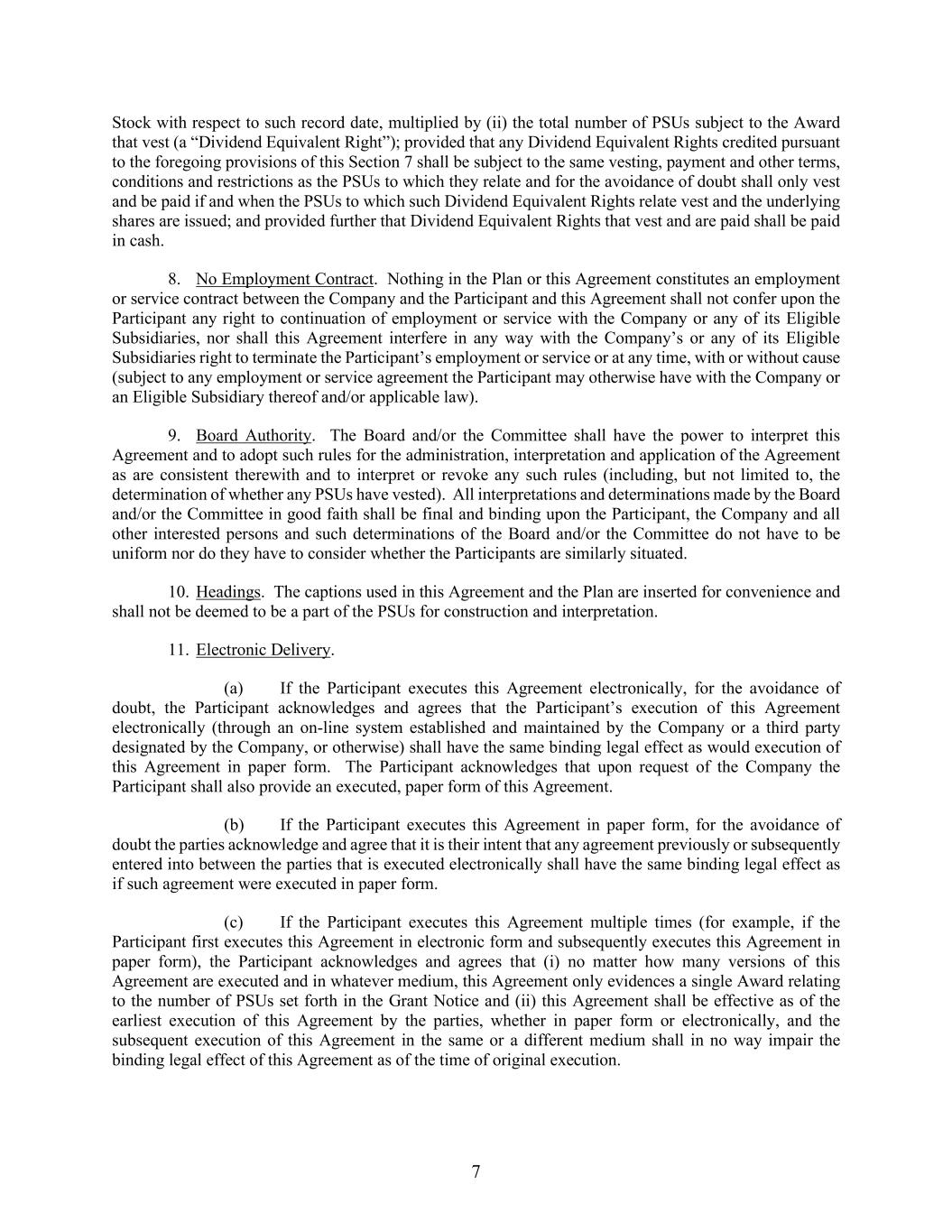 7 Stock with respect to such record date, multiplied by (ii) the total number of PSUs subject to the Award that vest (a “Dividend Equivalent Right”); provided that any Dividend Equivalent Rights credited pursuant to the foregoing provisions of this Section 7 shall be subject to the same vesting, payment and other terms, conditions and restrictions as the PSUs to which they relate and for the avoidance of doubt shall only vest and be paid if and when the PSUs to which such Dividend Equivalent Rights relate vest and the underlying shares are issued; and provided further that Dividend Equivalent Rights that vest and are paid shall be paid in cash. 8. No Employment Contract. Nothing in the Plan or this Agreement constitutes an employment or service contract between the Company and the Participant and this Agreement shall not confer upon the Participant any right to continuation of employment or service with the Company or any of its Eligible Subsidiaries, nor shall this Agreement interfere in any way with the Company’s or any of its Eligible Subsidiaries right to terminate the Participant’s employment or service or at any time, with or without cause (subject to any employment or service agreement the Participant may otherwise have with the Company or an Eligible Subsidiary thereof and/or applicable law). 9. Board Authority. The Board and/or the Committee shall have the power to interpret this Agreement and to adopt such rules for the administration, interpretation and application of the Agreement as are consistent therewith and to interpret or revoke any such rules (including, but not limited to, the determination of whether any PSUs have vested). All interpretations and determinations made by the Board and/or the Committee in good faith shall be final and binding upon the Participant, the Company and all other interested persons and such determinations of the Board and/or the Committee do not have to be uniform nor do they have to consider whether the Participants are similarly situated. 10. Headings. The captions used in this Agreement and the Plan are inserted for convenience and shall not be deemed to be a part of the PSUs for construction and interpretation. 11. Electronic Delivery. (a) If the Participant executes this Agreement electronically, for the avoidance of doubt, the Participant acknowledges and agrees that the Participant’s execution of this Agreement electronically (through an on-line system established and maintained by the Company or a third party designated by the Company, or otherwise) shall have the same binding legal effect as would execution of this Agreement in paper form. The Participant acknowledges that upon request of the Company the Participant shall also provide an executed, paper form of this Agreement. (b) If the Participant executes this Agreement in paper form, for the avoidance of doubt the parties acknowledge and agree that it is their intent that any agreement previously or subsequently entered into between the parties that is executed electronically shall have the same binding legal effect as if such agreement were executed in paper form. (c) If the Participant executes this Agreement multiple times (for example, if the Participant first executes this Agreement in electronic form and subsequently executes this Agreement in paper form), the Participant acknowledges and agrees that (i) no matter how many versions of this Agreement are executed and in whatever medium, this Agreement only evidences a single Award relating to the number of PSUs set forth in the Grant Notice and (ii) this Agreement shall be effective as of the earliest execution of this Agreement by the parties, whether in paper form or electronically, and the subsequent execution of this Agreement in the same or a different medium shall in no way impair the binding legal effect of this Agreement as of the time of original execution.