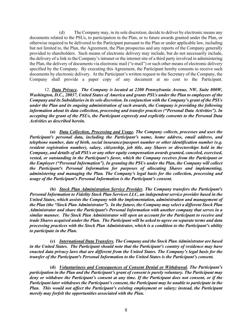8 (d) The Company may, in its sole discretion, decide to deliver by electronic means any documents related to the PSUs, to participation in the Plan, or to future awards granted under the Plan, or otherwise required to be delivered to the Participant pursuant to the Plan or under applicable law, including but not limited to, the Plan, the Agreement, the Plan prospectus and any reports of the Company generally provided to shareholders. Such means of electronic delivery may include, but do not necessarily include, the delivery of a link to the Company’s intranet or the internet site of a third party involved in administering the Plan, the delivery of documents via electronic mail (“e-mail”) or such other means of electronic delivery specified by the Company. By executing this Agreement, the Participant hereby consents to receive such documents by electronic delivery. At the Participant’s written request to the Secretary of the Company, the Company shall provide a paper copy of any document at no cost to the Participant. 12. Data Privacy. The Company is located at 2200 Pennsylvania Avenue, NW, Suite 800W, Washington, D.C., 20037, United States of America and grants PSUs under the Plan to employees of the Company and its Subsidiaries in its sole discretion. In conjunction with the Company’s grant of the PSUs under the Plan and its ongoing administration of such awards, the Company is providing the following information about its data collection, processing and transfer practices (“Personal Data Activities”). In accepting the grant of the PSUs, the Participant expressly and explicitly consents to the Personal Data Activities as described herein. (a) Data Collection, Processing and Usage. The Company collects, processes and uses the Participant's personal data, including the Participant’s name, home address, email address, and telephone number, date of birth, social insurance/passport number or other identification number (e.g. resident registration number), salary, citizenship, job title, any Shares or directorships held in the Company, and details of all PSUs or any other equity compensation awards granted, canceled, exercised, vested, or outstanding in the Participant’s favor, which the Company receives from the Participant or the Employer (“Personal Information”). In granting the PSUs under the Plan, the Company will collect the Participant's Personal Information for purposes of allocating Shares and implementing, administering and managing the Plan. The Company’s legal basis for the collection, processing and usage of the Participant's Personal Information is the Participant’s consent. (b) Stock Plan Administration Service Provider. The Company transfers the Participant's Personal Information to Fidelity Stock Plan Services LLC, an independent service provider based in the United States, which assists the Company with the implementation, administration and management of the Plan (the “Stock Plan Administrator”). In the future, the Company may select a different Stock Plan Administrator and share the Participant's Personal Information with another company that serves in a similar manner. The Stock Plan Administrator will open an account for the Participant to receive and trade Shares acquired under the Plan. The Participant will be asked to agree on separate terms and data processing practices with the Stock Plan Administrator, which is a condition to the Participant’s ability to participate in the Plan. (c) International Data Transfers. The Company and the Stock Plan Administrator are based in the United States. The Participant should note that the Participant’s country of residence may have enacted data privacy laws that are different from the United States. The Company’s legal basis for the transfer of the Participant's Personal Information to the United States is the Participant’s consent. (d) Voluntariness and Consequences of Consent Denial or Withdrawal. The Participant’s participation in the Plan and the Participant’s grant of consent is purely voluntary. The Participant may deny or withdraw the Participant’s consent at any time. If the Participant does not consent, or if the Participant later withdraws the Participant’s consent, the Participant may be unable to participate in the Plan. This would not affect the Participant’s existing employment or salary; instead, the Participant merely may forfeit the opportunities associated with the Plan.