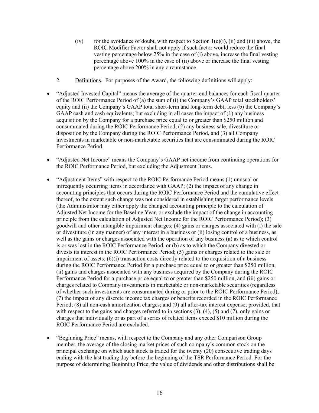 16 (iv) for the avoidance of doubt, with respect to Section 1(c)(i), (ii) and (iii) above, the ROIC Modifier Factor shall not apply if such factor would reduce the final vesting percentage below 25% in the case of (i) above, increase the final vesting percentage above 100% in the case of (ii) above or increase the final vesting percentage above 200% in any circumstance. 2. Definitions. For purposes of the Award, the following definitions will apply: • “Adjusted Invested Capital” means the average of the quarter-end balances for each fiscal quarter of the ROIC Performance Period of (a) the sum of (i) the Company’s GAAP total stockholders’ equity and (ii) the Company’s GAAP total short-term and long-term debt; less (b) the Company’s GAAP cash and cash equivalents; but excluding in all cases the impact of (1) any business acquisition by the Company for a purchase price equal to or greater than $250 million and consummated during the ROIC Performance Period, (2) any business sale, divestiture or disposition by the Company during the ROIC Performance Period, and (3) all Company investments in marketable or non-marketable securities that are consummated during the ROIC Performance Period. • “Adjusted Net Income” means the Company’s GAAP net income from continuing operations for the ROIC Performance Period, but excluding the Adjustment Items. • “Adjustment Items” with respect to the ROIC Performance Period means (1) unusual or infrequently occurring items in accordance with GAAP; (2) the impact of any change in accounting principles that occurs during the ROIC Performance Period and the cumulative effect thereof, to the extent such change was not considered in establishing target performance levels (the Administrator may either apply the changed accounting principle to the calculation of Adjusted Net Income for the Baseline Year, or exclude the impact of the change in accounting principle from the calculation of Adjusted Net Income for the ROIC Performance Period); (3) goodwill and other intangible impairment charges; (4) gains or charges associated with (i) the sale or divestiture (in any manner) of any interest in a business or (ii) losing control of a business, as well as the gains or charges associated with the operation of any business (a) as to which control is or was lost in the ROIC Performance Period, or (b) as to which the Company divested or divests its interest in the ROIC Performance Period; (5) gains or charges related to the sale or impairment of assets; (6)(i) transaction costs directly related to the acquisition of a business during the ROIC Performance Period for a purchase price equal to or greater than $250 million, (ii) gains and charges associated with any business acquired by the Company during the ROIC Performance Period for a purchase price equal to or greater than $250 million, and (iii) gains or charges related to Company investments in marketable or non-marketable securities (regardless of whether such investments are consummated during or prior to the ROIC Performance Period); (7) the impact of any discrete income tax charges or benefits recorded in the ROIC Performance Period; (8) all non-cash amortization charges; and (9) all after-tax interest expense; provided, that with respect to the gains and charges referred to in sections (3), (4), (5) and (7), only gains or charges that individually or as part of a series of related items exceed $10 million during the ROIC Performance Period are excluded. • “Beginning Price” means, with respect to the Company and any other Comparison Group member, the average of the closing market prices of such company’s common stock on the principal exchange on which such stock is traded for the twenty (20) consecutive trading days ending with the last trading day before the beginning of the TSR Performance Period. For the purpose of determining Beginning Price, the value of dividends and other distributions shall be