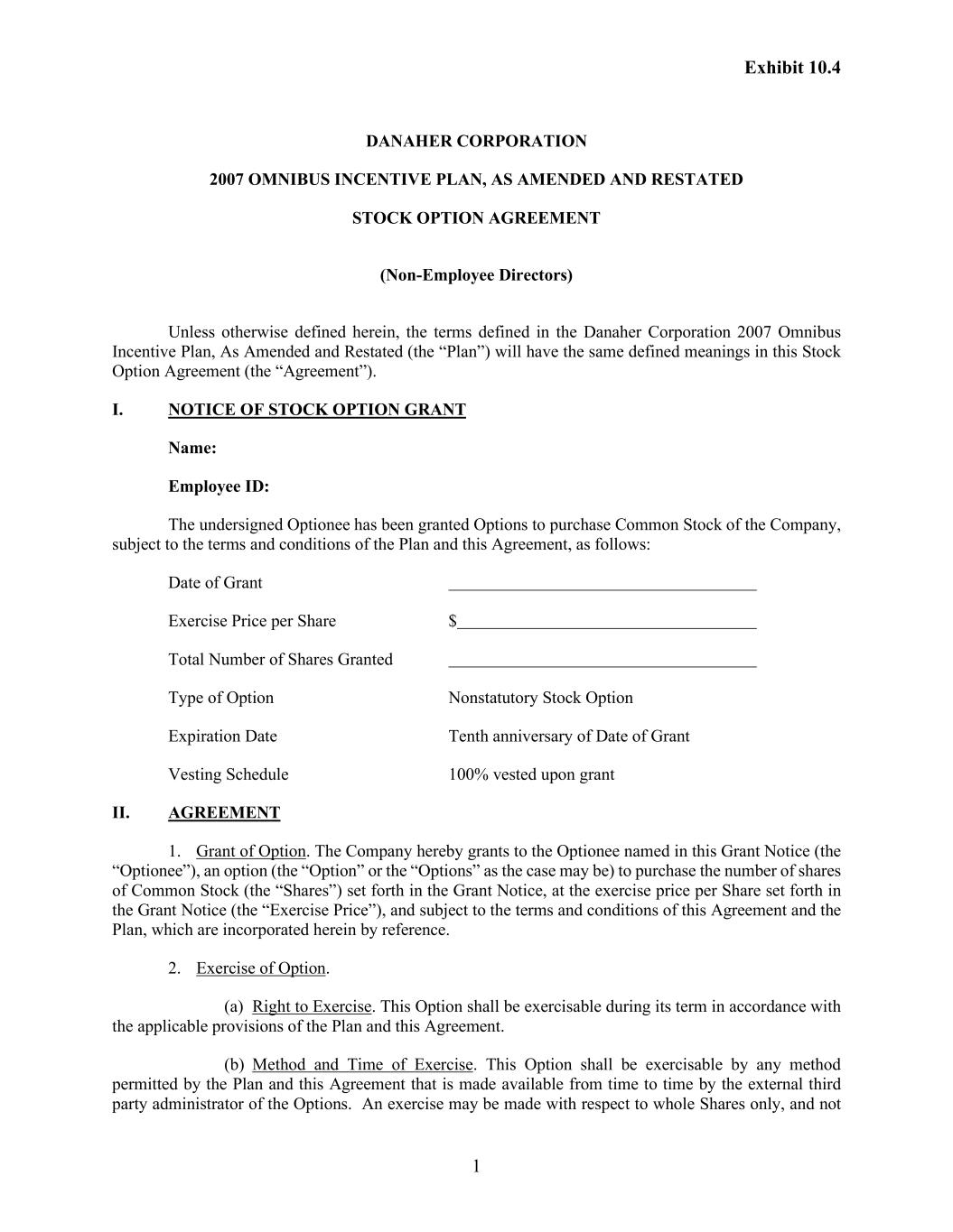 Exhibit 10.4 1 DANAHER CORPORATION 2007 OMNIBUS INCENTIVE PLAN, AS AMENDED AND RESTATED STOCK OPTION AGREEMENT (Non-Employee Directors) Unless otherwise defined herein, the terms defined in the Danaher Corporation 2007 Omnibus Incentive Plan, As Amended and Restated (the “Plan”) will have the same defined meanings in this Stock Option Agreement (the “Agreement”). I. NOTICE OF STOCK OPTION GRANT Name: Employee ID: The undersigned Optionee has been granted Options to purchase Common Stock of the Company, subject to the terms and conditions of the Plan and this Agreement, as follows: Date of Grant Exercise Price per Share $ Total Number of Shares Granted Type of Option Nonstatutory Stock Option Expiration Date Tenth anniversary of Date of Grant Vesting Schedule 100% vested upon grant II. AGREEMENT 1. Grant of Option. The Company hereby grants to the Optionee named in this Grant Notice (the “Optionee”), an option (the “Option” or the “Options” as the case may be) to purchase the number of shares of Common Stock (the “Shares”) set forth in the Grant Notice, at the exercise price per Share set forth in the Grant Notice (the “Exercise Price”), and subject to the terms and conditions of this Agreement and the Plan, which are incorporated herein by reference. 2. Exercise of Option. (a) Right to Exercise. This Option shall be exercisable during its term in accordance with the applicable provisions of the Plan and this Agreement. (b) Method and Time of Exercise. This Option shall be exercisable by any method permitted by the Plan and this Agreement that is made available from time to time by the external third party administrator of the Options. An exercise may be made with respect to whole Shares only, and not