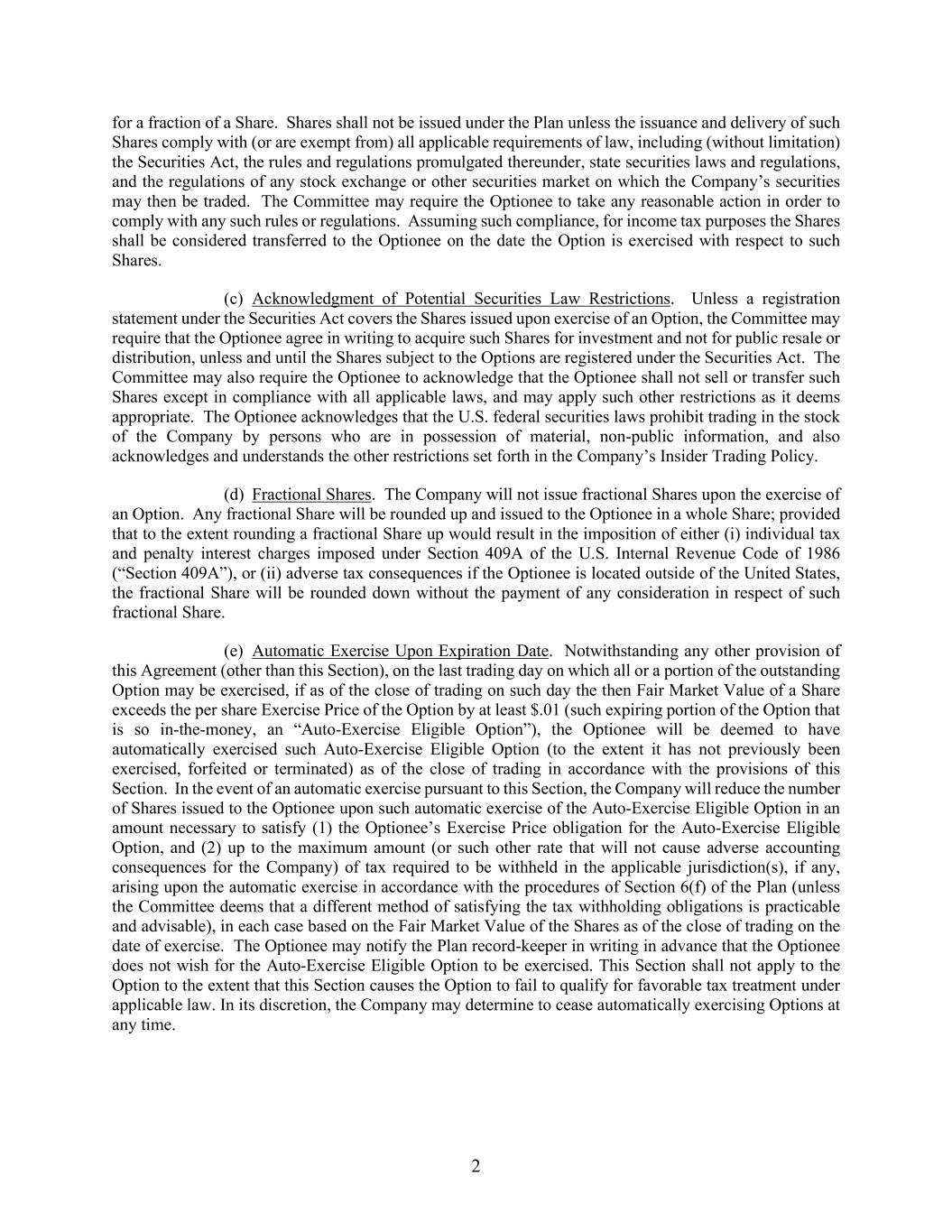 2 for a fraction of a Share. Shares shall not be issued under the Plan unless the issuance and delivery of such Shares comply with (or are exempt from) all applicable requirements of law, including (without limitation) the Securities Act, the rules and regulations promulgated thereunder, state securities laws and regulations, and the regulations of any stock exchange or other securities market on which the Company’s securities may then be traded. The Committee may require the Optionee to take any reasonable action in order to comply with any such rules or regulations. Assuming such compliance, for income tax purposes the Shares shall be considered transferred to the Optionee on the date the Option is exercised with respect to such Shares. (c) Acknowledgment of Potential Securities Law Restrictions. Unless a registration statement under the Securities Act covers the Shares issued upon exercise of an Option, the Committee may require that the Optionee agree in writing to acquire such Shares for investment and not for public resale or distribution, unless and until the Shares subject to the Options are registered under the Securities Act. The Committee may also require the Optionee to acknowledge that the Optionee shall not sell or transfer such Shares except in compliance with all applicable laws, and may apply such other restrictions as it deems appropriate. The Optionee acknowledges that the U.S. federal securities laws prohibit trading in the stock of the Company by persons who are in possession of material, non-public information, and also acknowledges and understands the other restrictions set forth in the Company’s Insider Trading Policy. (d) Fractional Shares. The Company will not issue fractional Shares upon the exercise of an Option. Any fractional Share will be rounded up and issued to the Optionee in a whole Share; provided that to the extent rounding a fractional Share up would result in the imposition of either (i) individual tax and penalty interest charges imposed under Section 409A of the U.S. Internal Revenue Code of 1986 (“Section 409A”), or (ii) adverse tax consequences if the Optionee is located outside of the United States, the fractional Share will be rounded down without the payment of any consideration in respect of such fractional Share. (e) Automatic Exercise Upon Expiration Date. Notwithstanding any other provision of this Agreement (other than this Section), on the last trading day on which all or a portion of the outstanding Option may be exercised, if as of the close of trading on such day the then Fair Market Value of a Share exceeds the per share Exercise Price of the Option by at least $.01 (such expiring portion of the Option that is so in-the-money, an “Auto-Exercise Eligible Option”), the Optionee will be deemed to have automatically exercised such Auto-Exercise Eligible Option (to the extent it has not previously been exercised, forfeited or terminated) as of the close of trading in accordance with the provisions of this Section. In the event of an automatic exercise pursuant to this Section, the Company will reduce the number of Shares issued to the Optionee upon such automatic exercise of the Auto-Exercise Eligible Option in an amount necessary to satisfy (1) the Optionee’s Exercise Price obligation for the Auto-Exercise Eligible Option, and (2) up to the maximum amount (or such other rate that will not cause adverse accounting consequences for the Company) of tax required to be withheld in the applicable jurisdiction(s), if any, arising upon the automatic exercise in accordance with the procedures of Section 6(f) of the Plan (unless the Committee deems that a different method of satisfying the tax withholding obligations is practicable and advisable), in each case based on the Fair Market Value of the Shares as of the close of trading on the date of exercise. The Optionee may notify the Plan record-keeper in writing in advance that the Optionee does not wish for the Auto-Exercise Eligible Option to be exercised. This Section shall not apply to the Option to the extent that this Section causes the Option to fail to qualify for favorable tax treatment under applicable law. In its discretion, the Company may determine to cease automatically exercising Options at any time.