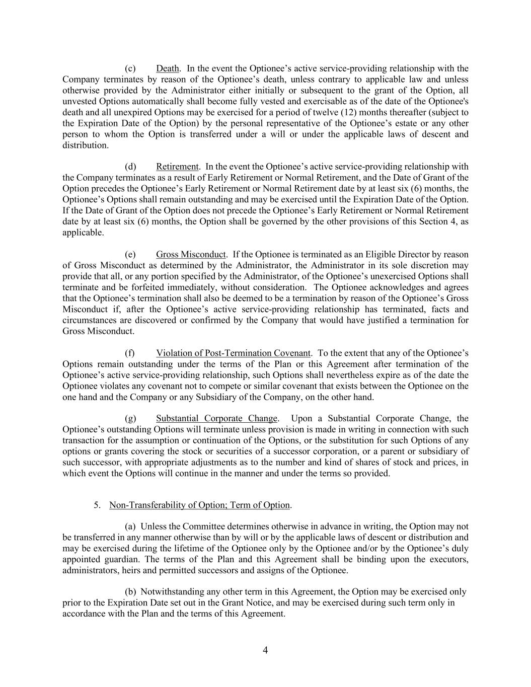 4 (c) Death. In the event the Optionee’s active service-providing relationship with the Company terminates by reason of the Optionee’s death, unless contrary to applicable law and unless otherwise provided by the Administrator either initially or subsequent to the grant of the Option, all unvested Options automatically shall become fully vested and exercisable as of the date of the Optionee's death and all unexpired Options may be exercised for a period of twelve (12) months thereafter (subject to the Expiration Date of the Option) by the personal representative of the Optionee’s estate or any other person to whom the Option is transferred under a will or under the applicable laws of descent and distribution. (d) Retirement. In the event the Optionee’s active service-providing relationship with the Company terminates as a result of Early Retirement or Normal Retirement, and the Date of Grant of the Option precedes the Optionee’s Early Retirement or Normal Retirement date by at least six (6) months, the Optionee’s Options shall remain outstanding and may be exercised until the Expiration Date of the Option. If the Date of Grant of the Option does not precede the Optionee’s Early Retirement or Normal Retirement date by at least six (6) months, the Option shall be governed by the other provisions of this Section 4, as applicable. (e) Gross Misconduct. If the Optionee is terminated as an Eligible Director by reason of Gross Misconduct as determined by the Administrator, the Administrator in its sole discretion may provide that all, or any portion specified by the Administrator, of the Optionee’s unexercised Options shall terminate and be forfeited immediately, without consideration. The Optionee acknowledges and agrees that the Optionee’s termination shall also be deemed to be a termination by reason of the Optionee’s Gross Misconduct if, after the Optionee’s active service-providing relationship has terminated, facts and circumstances are discovered or confirmed by the Company that would have justified a termination for Gross Misconduct. (f) Violation of Post-Termination Covenant. To the extent that any of the Optionee’s Options remain outstanding under the terms of the Plan or this Agreement after termination of the Optionee’s active service-providing relationship, such Options shall nevertheless expire as of the date the Optionee violates any covenant not to compete or similar covenant that exists between the Optionee on the one hand and the Company or any Subsidiary of the Company, on the other hand. (g) Substantial Corporate Change. Upon a Substantial Corporate Change, the Optionee’s outstanding Options will terminate unless provision is made in writing in connection with such transaction for the assumption or continuation of the Options, or the substitution for such Options of any options or grants covering the stock or securities of a successor corporation, or a parent or subsidiary of such successor, with appropriate adjustments as to the number and kind of shares of stock and prices, in which event the Options will continue in the manner and under the terms so provided. 5. Non-Transferability of Option; Term of Option. (a) Unless the Committee determines otherwise in advance in writing, the Option may not be transferred in any manner otherwise than by will or by the applicable laws of descent or distribution and may be exercised during the lifetime of the Optionee only by the Optionee and/or by the Optionee’s duly appointed guardian. The terms of the Plan and this Agreement shall be binding upon the executors, administrators, heirs and permitted successors and assigns of the Optionee. (b) Notwithstanding any other term in this Agreement, the Option may be exercised only prior to the Expiration Date set out in the Grant Notice, and may be exercised during such term only in accordance with the Plan and the terms of this Agreement.
