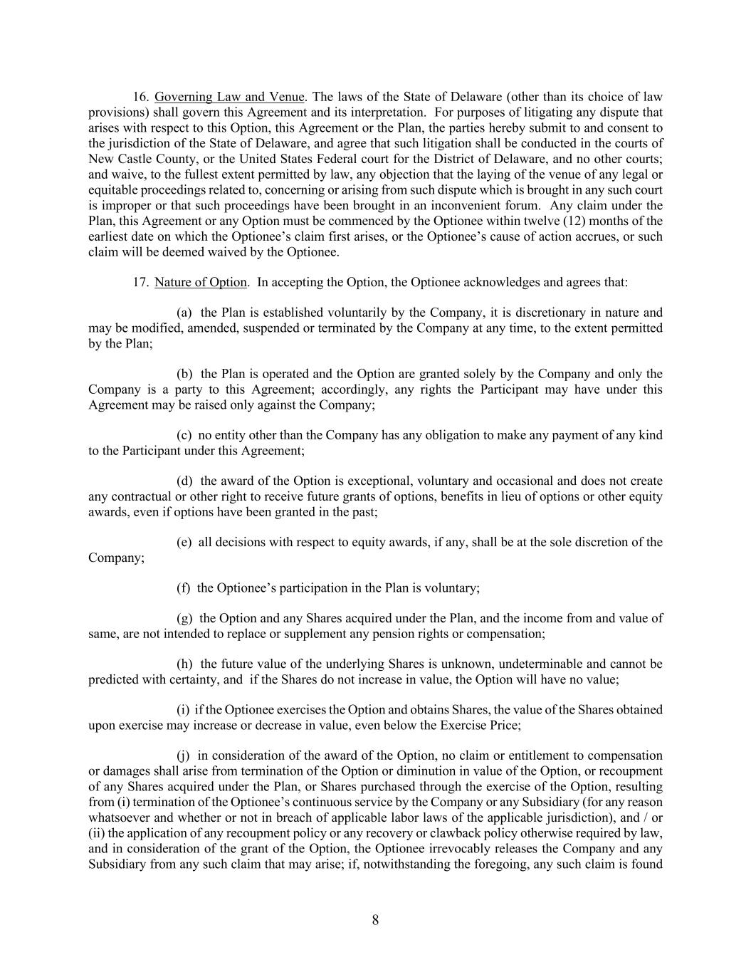 8 16. Governing Law and Venue. The laws of the State of Delaware (other than its choice of law provisions) shall govern this Agreement and its interpretation. For purposes of litigating any dispute that arises with respect to this Option, this Agreement or the Plan, the parties hereby submit to and consent to the jurisdiction of the State of Delaware, and agree that such litigation shall be conducted in the courts of New Castle County, or the United States Federal court for the District of Delaware, and no other courts; and waive, to the fullest extent permitted by law, any objection that the laying of the venue of any legal or equitable proceedings related to, concerning or arising from such dispute which is brought in any such court is improper or that such proceedings have been brought in an inconvenient forum. Any claim under the Plan, this Agreement or any Option must be commenced by the Optionee within twelve (12) months of the earliest date on which the Optionee’s claim first arises, or the Optionee’s cause of action accrues, or such claim will be deemed waived by the Optionee. 17. Nature of Option. In accepting the Option, the Optionee acknowledges and agrees that: (a) the Plan is established voluntarily by the Company, it is discretionary in nature and may be modified, amended, suspended or terminated by the Company at any time, to the extent permitted by the Plan; (b) the Plan is operated and the Option are granted solely by the Company and only the Company is a party to this Agreement; accordingly, any rights the Participant may have under this Agreement may be raised only against the Company; (c) no entity other than the Company has any obligation to make any payment of any kind to the Participant under this Agreement; (d) the award of the Option is exceptional, voluntary and occasional and does not create any contractual or other right to receive future grants of options, benefits in lieu of options or other equity awards, even if options have been granted in the past; (e) all decisions with respect to equity awards, if any, shall be at the sole discretion of the Company; (f) the Optionee’s participation in the Plan is voluntary; (g) the Option and any Shares acquired under the Plan, and the income from and value of same, are not intended to replace or supplement any pension rights or compensation; (h) the future value of the underlying Shares is unknown, undeterminable and cannot be predicted with certainty, and if the Shares do not increase in value, the Option will have no value; (i) if the Optionee exercises the Option and obtains Shares, the value of the Shares obtained upon exercise may increase or decrease in value, even below the Exercise Price; (j) in consideration of the award of the Option, no claim or entitlement to compensation or damages shall arise from termination of the Option or diminution in value of the Option, or recoupment of any Shares acquired under the Plan, or Shares purchased through the exercise of the Option, resulting from (i) termination of the Optionee’s continuous service by the Company or any Subsidiary (for any reason whatsoever and whether or not in breach of applicable labor laws of the applicable jurisdiction), and / or (ii) the application of any recoupment policy or any recovery or clawback policy otherwise required by law, and in consideration of the grant of the Option, the Optionee irrevocably releases the Company and any Subsidiary from any such claim that may arise; if, notwithstanding the foregoing, any such claim is found