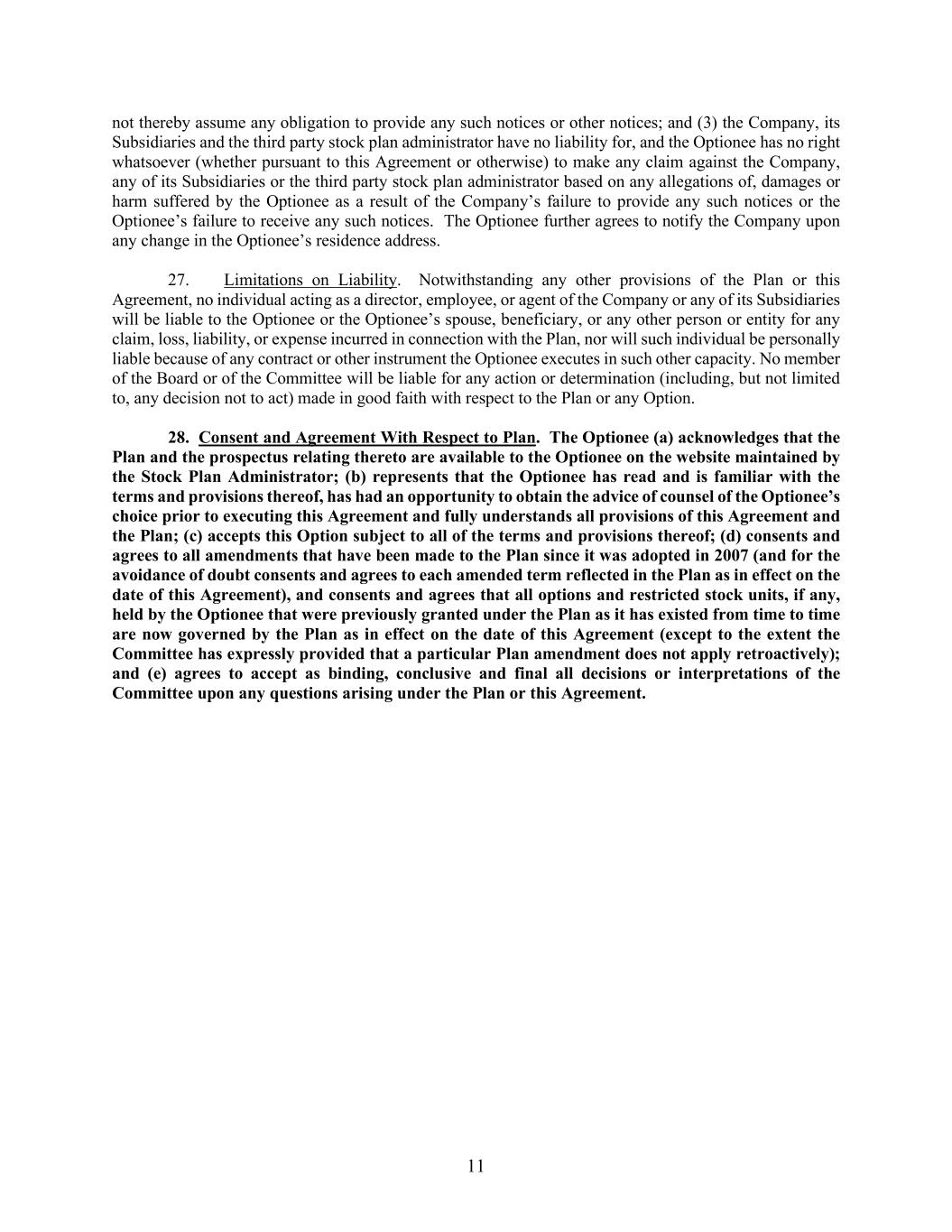 11 not thereby assume any obligation to provide any such notices or other notices; and (3) the Company, its Subsidiaries and the third party stock plan administrator have no liability for, and the Optionee has no right whatsoever (whether pursuant to this Agreement or otherwise) to make any claim against the Company, any of its Subsidiaries or the third party stock plan administrator based on any allegations of, damages or harm suffered by the Optionee as a result of the Company’s failure to provide any such notices or the Optionee’s failure to receive any such notices. The Optionee further agrees to notify the Company upon any change in the Optionee’s residence address. 27. Limitations on Liability. Notwithstanding any other provisions of the Plan or this Agreement, no individual acting as a director, employee, or agent of the Company or any of its Subsidiaries will be liable to the Optionee or the Optionee’s spouse, beneficiary, or any other person or entity for any claim, loss, liability, or expense incurred in connection with the Plan, nor will such individual be personally liable because of any contract or other instrument the Optionee executes in such other capacity. No member of the Board or of the Committee will be liable for any action or determination (including, but not limited to, any decision not to act) made in good faith with respect to the Plan or any Option. 28. Consent and Agreement With Respect to Plan. The Optionee (a) acknowledges that the Plan and the prospectus relating thereto are available to the Optionee on the website maintained by the Stock Plan Administrator; (b) represents that the Optionee has read and is familiar with the terms and provisions thereof, has had an opportunity to obtain the advice of counsel of the Optionee’s choice prior to executing this Agreement and fully understands all provisions of this Agreement and the Plan; (c) accepts this Option subject to all of the terms and provisions thereof; (d) consents and agrees to all amendments that have been made to the Plan since it was adopted in 2007 (and for the avoidance of doubt consents and agrees to each amended term reflected in the Plan as in effect on the date of this Agreement), and consents and agrees that all options and restricted stock units, if any, held by the Optionee that were previously granted under the Plan as it has existed from time to time are now governed by the Plan as in effect on the date of this Agreement (except to the extent the Committee has expressly provided that a particular Plan amendment does not apply retroactively); and (e) agrees to accept as binding, conclusive and final all decisions or interpretations of the Committee upon any questions arising under the Plan or this Agreement.