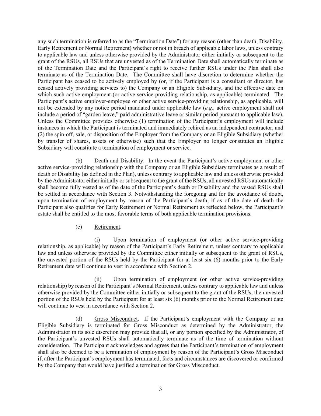 3 any such termination is referred to as the “Termination Date”) for any reason (other than death, Disability, Early Retirement or Normal Retirement) whether or not in breach of applicable labor laws, unless contrary to applicable law and unless otherwise provided by the Administrator either initially or subsequent to the grant of the RSUs, all RSUs that are unvested as of the Termination Date shall automatically terminate as of the Termination Date and the Participant’s right to receive further RSUs under the Plan shall also terminate as of the Termination Date. The Committee shall have discretion to determine whether the Participant has ceased to be actively employed by (or, if the Participant is a consultant or director, has ceased actively providing services to) the Company or an Eligible Subsidiary, and the effective date on which such active employment (or active service-providing relationship, as applicable) terminated. The Participant’s active employer-employee or other active service-providing relationship, as applicable, will not be extended by any notice period mandated under applicable law (e.g., active employment shall not include a period of “garden leave,” paid administrative leave or similar period pursuant to applicable law). Unless the Committee provides otherwise (1) termination of the Participant’s employment will include instances in which the Participant is terminated and immediately rehired as an independent contractor, and (2) the spin-off, sale, or disposition of the Employer from the Company or an Eligible Subsidiary (whether by transfer of shares, assets or otherwise) such that the Employer no longer constitutes an Eligible Subsidiary will constitute a termination of employment or service. (b) Death and Disability. In the event the Participant’s active employment or other active service-providing relationship with the Company or an Eligible Subsidiary terminates as a result of death or Disability (as defined in the Plan), unless contrary to applicable law and unless otherwise provided by the Administrator either initially or subsequent to the grant of the RSUs, all unvested RSUs automatically shall become fully vested as of the date of the Participant’s death or Disability and the vested RSUs shall be settled in accordance with Section 3. Notwithstanding the foregoing and for the avoidance of doubt, upon termination of employment by reason of the Participant’s death, if as of the date of death the Participant also qualifies for Early Retirement or Normal Retirement as reflected below, the Participant’s estate shall be entitled to the most favorable terms of both applicable termination provisions. (c) Retirement. (i) Upon termination of employment (or other active service-providing relationship, as applicable) by reason of the Participant’s Early Retirement, unless contrary to applicable law and unless otherwise provided by the Committee either initially or subsequent to the grant of RSUs, the unvested portion of the RSUs held by the Participant for at least six (6) months prior to the Early Retirement date will continue to vest in accordance with Section 2. (ii) Upon termination of employment (or other active service-providing relationship) by reason of the Participant’s Normal Retirement, unless contrary to applicable law and unless otherwise provided by the Committee either initially or subsequent to the grant of the RSUs, the unvested portion of the RSUs held by the Participant for at least six (6) months prior to the Normal Retirement date will continue to vest in accordance with Section 2. (d) Gross Misconduct. If the Participant’s employment with the Company or an Eligible Subsidiary is terminated for Gross Misconduct as determined by the Administrator, the Administrator in its sole discretion may provide that all, or any portion specified by the Administrator, of the Participant’s unvested RSUs shall automatically terminate as of the time of termination without consideration. The Participant acknowledges and agrees that the Participant’s termination of employment shall also be deemed to be a termination of employment by reason of the Participant’s Gross Misconduct if, after the Participant’s employment has terminated, facts and circumstances are discovered or confirmed by the Company that would have justified a termination for Gross Misconduct.