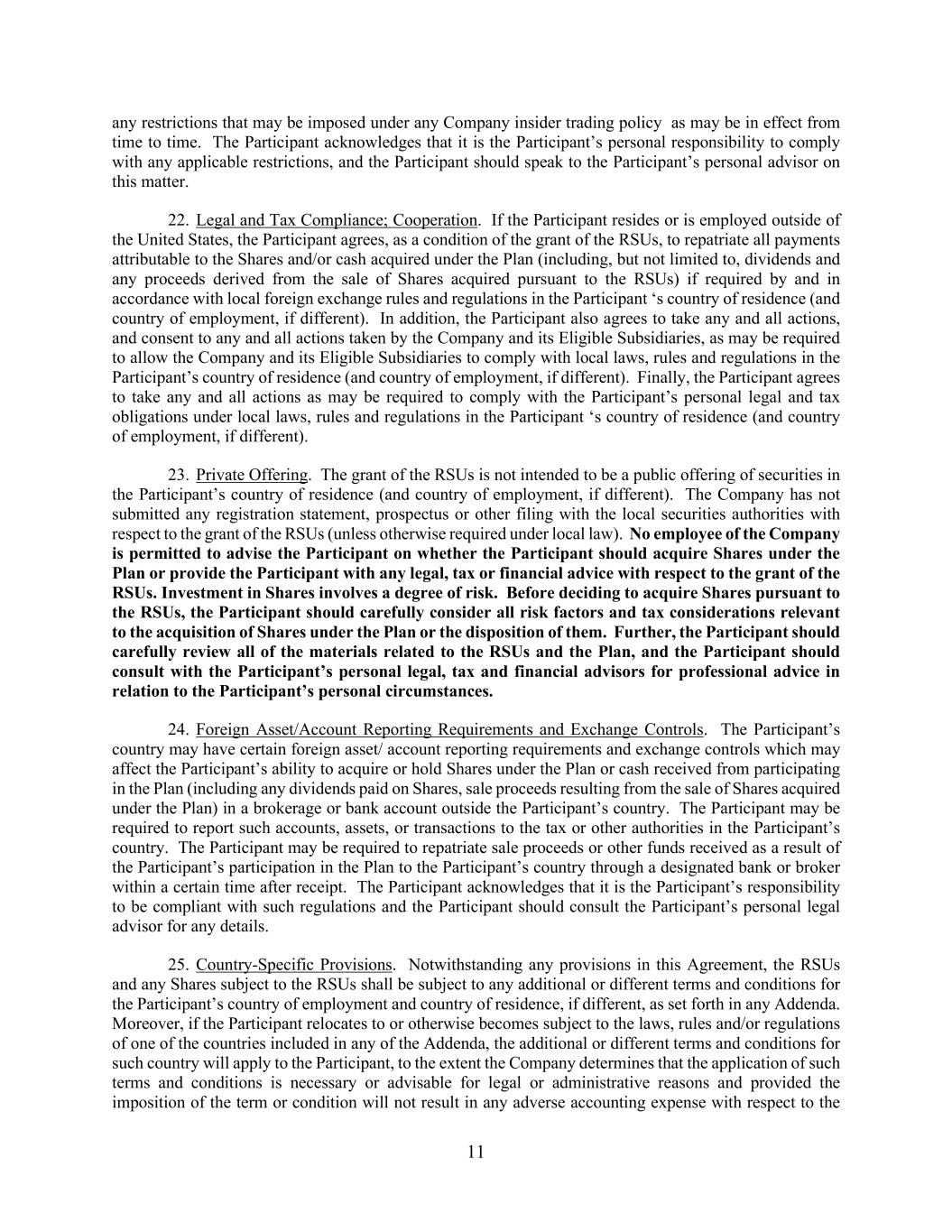 11 any restrictions that may be imposed under any Company insider trading policy as may be in effect from time to time. The Participant acknowledges that it is the Participant’s personal responsibility to comply with any applicable restrictions, and the Participant should speak to the Participant’s personal advisor on this matter. 22. Legal and Tax Compliance; Cooperation. If the Participant resides or is employed outside of the United States, the Participant agrees, as a condition of the grant of the RSUs, to repatriate all payments attributable to the Shares and/or cash acquired under the Plan (including, but not limited to, dividends and any proceeds derived from the sale of Shares acquired pursuant to the RSUs) if required by and in accordance with local foreign exchange rules and regulations in the Participant ‘s country of residence (and country of employment, if different). In addition, the Participant also agrees to take any and all actions, and consent to any and all actions taken by the Company and its Eligible Subsidiaries, as may be required to allow the Company and its Eligible Subsidiaries to comply with local laws, rules and regulations in the Participant’s country of residence (and country of employment, if different). Finally, the Participant agrees to take any and all actions as may be required to comply with the Participant’s personal legal and tax obligations under local laws, rules and regulations in the Participant ‘s country of residence (and country of employment, if different). 23. Private Offering. The grant of the RSUs is not intended to be a public offering of securities in the Participant’s country of residence (and country of employment, if different). The Company has not submitted any registration statement, prospectus or other filing with the local securities authorities with respect to the grant of the RSUs (unless otherwise required under local law). No employee of the Company is permitted to advise the Participant on whether the Participant should acquire Shares under the Plan or provide the Participant with any legal, tax or financial advice with respect to the grant of the RSUs. Investment in Shares involves a degree of risk. Before deciding to acquire Shares pursuant to the RSUs, the Participant should carefully consider all risk factors and tax considerations relevant to the acquisition of Shares under the Plan or the disposition of them. Further, the Participant should carefully review all of the materials related to the RSUs and the Plan, and the Participant should consult with the Participant’s personal legal, tax and financial advisors for professional advice in relation to the Participant’s personal circumstances. 24. Foreign Asset/Account Reporting Requirements and Exchange Controls. The Participant’s country may have certain foreign asset/ account reporting requirements and exchange controls which may affect the Participant’s ability to acquire or hold Shares under the Plan or cash received from participating in the Plan (including any dividends paid on Shares, sale proceeds resulting from the sale of Shares acquired under the Plan) in a brokerage or bank account outside the Participant’s country. The Participant may be required to report such accounts, assets, or transactions to the tax or other authorities in the Participant’s country. The Participant may be required to repatriate sale proceeds or other funds received as a result of the Participant’s participation in the Plan to the Participant’s country through a designated bank or broker within a certain time after receipt. The Participant acknowledges that it is the Participant’s responsibility to be compliant with such regulations and the Participant should consult the Participant’s personal legal advisor for any details. 25. Country-Specific Provisions. Notwithstanding any provisions in this Agreement, the RSUs and any Shares subject to the RSUs shall be subject to any additional or different terms and conditions for the Participant’s country of employment and country of residence, if different, as set forth in any Addenda. Moreover, if the Participant relocates to or otherwise becomes subject to the laws, rules and/or regulations of one of the countries included in any of the Addenda, the additional or different terms and conditions for such country will apply to the Participant, to the extent the Company determines that the application of such terms and conditions is necessary or advisable for legal or administrative reasons and provided the imposition of the term or condition will not result in any adverse accounting expense with respect to the