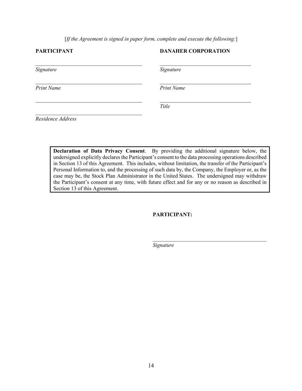 14 [If the Agreement is signed in paper form, complete and execute the following:] PARTICIPANT DANAHER CORPORATION Signature Signature Print Name Print Name Title Residence Address Declaration of Data Privacy Consent. By providing the additional signature below, the undersigned explicitly declares the Participant’s consent to the data processing operations described in Section 13 of this Agreement. This includes, without limitation, the transfer of the Participant’s Personal Information to, and the processing of such data by, the Company, the Employer or, as the case may be, the Stock Plan Administrator in the United States. The undersigned may withdraw the Participant’s consent at any time, with future effect and for any or no reason as described in Section 13 of this Agreement. PARTICIPANT: Signature