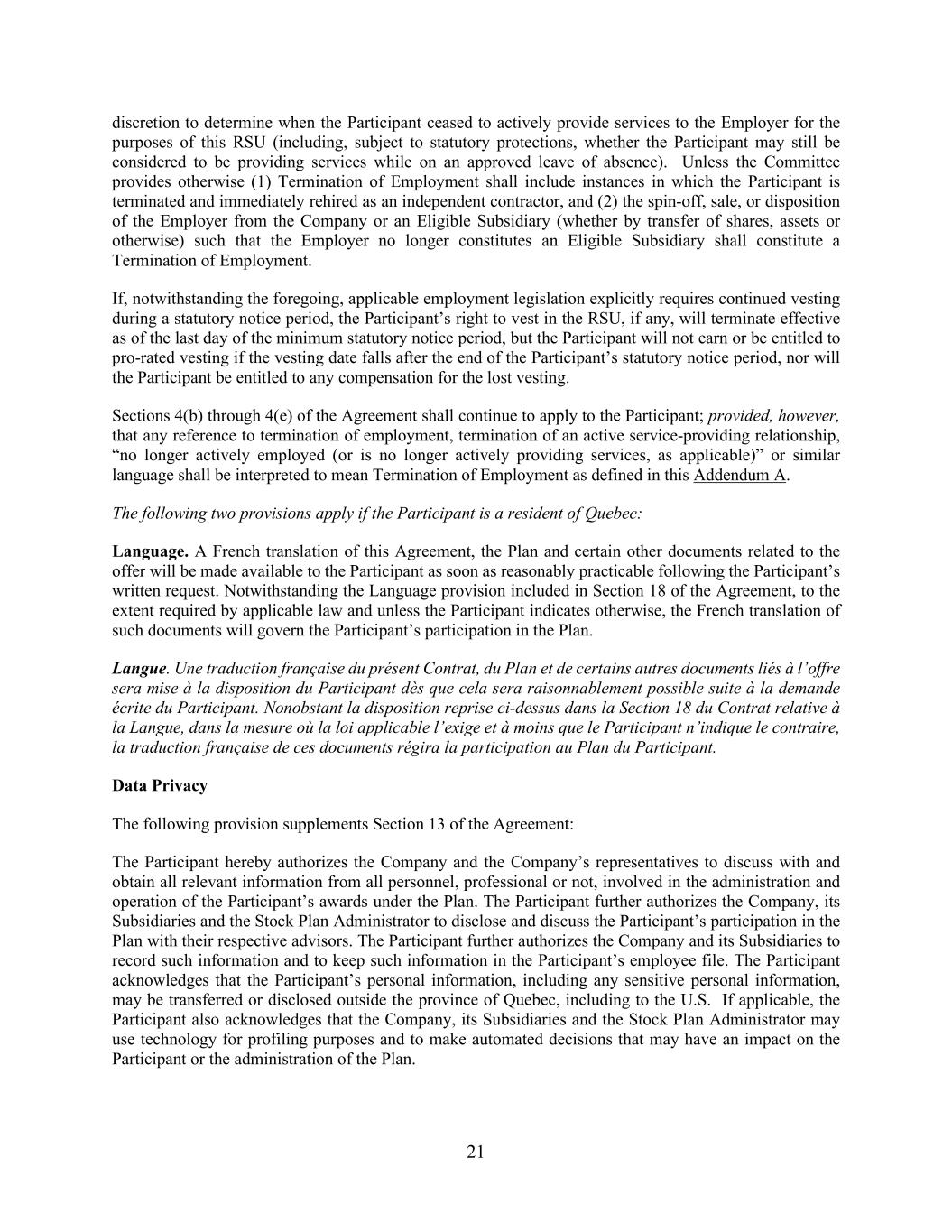 21 discretion to determine when the Participant ceased to actively provide services to the Employer for the purposes of this RSU (including, subject to statutory protections, whether the Participant may still be considered to be providing services while on an approved leave of absence). Unless the Committee provides otherwise (1) Termination of Employment shall include instances in which the Participant is terminated and immediately rehired as an independent contractor, and (2) the spin-off, sale, or disposition of the Employer from the Company or an Eligible Subsidiary (whether by transfer of shares, assets or otherwise) such that the Employer no longer constitutes an Eligible Subsidiary shall constitute a Termination of Employment. If, notwithstanding the foregoing, applicable employment legislation explicitly requires continued vesting during a statutory notice period, the Participant’s right to vest in the RSU, if any, will terminate effective as of the last day of the minimum statutory notice period, but the Participant will not earn or be entitled to pro-rated vesting if the vesting date falls after the end of the Participant’s statutory notice period, nor will the Participant be entitled to any compensation for the lost vesting. Sections 4(b) through 4(e) of the Agreement shall continue to apply to the Participant; provided, however, that any reference to termination of employment, termination of an active service-providing relationship, “no longer actively employed (or is no longer actively providing services, as applicable)” or similar language shall be interpreted to mean Termination of Employment as defined in this Addendum A. The following two provisions apply if the Participant is a resident of Quebec: Language. A French translation of this Agreement, the Plan and certain other documents related to the offer will be made available to the Participant as soon as reasonably practicable following the Participant’s written request. Notwithstanding the Language provision included in Section 18 of the Agreement, to the extent required by applicable law and unless the Participant indicates otherwise, the French translation of such documents will govern the Participant’s participation in the Plan. Langue. Une traduction française du présent Contrat, du Plan et de certains autres documents liés à l’offre sera mise à la disposition du Participant dès que cela sera raisonnablement possible suite à la demande écrite du Participant. Nonobstant la disposition reprise ci-dessus dans la Section 18 du Contrat relative à la Langue, dans la mesure où la loi applicable l’exige et à moins que le Participant n’indique le contraire, la traduction française de ces documents régira la participation au Plan du Participant. Data Privacy The following provision supplements Section 13 of the Agreement: The Participant hereby authorizes the Company and the Company’s representatives to discuss with and obtain all relevant information from all personnel, professional or not, involved in the administration and operation of the Participant’s awards under the Plan. The Participant further authorizes the Company, its Subsidiaries and the Stock Plan Administrator to disclose and discuss the Participant’s participation in the Plan with their respective advisors. The Participant further authorizes the Company and its Subsidiaries to record such information and to keep such information in the Participant’s employee file. The Participant acknowledges that the Participant’s personal information, including any sensitive personal information, may be transferred or disclosed outside the province of Quebec, including to the U.S. If applicable, the Participant also acknowledges that the Company, its Subsidiaries and the Stock Plan Administrator may use technology for profiling purposes and to make automated decisions that may have an impact on the Participant or the administration of the Plan.
