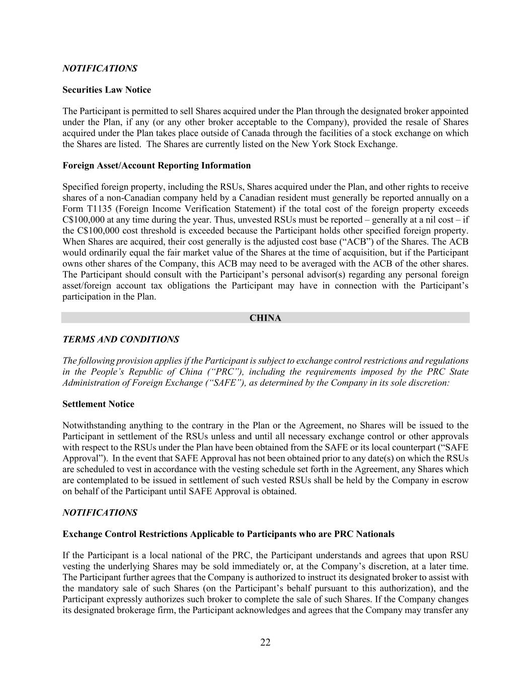 22 NOTIFICATIONS Securities Law Notice The Participant is permitted to sell Shares acquired under the Plan through the designated broker appointed under the Plan, if any (or any other broker acceptable to the Company), provided the resale of Shares acquired under the Plan takes place outside of Canada through the facilities of a stock exchange on which the Shares are listed. The Shares are currently listed on the New York Stock Exchange. Foreign Asset/Account Reporting Information Specified foreign property, including the RSUs, Shares acquired under the Plan, and other rights to receive shares of a non-Canadian company held by a Canadian resident must generally be reported annually on a Form T1135 (Foreign Income Verification Statement) if the total cost of the foreign property exceeds C$100,000 at any time during the year. Thus, unvested RSUs must be reported – generally at a nil cost – if the C$100,000 cost threshold is exceeded because the Participant holds other specified foreign property. When Shares are acquired, their cost generally is the adjusted cost base (“ACB”) of the Shares. The ACB would ordinarily equal the fair market value of the Shares at the time of acquisition, but if the Participant owns other shares of the Company, this ACB may need to be averaged with the ACB of the other shares. The Participant should consult with the Participant’s personal advisor(s) regarding any personal foreign asset/foreign account tax obligations the Participant may have in connection with the Participant’s participation in the Plan. CHINA TERMS AND CONDITIONS The following provision applies if the Participant is subject to exchange control restrictions and regulations in the People’s Republic of China (“PRC”), including the requirements imposed by the PRC State Administration of Foreign Exchange (“SAFE”), as determined by the Company in its sole discretion: Settlement Notice Notwithstanding anything to the contrary in the Plan or the Agreement, no Shares will be issued to the Participant in settlement of the RSUs unless and until all necessary exchange control or other approvals with respect to the RSUs under the Plan have been obtained from the SAFE or its local counterpart (“SAFE Approval”). In the event that SAFE Approval has not been obtained prior to any date(s) on which the RSUs are scheduled to vest in accordance with the vesting schedule set forth in the Agreement, any Shares which are contemplated to be issued in settlement of such vested RSUs shall be held by the Company in escrow on behalf of the Participant until SAFE Approval is obtained. NOTIFICATIONS Exchange Control Restrictions Applicable to Participants who are PRC Nationals If the Participant is a local national of the PRC, the Participant understands and agrees that upon RSU vesting the underlying Shares may be sold immediately or, at the Company’s discretion, at a later time. The Participant further agrees that the Company is authorized to instruct its designated broker to assist with the mandatory sale of such Shares (on the Participant’s behalf pursuant to this authorization), and the Participant expressly authorizes such broker to complete the sale of such Shares. If the Company changes its designated brokerage firm, the Participant acknowledges and agrees that the Company may transfer any