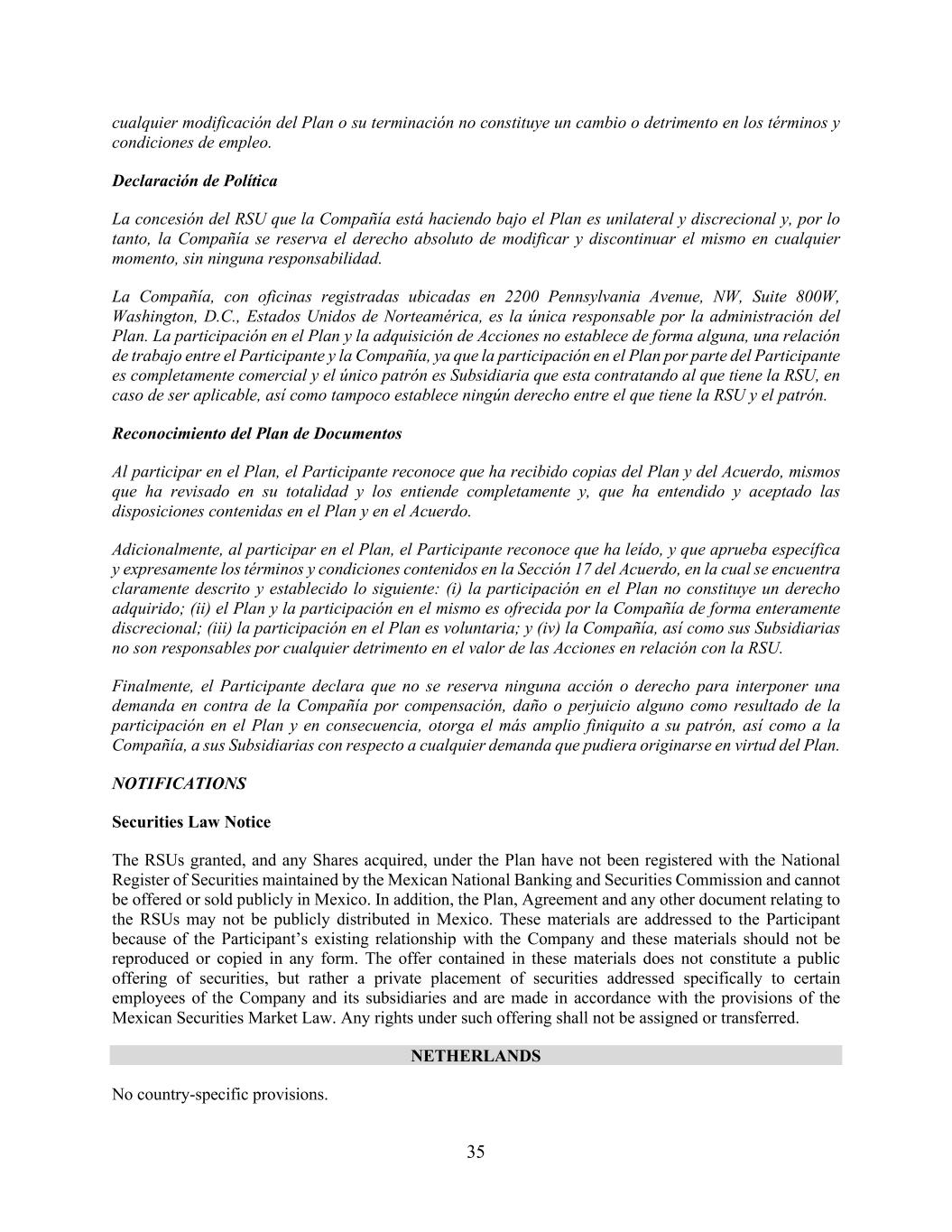 35 cualquier modificación del Plan o su terminación no constituye un cambio o detrimento en los términos y condiciones de empleo. Declaración de Política La concesión del RSU que la Compañía está haciendo bajo el Plan es unilateral y discrecional y, por lo tanto, la Compañía se reserva el derecho absoluto de modificar y discontinuar el mismo en cualquier momento, sin ninguna responsabilidad. La Compañía, con oficinas registradas ubicadas en 2200 Pennsylvania Avenue, NW, Suite 800W, Washington, D.C., Estados Unidos de Norteamérica, es la única responsable por la administración del Plan. La participación en el Plan y la adquisición de Acciones no establece de forma alguna, una relación de trabajo entre el Participante y la Compañía, ya que la participación en el Plan por parte del Participante es completamente comercial y el único patrón es Subsidiaria que esta contratando al que tiene la RSU, en caso de ser aplicable, así como tampoco establece ningún derecho entre el que tiene la RSU y el patrón. Reconocimiento del Plan de Documentos Al participar en el Plan, el Participante reconoce que ha recibido copias del Plan y del Acuerdo, mismos que ha revisado en su totalidad y los entiende completamente y, que ha entendido y aceptado las disposiciones contenidas en el Plan y en el Acuerdo. Adicionalmente, al participar en el Plan, el Participante reconoce que ha leído, y que aprueba específica y expresamente los términos y condiciones contenidos en la Sección 17 del Acuerdo, en la cual se encuentra claramente descrito y establecido lo siguiente: (i) la participación en el Plan no constituye un derecho adquirido; (ii) el Plan y la participación en el mismo es ofrecida por la Compañía de forma enteramente discrecional; (iii) la participación en el Plan es voluntaria; y (iv) la Compañía, así como sus Subsidiarias no son responsables por cualquier detrimento en el valor de las Acciones en relación con la RSU. Finalmente, el Participante declara que no se reserva ninguna acción o derecho para interponer una demanda en contra de la Compañía por compensación, daño o perjuicio alguno como resultado de la participación en el Plan y en consecuencia, otorga el más amplio finiquito a su patrón, así como a la Compañía, a sus Subsidiarias con respecto a cualquier demanda que pudiera originarse en virtud del Plan. NOTIFICATIONS Securities Law Notice The RSUs granted, and any Shares acquired, under the Plan have not been registered with the National Register of Securities maintained by the Mexican National Banking and Securities Commission and cannot be offered or sold publicly in Mexico. In addition, the Plan, Agreement and any other document relating to the RSUs may not be publicly distributed in Mexico. These materials are addressed to the Participant because of the Participant’s existing relationship with the Company and these materials should not be reproduced or copied in any form. The offer contained in these materials does not constitute a public offering of securities, but rather a private placement of securities addressed specifically to certain employees of the Company and its subsidiaries and are made in accordance with the provisions of the Mexican Securities Market Law. Any rights under such offering shall not be assigned or transferred. NETHERLANDS No country-specific provisions.