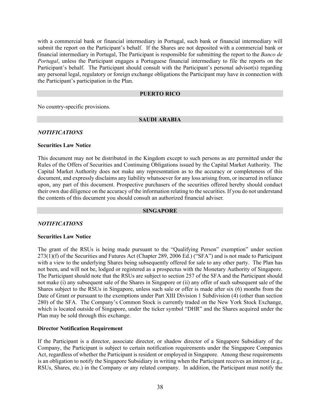 38 with a commercial bank or financial intermediary in Portugal, such bank or financial intermediary will submit the report on the Participant’s behalf. If the Shares are not deposited with a commercial bank or financial intermediary in Portugal, The Participant is responsible for submitting the report to the Banco de Portugal, unless the Participant engages a Portuguese financial intermediary to file the reports on the Participant’s behalf. The Participant should consult with the Participant’s personal advisor(s) regarding any personal legal, regulatory or foreign exchange obligations the Participant may have in connection with the Participant’s participation in the Plan. PUERTO RICO No country-specific provisions. SAUDI ARABIA NOTIFICATIONS Securities Law Notice This document may not be distributed in the Kingdom except to such persons as are permitted under the Rules of the Offers of Securities and Continuing Obligations issued by the Capital Market Authority. The Capital Market Authority does not make any representation as to the accuracy or completeness of this document, and expressly disclaims any liability whatsoever for any loss arising from, or incurred in reliance upon, any part of this document. Prospective purchasers of the securities offered hereby should conduct their own due diligence on the accuracy of the information relating to the securities. If you do not understand the contents of this document you should consult an authorized financial adviser. SINGAPORE NOTIFICATIONS Securities Law Notice The grant of the RSUs is being made pursuant to the “Qualifying Person” exemption” under section 273(1)(f) of the Securities and Futures Act (Chapter 289, 2006 Ed.) (“SFA”) and is not made to Participant with a view to the underlying Shares being subsequently offered for sale to any other party. The Plan has not been, and will not be, lodged or registered as a prospectus with the Monetary Authority of Singapore. The Participant should note that the RSUs are subject to section 257 of the SFA and the Participant should not make (i) any subsequent sale of the Shares in Singapore or (ii) any offer of such subsequent sale of the Shares subject to the RSUs in Singapore, unless such sale or offer is made after six (6) months from the Date of Grant or pursuant to the exemptions under Part XIII Division 1 Subdivision (4) (other than section 280) of the SFA. The Company’s Common Stock is currently traded on the New York Stock Exchange, which is located outside of Singapore, under the ticker symbol “DHR” and the Shares acquired under the Plan may be sold through this exchange. Director Notification Requirement If the Participant is a director, associate director, or shadow director of a Singapore Subsidiary of the Company, the Participant is subject to certain notification requirements under the Singapore Companies Act, regardless of whether the Participant is resident or employed in Singapore. Among these requirements is an obligation to notify the Singapore Subsidiary in writing when the Participant receives an interest (e.g., RSUs, Shares, etc.) in the Company or any related company. In addition, the Participant must notify the