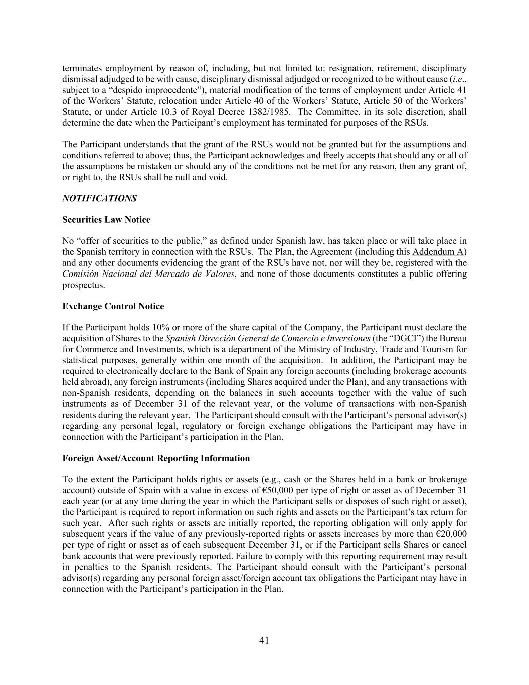 41 terminates employment by reason of, including, but not limited to: resignation, retirement, disciplinary dismissal adjudged to be with cause, disciplinary dismissal adjudged or recognized to be without cause (i.e., subject to a “despido improcedente”), material modification of the terms of employment under Article 41 of the Workers’ Statute, relocation under Article 40 of the Workers’ Statute, Article 50 of the Workers’ Statute, or under Article 10.3 of Royal Decree 1382/1985. The Committee, in its sole discretion, shall determine the date when the Participant’s employment has terminated for purposes of the RSUs. The Participant understands that the grant of the RSUs would not be granted but for the assumptions and conditions referred to above; thus, the Participant acknowledges and freely accepts that should any or all of the assumptions be mistaken or should any of the conditions not be met for any reason, then any grant of, or right to, the RSUs shall be null and void. NOTIFICATIONS Securities Law Notice No “offer of securities to the public,” as defined under Spanish law, has taken place or will take place in the Spanish territory in connection with the RSUs. The Plan, the Agreement (including this Addendum A) and any other documents evidencing the grant of the RSUs have not, nor will they be, registered with the Comisión Nacional del Mercado de Valores, and none of those documents constitutes a public offering prospectus. Exchange Control Notice If the Participant holds 10% or more of the share capital of the Company, the Participant must declare the acquisition of Shares to the Spanish Dirección General de Comercio e Inversiones (the “DGCI”) the Bureau for Commerce and Investments, which is a department of the Ministry of Industry, Trade and Tourism for statistical purposes, generally within one month of the acquisition. In addition, the Participant may be required to electronically declare to the Bank of Spain any foreign accounts (including brokerage accounts held abroad), any foreign instruments (including Shares acquired under the Plan), and any transactions with non-Spanish residents, depending on the balances in such accounts together with the value of such instruments as of December 31 of the relevant year, or the volume of transactions with non-Spanish residents during the relevant year. The Participant should consult with the Participant’s personal advisor(s) regarding any personal legal, regulatory or foreign exchange obligations the Participant may have in connection with the Participant’s participation in the Plan. Foreign Asset/Account Reporting Information To the extent the Participant holds rights or assets (e.g., cash or the Shares held in a bank or brokerage account) outside of Spain with a value in excess of €50,000 per type of right or asset as of December 31 each year (or at any time during the year in which the Participant sells or disposes of such right or asset), the Participant is required to report information on such rights and assets on the Participant’s tax return for such year. After such rights or assets are initially reported, the reporting obligation will only apply for subsequent years if the value of any previously-reported rights or assets increases by more than €20,000 per type of right or asset as of each subsequent December 31, or if the Participant sells Shares or cancel bank accounts that were previously reported. Failure to comply with this reporting requirement may result in penalties to the Spanish residents. The Participant should consult with the Participant’s personal advisor(s) regarding any personal foreign asset/foreign account tax obligations the Participant may have in connection with the Participant’s participation in the Plan.