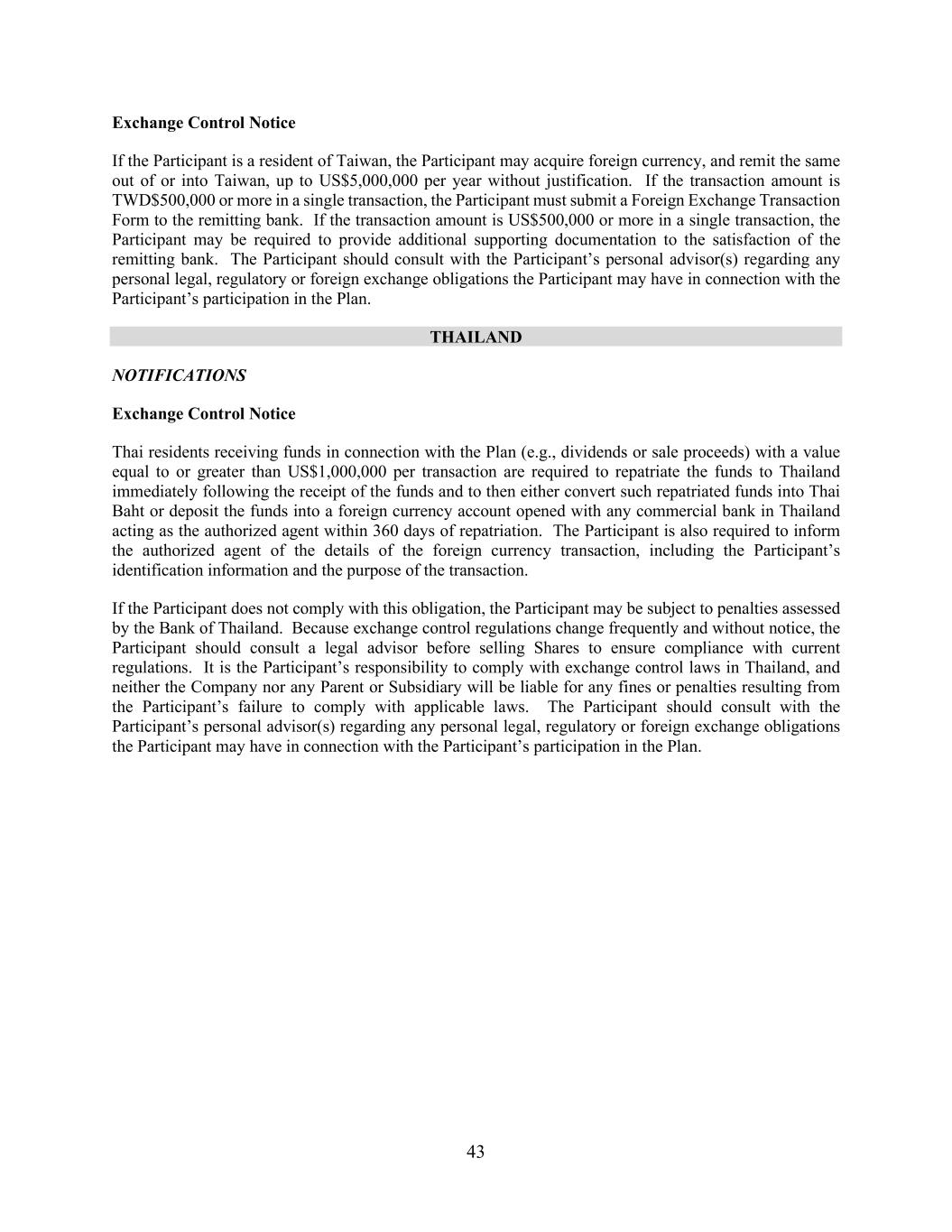 43 Exchange Control Notice If the Participant is a resident of Taiwan, the Participant may acquire foreign currency, and remit the same out of or into Taiwan, up to US$5,000,000 per year without justification. If the transaction amount is TWD$500,000 or more in a single transaction, the Participant must submit a Foreign Exchange Transaction Form to the remitting bank. If the transaction amount is US$500,000 or more in a single transaction, the Participant may be required to provide additional supporting documentation to the satisfaction of the remitting bank. The Participant should consult with the Participant’s personal advisor(s) regarding any personal legal, regulatory or foreign exchange obligations the Participant may have in connection with the Participant’s participation in the Plan. THAILAND NOTIFICATIONS Exchange Control Notice Thai residents receiving funds in connection with the Plan (e.g., dividends or sale proceeds) with a value equal to or greater than US$1,000,000 per transaction are required to repatriate the funds to Thailand immediately following the receipt of the funds and to then either convert such repatriated funds into Thai Baht or deposit the funds into a foreign currency account opened with any commercial bank in Thailand acting as the authorized agent within 360 days of repatriation. The Participant is also required to inform the authorized agent of the details of the foreign currency transaction, including the Participant’s identification information and the purpose of the transaction. If the Participant does not comply with this obligation, the Participant may be subject to penalties assessed by the Bank of Thailand. Because exchange control regulations change frequently and without notice, the Participant should consult a legal advisor before selling Shares to ensure compliance with current regulations. It is the Participant’s responsibility to comply with exchange control laws in Thailand, and neither the Company nor any Parent or Subsidiary will be liable for any fines or penalties resulting from the Participant’s failure to comply with applicable laws. The Participant should consult with the Participant’s personal advisor(s) regarding any personal legal, regulatory or foreign exchange obligations the Participant may have in connection with the Participant’s participation in the Plan.