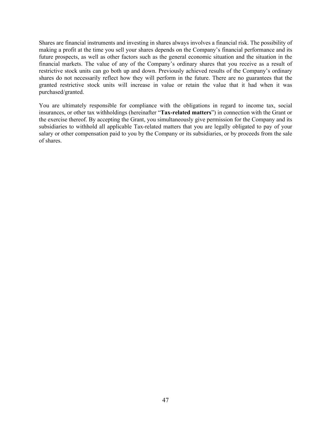 47 Shares are financial instruments and investing in shares always involves a financial risk. The possibility of making a profit at the time you sell your shares depends on the Company’s financial performance and its future prospects, as well as other factors such as the general economic situation and the situation in the financial markets. The value of any of the Company’s ordinary shares that you receive as a result of restrictive stock units can go both up and down. Previously achieved results of the Company’s ordinary shares do not necessarily reflect how they will perform in the future. There are no guarantees that the granted restrictive stock units will increase in value or retain the value that it had when it was purchased/granted. You are ultimately responsible for compliance with the obligations in regard to income tax, social insurances, or other tax withholdings (hereinafter “Tax-related matters”) in connection with the Grant or the exercise thereof. By accepting the Grant, you simultaneously give permission for the Company and its subsidiaries to withhold all applicable Tax-related matters that you are legally obligated to pay of your salary or other compensation paid to you by the Company or its subsidiaries, or by proceeds from the sale of shares.