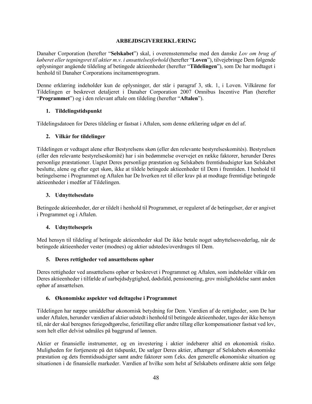 48 ARBEJDSGIVERERKLÆRING Danaher Corporation (herefter “Selskabet”) skal, i overensstemmelse med den danske Lov om brug af køberet eller tegningsret til aktier m.v. i ansættelsesforhold (herefter “Loven”), tilvejebringe Dem følgende oplysninger angående tildeling af betingede aktieenheder (herefter “Tildelingen”), som De har modtaget i henhold til Danaher Corporations incitamentsprogram. Denne erklæring indeholder kun de oplysninger, der står i paragraf 3, stk. 1, i Loven. Vilkårene for Tildelingen er beskrevet detaljeret i Danaher Corporation 2007 Omnibus Incentive Plan (herefter “Programmet”) og i den relevant aftale om tildeling (herefter “Aftalen”). 1. Tildelingstidspunkt Tildelingsdatoen for Deres tildeling er fastsat i Aftalen, som denne erklæring udgør en del af. 2. Vilkår for tildelinger Tildelingen er vedtaget alene efter Bestyrelsens skøn (eller den relevante bestyrelseskomités). Bestyrelsen (eller den relevante bestyrelseskomité) har i sin bedømmelse overvejet en række faktorer, herunder Deres personlige præstationer. Uagtet Deres personlige præstation og Selskabets fremtidsudsigter kan Selskabet beslutte, alene og efter eget skøn, ikke at tildele betingede aktieenheder til Dem i fremtiden. I henhold til betingelserne i Programmet og Aftalen har De hverken ret til eller krav på at modtage fremtidige betingede aktieenheder i medfør af Tildelingen. 3. Udnyttelsesdato Betingede aktieenheder, der er tildelt i henhold til Programmet, er reguleret af de betingelser, der er angivet i Programmet og i Aftalen. 4. Udnyttelsespris Med hensyn til tildeling af betingede aktieenheder skal De ikke betale noget udnyttelsesvederlag, når de betingede aktieenheder vester (modnes) og aktier udstedes/overdrages til Dem. 5. Deres rettigheder ved ansættelsens ophør Deres rettigheder ved ansættelsens ophør er beskrevet i Programmet og Aftalen, som indeholder vilkår om Deres aktieenheder i tilfælde af uarbejdsdygtighed, dødsfald, pensionering, grov misligholdelse samt anden ophør af ansættelsen. 6. Økonomiske aspekter ved deltagelse i Programmet Tildelingen har næppe umiddelbar økonomisk betydning for Dem. Værdien af de rettigheder, som De har under Aftalen, herunder værdien af aktier udstedt i henhold til betingede aktieenheder, tages der ikke hensyn til, når der skal beregnes feriegodtgørelse, ferietillæg eller andre tillæg eller kompensationer fastsat ved lov, som helt eller delvist udmåles på baggrund af lønnen. Aktier er finansielle instrumenter, og en investering i aktier indebærer altid en økonomisk risiko. Muligheden for fortjeneste på det tidspunkt, De sælger Deres aktier, afhænger af Selskabets økonomiske præstation og dets fremtidsudsigter samt andre faktorer som f.eks. den generelle økonomiske situation og situationen i de finansielle markeder. Værdien af hvilke som helst af Selskabets ordinære aktie som følge
