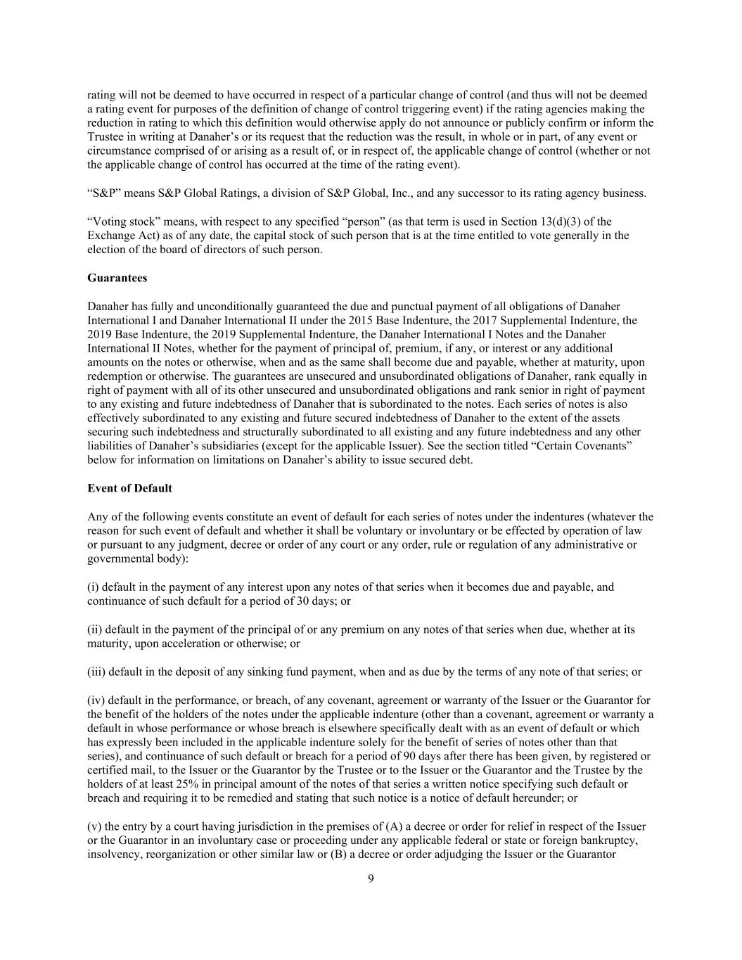9 rating will not be deemed to have occurred in respect of a particular change of control (and thus will not be deemed a rating event for purposes of the definition of change of control triggering event) if the rating agencies making the reduction in rating to which this definition would otherwise apply do not announce or publicly confirm or inform the Trustee in writing at Danaher’s or its request that the reduction was the result, in whole or in part, of any event or circumstance comprised of or arising as a result of, or in respect of, the applicable change of control (whether or not the applicable change of control has occurred at the time of the rating event). “S&P” means S&P Global Ratings, a division of S&P Global, Inc., and any successor to its rating agency business. “Voting stock” means, with respect to any specified “person” (as that term is used in Section 13(d)(3) of the Exchange Act) as of any date, the capital stock of such person that is at the time entitled to vote generally in the election of the board of directors of such person. Guarantees Danaher has fully and unconditionally guaranteed the due and punctual payment of all obligations of Danaher International I and Danaher International II under the 2015 Base Indenture, the 2017 Supplemental Indenture, the 2019 Base Indenture, the 2019 Supplemental Indenture, the Danaher International I Notes and the Danaher International II Notes, whether for the payment of principal of, premium, if any, or interest or any additional amounts on the notes or otherwise, when and as the same shall become due and payable, whether at maturity, upon redemption or otherwise. The guarantees are unsecured and unsubordinated obligations of Danaher, rank equally in right of payment with all of its other unsecured and unsubordinated obligations and rank senior in right of payment to any existing and future indebtedness of Danaher that is subordinated to the notes. Each series of notes is also effectively subordinated to any existing and future secured indebtedness of Danaher to the extent of the assets securing such indebtedness and structurally subordinated to all existing and any future indebtedness and any other liabilities of Danaher’s subsidiaries (except for the applicable Issuer). See the section titled “Certain Covenants” below for information on limitations on Danaher’s ability to issue secured debt. Event of Default Any of the following events constitute an event of default for each series of notes under the indentures (whatever the reason for such event of default and whether it shall be voluntary or involuntary or be effected by operation of law or pursuant to any judgment, decree or order of any court or any order, rule or regulation of any administrative or governmental body): (i) default in the payment of any interest upon any notes of that series when it becomes due and payable, and continuance of such default for a period of 30 days; or (ii) default in the payment of the principal of or any premium on any notes of that series when due, whether at its maturity, upon acceleration or otherwise; or (iii) default in the deposit of any sinking fund payment, when and as due by the terms of any note of that series; or (iv) default in the performance, or breach, of any covenant, agreement or warranty of the Issuer or the Guarantor for the benefit of the holders of the notes under the applicable indenture (other than a covenant, agreement or warranty a default in whose performance or whose breach is elsewhere specifically dealt with as an event of default or which has expressly been included in the applicable indenture solely for the benefit of series of notes other than that series), and continuance of such default or breach for a period of 90 days after there has been given, by registered or certified mail, to the Issuer or the Guarantor by the Trustee or to the Issuer or the Guarantor and the Trustee by the holders of at least 25% in principal amount of the notes of that series a written notice specifying such default or breach and requiring it to be remedied and stating that such notice is a notice of default hereunder; or (v) the entry by a court having jurisdiction in the premises of (A) a decree or order for relief in respect of the Issuer or the Guarantor in an involuntary case or proceeding under any applicable federal or state or foreign bankruptcy, insolvency, reorganization or other similar law or (B) a decree or order adjudging the Issuer or the Guarantor