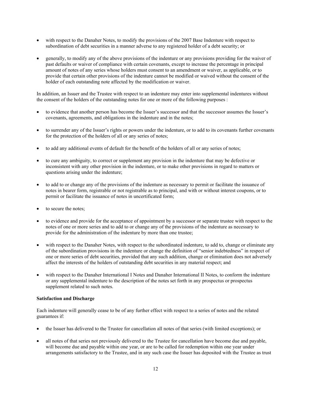 12 • with respect to the Danaher Notes, to modify the provisions of the 2007 Base Indenture with respect to subordination of debt securities in a manner adverse to any registered holder of a debt security; or • generally, to modify any of the above provisions of the indenture or any provisions providing for the waiver of past defaults or waiver of compliance with certain covenants, except to increase the percentage in principal amount of notes of any series whose holders must consent to an amendment or waiver, as applicable, or to provide that certain other provisions of the indenture cannot be modified or waived without the consent of the holder of each outstanding note affected by the modification or waiver. In addition, an Issuer and the Trustee with respect to an indenture may enter into supplemental indentures without the consent of the holders of the outstanding notes for one or more of the following purposes : • to evidence that another person has become the Issuer’s successor and that the successor assumes the Issuer’s covenants, agreements, and obligations in the indenture and in the notes; • to surrender any of the Issuer’s rights or powers under the indenture, or to add to its covenants further covenants for the protection of the holders of all or any series of notes; • to add any additional events of default for the benefit of the holders of all or any series of notes; • to cure any ambiguity, to correct or supplement any provision in the indenture that may be defective or inconsistent with any other provision in the indenture, or to make other provisions in regard to matters or questions arising under the indenture; • to add to or change any of the provisions of the indenture as necessary to permit or facilitate the issuance of notes in bearer form, registrable or not registrable as to principal, and with or without interest coupons, or to permit or facilitate the issuance of notes in uncertificated form; • to secure the notes; • to evidence and provide for the acceptance of appointment by a successor or separate trustee with respect to the notes of one or more series and to add to or change any of the provisions of the indenture as necessary to provide for the administration of the indenture by more than one trustee; • with respect to the Danaher Notes, with respect to the subordinated indenture, to add to, change or eliminate any of the subordination provisions in the indenture or change the definition of “senior indebtedness” in respect of one or more series of debt securities, provided that any such addition, change or elimination does not adversely affect the interests of the holders of outstanding debt securities in any material respect; and • with respect to the Danaher International I Notes and Danaher International II Notes, to conform the indenture or any supplemental indenture to the description of the notes set forth in any prospectus or prospectus supplement related to such notes. Satisfaction and Discharge Each indenture will generally cease to be of any further effect with respect to a series of notes and the related guarantees if: • the Issuer has delivered to the Trustee for cancellation all notes of that series (with limited exceptions); or • all notes of that series not previously delivered to the Trustee for cancellation have become due and payable, will become due and payable within one year, or are to be called for redemption within one year under arrangements satisfactory to the Trustee, and in any such case the Issuer has deposited with the Trustee as trust