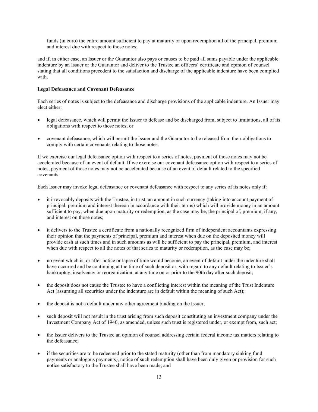 13 funds (in euro) the entire amount sufficient to pay at maturity or upon redemption all of the principal, premium and interest due with respect to those notes; and if, in either case, an Issuer or the Guarantor also pays or causes to be paid all sums payable under the applicable indenture by an Issuer or the Guarantor and deliver to the Trustee an officers’ certificate and opinion of counsel stating that all conditions precedent to the satisfaction and discharge of the applicable indenture have been complied with. Legal Defeasance and Covenant Defeasance Each series of notes is subject to the defeasance and discharge provisions of the applicable indenture. An Issuer may elect either: • legal defeasance, which will permit the Issuer to defease and be discharged from, subject to limitations, all of its obligations with respect to those notes; or • covenant defeasance, which will permit the Issuer and the Guarantor to be released from their obligations to comply with certain covenants relating to those notes. If we exercise our legal defeasance option with respect to a series of notes, payment of those notes may not be accelerated because of an event of default. If we exercise our covenant defeasance option with respect to a series of notes, payment of those notes may not be accelerated because of an event of default related to the specified covenants. Each Issuer may invoke legal defeasance or covenant defeasance with respect to any series of its notes only if: • it irrevocably deposits with the Trustee, in trust, an amount in such currency (taking into account payment of principal, premium and interest thereon in accordance with their terms) which will provide money in an amount sufficient to pay, when due upon maturity or redemption, as the case may be, the principal of, premium, if any, and interest on those notes; • it delivers to the Trustee a certificate from a nationally recognized firm of independent accountants expressing their opinion that the payments of principal, premium and interest when due on the deposited money will provide cash at such times and in such amounts as will be sufficient to pay the principal, premium, and interest when due with respect to all the notes of that series to maturity or redemption, as the case may be; • no event which is, or after notice or lapse of time would become, an event of default under the indenture shall have occurred and be continuing at the time of such deposit or, with regard to any default relating to Issuer’s bankruptcy, insolvency or reorganization, at any time on or prior to the 90th day after such deposit; • the deposit does not cause the Trustee to have a conflicting interest within the meaning of the Trust Indenture Act (assuming all securities under the indenture are in default within the meaning of such Act); • the deposit is not a default under any other agreement binding on the Issuer; • such deposit will not result in the trust arising from such deposit constituting an investment company under the Investment Company Act of 1940, as amended, unless such trust is registered under, or exempt from, such act; • the Issuer delivers to the Trustee an opinion of counsel addressing certain federal income tax matters relating to the defeasance; • if the securities are to be redeemed prior to the stated maturity (other than from mandatory sinking fund payments or analogous payments), notice of such redemption shall have been duly given or provision for such notice satisfactory to the Trustee shall have been made; and