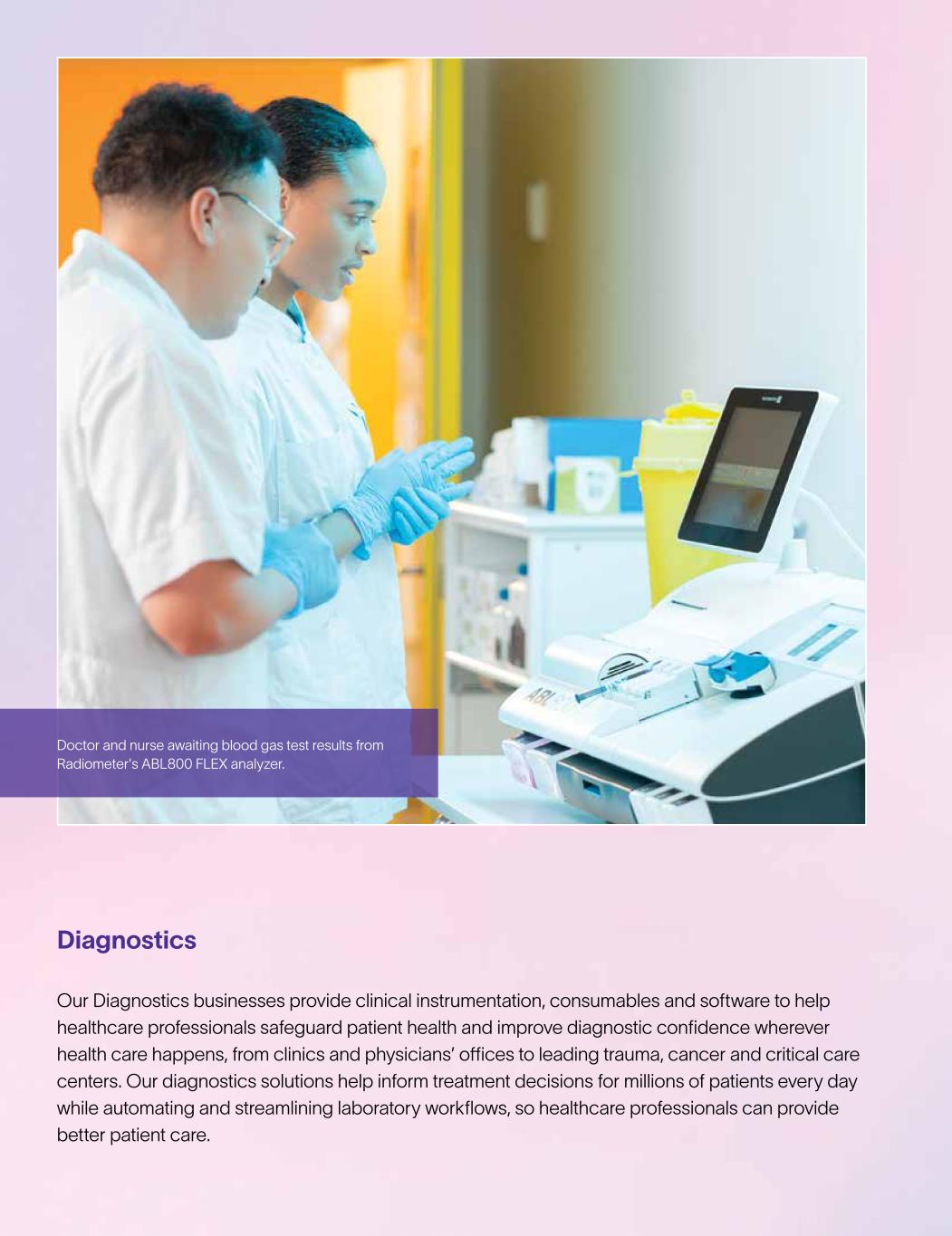 Diagnostics Our Diagnostics businesses provide clinical instrumentation, consumables and software to help healthcare professionals safeguard patient health and improve diagnostic confidence wherever health care happens, from clinics and physicians’ offices to leading trauma, cancer and critical care centers. Our diagnostics solutions help inform treatment decisions for millions of patients every day while automating and streamlining laboratory workflows, so healthcare professionals can provide better patient care. Doctor and nurse awaiting blood gas test results from Radiometer's ABL800 FLEX analyzer.