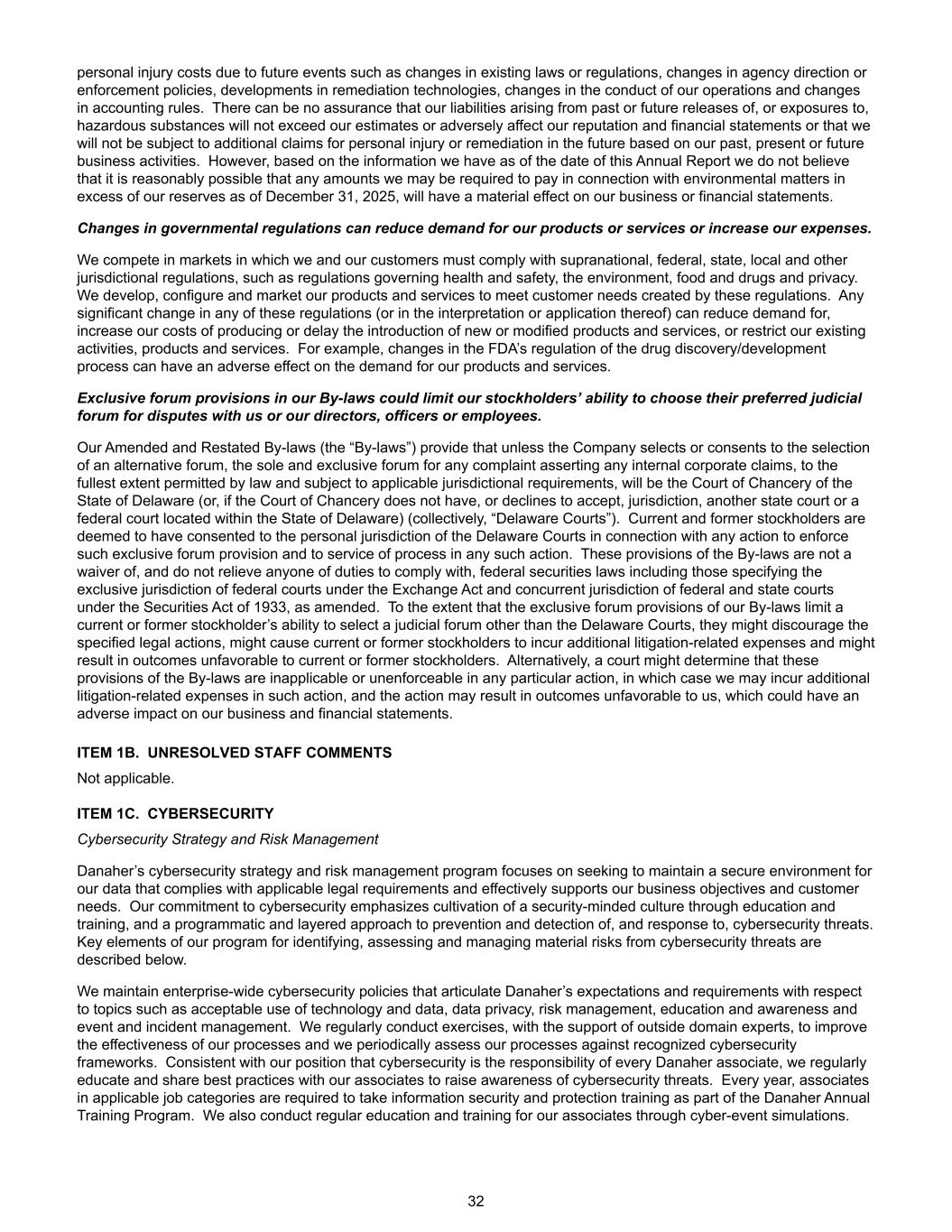 personal injury costs due to future events such as changes in existing laws or regulations, changes in agency direction or enforcement policies, developments in remediation technologies, changes in the conduct of our operations and changes in accounting rules. There can be no assurance that our liabilities arising from past or future releases of, or exposures to, hazardous substances will not exceed our estimates or adversely affect our reputation and financial statements or that we will not be subject to additional claims for personal injury or remediation in the future based on our past, present or future business activities. However, based on the information we have as of the date of this Annual Report we do not believe that it is reasonably possible that any amounts we may be required to pay in connection with environmental matters in excess of our reserves as of December 31, 2025, will have a material effect on our business or financial statements. Changes in governmental regulations can reduce demand for our products or services or increase our expenses. We compete in markets in which we and our customers must comply with supranational, federal, state, local and other jurisdictional regulations, such as regulations governing health and safety, the environment, food and drugs and privacy. We develop, configure and market our products and services to meet customer needs created by these regulations. Any significant change in any of these regulations (or in the interpretation or application thereof) can reduce demand for, increase our costs of producing or delay the introduction of new or modified products and services, or restrict our existing activities, products and services. For example, changes in the FDA’s regulation of the drug discovery/development process can have an adverse effect on the demand for our products and services. Exclusive forum provisions in our By-laws could limit our stockholders’ ability to choose their preferred judicial forum for disputes with us or our directors, officers or employees. Our Amended and Restated By-laws (the “By-laws”) provide that unless the Company selects or consents to the selection of an alternative forum, the sole and exclusive forum for any complaint asserting any internal corporate claims, to the fullest extent permitted by law and subject to applicable jurisdictional requirements, will be the Court of Chancery of the State of Delaware (or, if the Court of Chancery does not have, or declines to accept, jurisdiction, another state court or a federal court located within the State of Delaware) (collectively, “Delaware Courts”). Current and former stockholders are deemed to have consented to the personal jurisdiction of the Delaware Courts in connection with any action to enforce such exclusive forum provision and to service of process in any such action. These provisions of the By-laws are not a waiver of, and do not relieve anyone of duties to comply with, federal securities laws including those specifying the exclusive jurisdiction of federal courts under the Exchange Act and concurrent jurisdiction of federal and state courts under the Securities Act of 1933, as amended. To the extent that the exclusive forum provisions of our By-laws limit a current or former stockholder’s ability to select a judicial forum other than the Delaware Courts, they might discourage the specified legal actions, might cause current or former stockholders to incur additional litigation-related expenses and might result in outcomes unfavorable to current or former stockholders. Alternatively, a court might determine that these provisions of the By-laws are inapplicable or unenforceable in any particular action, in which case we may incur additional litigation-related expenses in such action, and the action may result in outcomes unfavorable to us, which could have an adverse impact on our business and financial statements. ITEM 1B. UNRESOLVED STAFF COMMENTS Not applicable. ITEM 1C. CYBERSECURITY Cybersecurity Strategy and Risk Management Danaher’s cybersecurity strategy and risk management program focuses on seeking to maintain a secure environment for our data that complies with applicable legal requirements and effectively supports our business objectives and customer needs. Our commitment to cybersecurity emphasizes cultivation of a security-minded culture through education and training, and a programmatic and layered approach to prevention and detection of, and response to, cybersecurity threats. Key elements of our program for identifying, assessing and managing material risks from cybersecurity threats are described below. We maintain enterprise-wide cybersecurity policies that articulate Danaher’s expectations and requirements with respect to topics such as acceptable use of technology and data, data privacy, risk management, education and awareness and event and incident management. We regularly conduct exercises, with the support of outside domain experts, to improve the effectiveness of our processes and we periodically assess our processes against recognized cybersecurity frameworks. Consistent with our position that cybersecurity is the responsibility of every Danaher associate, we regularly educate and share best practices with our associates to raise awareness of cybersecurity threats. Every year, associates in applicable job categories are required to take information security and protection training as part of the Danaher Annual Training Program. We also conduct regular education and training for our associates through cyber-event simulations. 32
