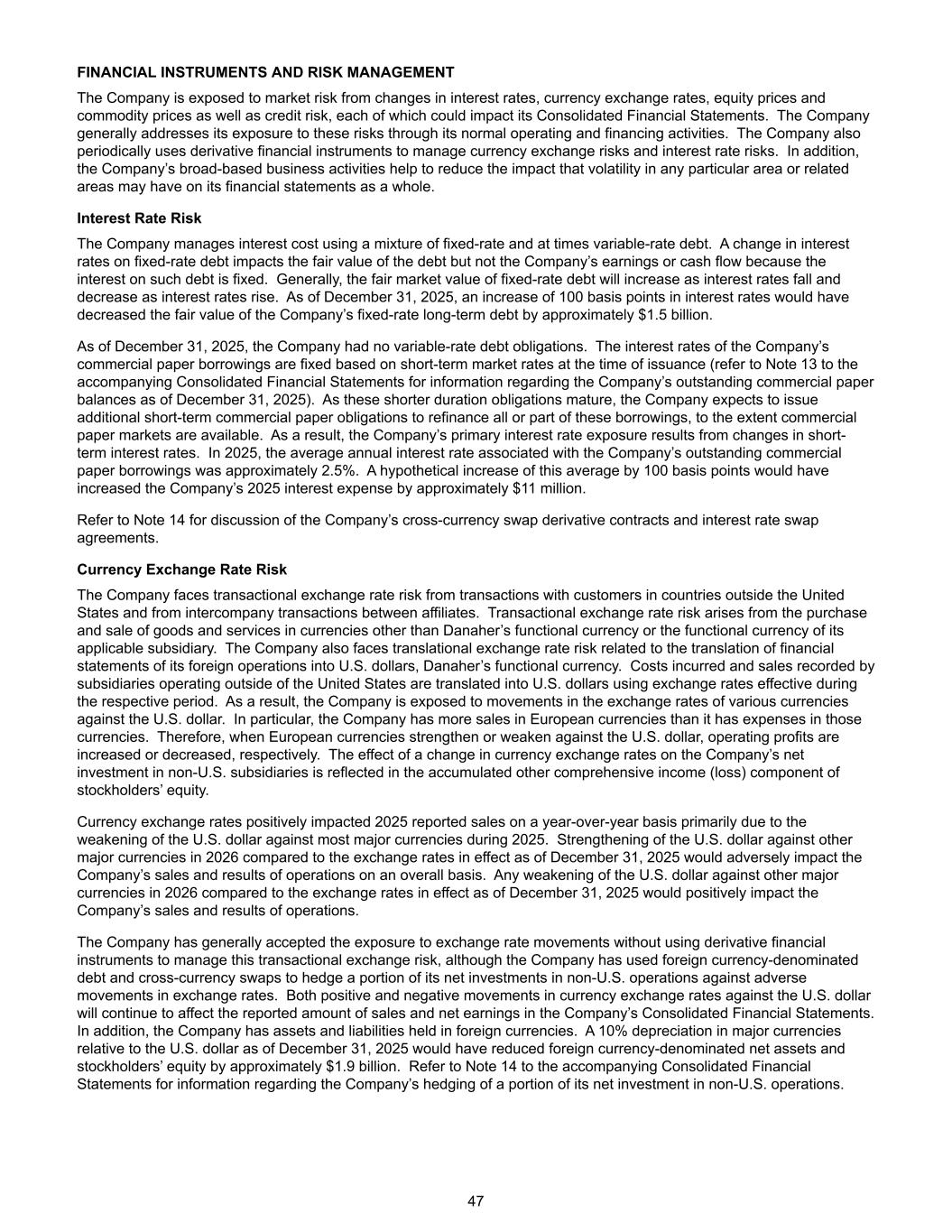FINANCIAL INSTRUMENTS AND RISK MANAGEMENT The Company is exposed to market risk from changes in interest rates, currency exchange rates, equity prices and commodity prices as well as credit risk, each of which could impact its Consolidated Financial Statements. The Company generally addresses its exposure to these risks through its normal operating and financing activities. The Company also periodically uses derivative financial instruments to manage currency exchange risks and interest rate risks. In addition, the Company’s broad-based business activities help to reduce the impact that volatility in any particular area or related areas may have on its financial statements as a whole. Interest Rate Risk The Company manages interest cost using a mixture of fixed-rate and at times variable-rate debt. A change in interest rates on fixed-rate debt impacts the fair value of the debt but not the Company’s earnings or cash flow because the interest on such debt is fixed. Generally, the fair market value of fixed-rate debt will increase as interest rates fall and decrease as interest rates rise. As of December 31, 2025, an increase of 100 basis points in interest rates would have decreased the fair value of the Company’s fixed-rate long-term debt by approximately $1.5 billion. As of December 31, 2025, the Company had no variable-rate debt obligations. The interest rates of the Company’s commercial paper borrowings are fixed based on short-term market rates at the time of issuance (refer to Note 13 to the accompanying Consolidated Financial Statements for information regarding the Company’s outstanding commercial paper balances as of December 31, 2025). As these shorter duration obligations mature, the Company expects to issue additional short-term commercial paper obligations to refinance all or part of these borrowings, to the extent commercial paper markets are available. As a result, the Company’s primary interest rate exposure results from changes in short- term interest rates. In 2025, the average annual interest rate associated with the Company’s outstanding commercial paper borrowings was approximately 2.5%. A hypothetical increase of this average by 100 basis points would have increased the Company’s 2025 interest expense by approximately $11 million. Refer to Note 14 for discussion of the Company’s cross-currency swap derivative contracts and interest rate swap agreements. Currency Exchange Rate Risk The Company faces transactional exchange rate risk from transactions with customers in countries outside the United States and from intercompany transactions between affiliates. Transactional exchange rate risk arises from the purchase and sale of goods and services in currencies other than Danaher’s functional currency or the functional currency of its applicable subsidiary. The Company also faces translational exchange rate risk related to the translation of financial statements of its foreign operations into U.S. dollars, Danaher’s functional currency. Costs incurred and sales recorded by subsidiaries operating outside of the United States are translated into U.S. dollars using exchange rates effective during the respective period. As a result, the Company is exposed to movements in the exchange rates of various currencies against the U.S. dollar. In particular, the Company has more sales in European currencies than it has expenses in those currencies. Therefore, when European currencies strengthen or weaken against the U.S. dollar, operating profits are increased or decreased, respectively. The effect of a change in currency exchange rates on the Company’s net investment in non-U.S. subsidiaries is reflected in the accumulated other comprehensive income (loss) component of stockholders’ equity. Currency exchange rates positively impacted 2025 reported sales on a year-over-year basis primarily due to the weakening of the U.S. dollar against most major currencies during 2025. Strengthening of the U.S. dollar against other major currencies in 2026 compared to the exchange rates in effect as of December 31, 2025 would adversely impact the Company’s sales and results of operations on an overall basis. Any weakening of the U.S. dollar against other major currencies in 2026 compared to the exchange rates in effect as of December 31, 2025 would positively impact the Company’s sales and results of operations. The Company has generally accepted the exposure to exchange rate movements without using derivative financial instruments to manage this transactional exchange risk, although the Company has used foreign currency-denominated debt and cross-currency swaps to hedge a portion of its net investments in non-U.S. operations against adverse movements in exchange rates. Both positive and negative movements in currency exchange rates against the U.S. dollar will continue to affect the reported amount of sales and net earnings in the Company’s Consolidated Financial Statements. In addition, the Company has assets and liabilities held in foreign currencies. A 10% depreciation in major currencies relative to the U.S. dollar as of December 31, 2025 would have reduced foreign currency-denominated net assets and stockholders’ equity by approximately $1.9 billion. Refer to Note 14 to the accompanying Consolidated Financial Statements for information regarding the Company’s hedging of a portion of its net investment in non-U.S. operations. 47