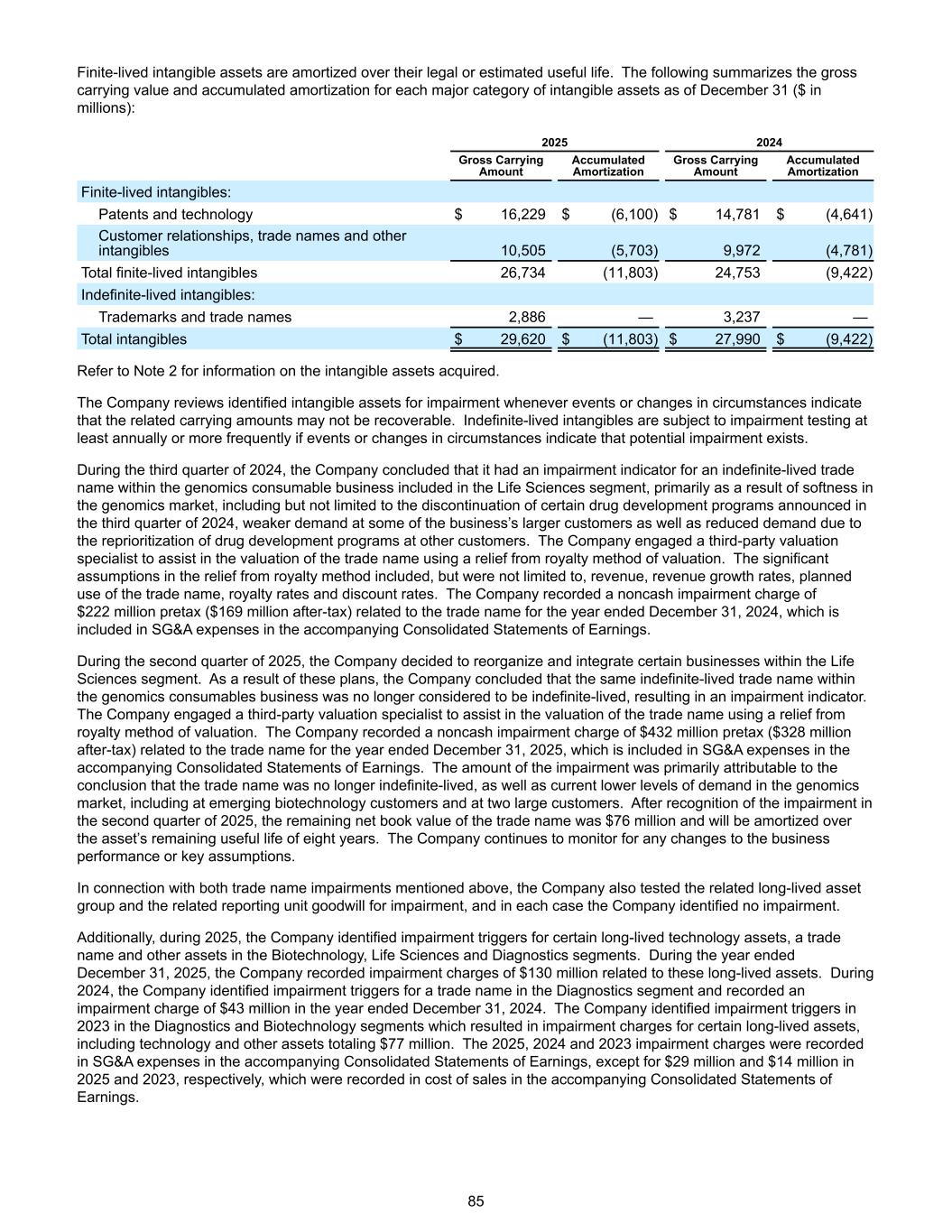 Finite-lived intangible assets are amortized over their legal or estimated useful life. The following summarizes the gross carrying value and accumulated amortization for each major category of intangible assets as of December 31 ($ in millions): 2025 2024 Gross Carrying Amount Accumulated Amortization Gross Carrying Amount Accumulated Amortization Finite-lived intangibles: Patents and technology $ 16,229 $ (6,100) $ 14,781 $ (4,641) Customer relationships, trade names and other intangibles 10,505 (5,703) 9,972 (4,781) Total finite-lived intangibles 26,734 (11,803) 24,753 (9,422) Indefinite-lived intangibles: Trademarks and trade names 2,886 — 3,237 — Total intangibles $ 29,620 $ (11,803) $ 27,990 $ (9,422) Refer to Note 2 for information on the intangible assets acquired. The Company reviews identified intangible assets for impairment whenever events or changes in circumstances indicate that the related carrying amounts may not be recoverable. Indefinite-lived intangibles are subject to impairment testing at least annually or more frequently if events or changes in circumstances indicate that potential impairment exists. During the third quarter of 2024, the Company concluded that it had an impairment indicator for an indefinite-lived trade name within the genomics consumable business included in the Life Sciences segment, primarily as a result of softness in the genomics market, including but not limited to the discontinuation of certain drug development programs announced in the third quarter of 2024, weaker demand at some of the business’s larger customers as well as reduced demand due to the reprioritization of drug development programs at other customers. The Company engaged a third-party valuation specialist to assist in the valuation of the trade name using a relief from royalty method of valuation. The significant assumptions in the relief from royalty method included, but were not limited to, revenue, revenue growth rates, planned use of the trade name, royalty rates and discount rates. The Company recorded a noncash impairment charge of $222 million pretax ($169 million after-tax) related to the trade name for the year ended December 31, 2024, which is included in SG&A expenses in the accompanying Consolidated Statements of Earnings. During the second quarter of 2025, the Company decided to reorganize and integrate certain businesses within the Life Sciences segment. As a result of these plans, the Company concluded that the same indefinite-lived trade name within the genomics consumables business was no longer considered to be indefinite-lived, resulting in an impairment indicator. The Company engaged a third-party valuation specialist to assist in the valuation of the trade name using a relief from royalty method of valuation. The Company recorded a noncash impairment charge of $432 million pretax ($328 million after-tax) related to the trade name for the year ended December 31, 2025, which is included in SG&A expenses in the accompanying Consolidated Statements of Earnings. The amount of the impairment was primarily attributable to the conclusion that the trade name was no longer indefinite-lived, as well as current lower levels of demand in the genomics market, including at emerging biotechnology customers and at two large customers. After recognition of the impairment in the second quarter of 2025, the remaining net book value of the trade name was $76 million and will be amortized over the asset’s remaining useful life of eight years. The Company continues to monitor for any changes to the business performance or key assumptions. In connection with both trade name impairments mentioned above, the Company also tested the related long-lived asset group and the related reporting unit goodwill for impairment, and in each case the Company identified no impairment. Additionally, during 2025, the Company identified impairment triggers for certain long-lived technology assets, a trade name and other assets in the Biotechnology, Life Sciences and Diagnostics segments. During the year ended December 31, 2025, the Company recorded impairment charges of $130 million related to these long-lived assets. During 2024, the Company identified impairment triggers for a trade name in the Diagnostics segment and recorded an impairment charge of $43 million in the year ended December 31, 2024. The Company identified impairment triggers in 2023 in the Diagnostics and Biotechnology segments which resulted in impairment charges for certain long-lived assets, including technology and other assets totaling $77 million. The 2025, 2024 and 2023 impairment charges were recorded in SG&A expenses in the accompanying Consolidated Statements of Earnings, except for $29 million and $14 million in 2025 and 2023, respectively, which were recorded in cost of sales in the accompanying Consolidated Statements of Earnings. 85
