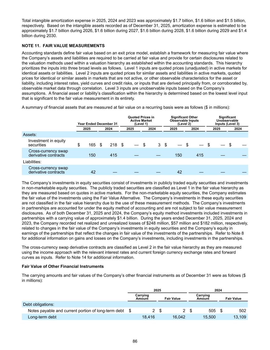 Total intangible amortization expense in 2025, 2024 and 2023 was approximately $1.7 billion, $1.6 billion and $1.5 billion, respectively. Based on the intangible assets recorded as of December 31, 2025, amortization expense is estimated to be approximately $1.7 billion during 2026, $1.6 billion during 2027, $1.6 billion during 2028, $1.6 billion during 2029 and $1.4 billion during 2030. NOTE 11. FAIR VALUE MEASUREMENTS Accounting standards define fair value based on an exit price model, establish a framework for measuring fair value where the Company’s assets and liabilities are required to be carried at fair value and provide for certain disclosures related to the valuation methods used within a valuation hierarchy as established within the accounting standards. This hierarchy prioritizes the inputs into three broad levels as follows. Level 1 inputs are quoted prices (unadjusted) in active markets for identical assets or liabilities. Level 2 inputs are quoted prices for similar assets and liabilities in active markets, quoted prices for identical or similar assets in markets that are not active, or other observable characteristics for the asset or liability, including interest rates, yield curves and credit risks, or inputs that are derived principally from, or corroborated by, observable market data through correlation. Level 3 inputs are unobservable inputs based on the Company’s assumptions. A financial asset or liability’s classification within the hierarchy is determined based on the lowest level input that is significant to the fair value measurement in its entirety. A summary of financial assets that are measured at fair value on a recurring basis were as follows ($ in millions): Year Ended December 31 Quoted Prices in Active Market (Level 1) Significant Other Observable Inputs (Level 2) Significant Unobservable Inputs (Level 3) 2025 2024 2025 2024 2025 2024 2025 2024 Assets: Investment in equity securities $ 165 $ 218 $ — $ 3 $ — $ — $ — $ — Cross-currency swap derivative contracts 150 415 — — 150 415 — — Liabilities: Cross-currency swap derivative contracts 42 — — — 42 — — — The Company’s investments in equity securities consist of investments in publicly traded equity securities and investments in non-marketable equity securities. The publicly traded securities are classified as Level 1 in the fair value hierarchy as they are measured based on quotes in active markets. For the non-marketable equity securities, the Company estimates the fair value of the investments using the Fair Value Alternative. The Company’s investments in these equity securities are not classified in the fair value hierarchy due to the use of these measurement methods. The Company’s investments in partnerships are accounted for under the equity method of accounting and are not subject to fair value measurement disclosures. As of both December 31, 2025 and 2024, the Company’s equity method investments included investments in partnerships with a carrying value of approximately $1.4 billion. During the years ended December 31, 2025, 2024 and 2023, the Company recorded net realized and unrealized losses of $248 million, $57 million and $182 million, respectively, related to changes in the fair value of the Company’s investments in equity securities and the Company’s equity in earnings of the partnerships that reflect the changes in fair value of the investments of the partnerships. Refer to Note 8 for additional information on gains and losses on the Company’s investments, including investments in the partnerships. The cross-currency swap derivative contracts are classified as Level 2 in the fair value hierarchy as they are measured using the income approach with the relevant interest rates and current foreign currency exchange rates and forward curves as inputs. Refer to Note 14 for additional information. Fair Value of Other Financial Instruments The carrying amounts and fair values of the Company’s other financial instruments as of December 31 were as follows ($ in millions): 2025 2024 Carrying Amount Fair Value Carrying Amount Fair Value Debt obligations: Notes payable and current portion of long-term debt $ 2 $ 2 $ 505 $ 502 Long-term debt 18,416 16,042 15,500 13,109 86