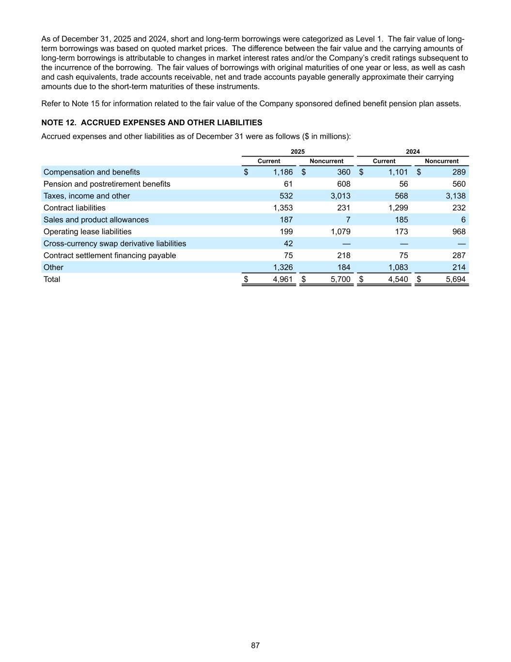 As of December 31, 2025 and 2024, short and long-term borrowings were categorized as Level 1. The fair value of long- term borrowings was based on quoted market prices. The difference between the fair value and the carrying amounts of long-term borrowings is attributable to changes in market interest rates and/or the Company’s credit ratings subsequent to the incurrence of the borrowing. The fair values of borrowings with original maturities of one year or less, as well as cash and cash equivalents, trade accounts receivable, net and trade accounts payable generally approximate their carrying amounts due to the short-term maturities of these instruments. Refer to Note 15 for information related to the fair value of the Company sponsored defined benefit pension plan assets. NOTE 12. ACCRUED EXPENSES AND OTHER LIABILITIES Accrued expenses and other liabilities as of December 31 were as follows ($ in millions): 2025 2024 Current Noncurrent Current Noncurrent Compensation and benefits $ 1,186 $ 360 $ 1,101 $ 289 Pension and postretirement benefits 61 608 56 560 Taxes, income and other 532 3,013 568 3,138 Contract liabilities 1,353 231 1,299 232 Sales and product allowances 187 7 185 6 Operating lease liabilities 199 1,079 173 968 Cross-currency swap derivative liabilities 42 — — — Contract settlement financing payable 75 218 75 287 Other 1,326 184 1,083 214 Total $ 4,961 $ 5,700 $ 4,540 $ 5,694 87