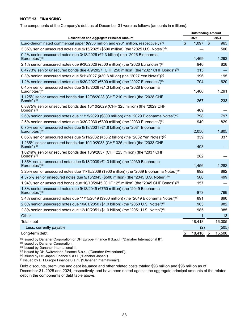 NOTE 13. FINANCING The components of the Company’s debt as of December 31 were as follows (amounts in millions): Outstanding Amount Description and Aggregate Principal Amount 2025 2024 Euro-denominated commercial paper (€933 million and €931 million, respectively)(a) $ 1,097 $ 965 3.35% senior unsecured notes due 9/15/2025 ($500 million) (the “2025 U.S. Notes”)(b) — 500 0.2% senior unsecured notes due 3/18/2026 (€1.3 billion) (the “2026 Biopharma Euronotes”)(c) 1,469 1,293 2.1% senior unsecured notes due 9/30/2026 (€800 million) (the “2026 Euronotes”)(b) 940 828 0.4773% senior unsecured bonds due 4/9/2027 (CHF 250 million) (the “2027 CHF Bonds”)(d) 315 — 0.3% senior unsecured notes due 5/11/2027 (¥30.8 billion) (the “2027 Yen Notes”)(e) 196 195 1.2% senior unsecured notes due 6/30/2027 (€600 million) (the “2027 Euronotes”)(f) 704 620 0.45% senior unsecured notes due 3/18/2028 (€1.3 billion) (the “2028 Biopharma Euronotes”)(c) 1,466 1,291 1.125% senior unsecured bonds due 12/08/2028 (CHF 210 million) (the “2028 CHF Bonds”)(d) 267 233 0.8875% senior unsecured bonds due 10/10/2029 (CHF 325 million) (the “2029 CHF Bonds”)(d) 409 — 2.6% senior unsecured notes due 11/15/2029 ($800 million) (the “2029 Biopharma Notes”)(c) 798 797 2.5% senior unsecured notes due 3/30/2030 (€800 million) (the “2030 Euronotes”)(b) 940 829 0.75% senior unsecured notes due 9/18/2031 (€1.8 billion) (the “2031 Biopharma Euronotes”)(c) 2,050 1,805 0.65% senior unsecured notes due 5/11/2032 (¥53.2 billion) (the “2032 Yen Notes”)(e) 339 337 1.265% senior unsecured bonds due 10/10/2033 (CHF 325 million) (the “2033 CHF Bonds”)(d) 408 — 1.6249% senior unsecured bonds due 10/9/2037 (CHF 225 million) (the “2037 CHF Bonds”)(d) 282 — 1.35% senior unsecured notes due 9/18/2039 (€1.3 billion) (the “2039 Biopharma Euronotes”)(c) 1,456 1,282 3.25% senior unsecured notes due 11/15/2039 ($900 million) (the “2039 Biopharma Notes”)(c) 892 892 4.375% senior unsecured notes due 9/15/2045 ($500 million) (the “2045 U.S. Notes”)(b) 500 499 1.94% senior unsecured bonds due 10/10/2045 (CHF 125 million) (the “2045 CHF Bonds”)(d) 157 — 1.8% senior unsecured notes due 9/18/2049 (€750 million) (the “2049 Biopharma Euronotes”)(c) 873 769 3.4% senior unsecured notes due 11/15/2049 ($900 million) (the “2049 Biopharma Notes”)(c) 891 890 2.6% senior unsecured notes due 10/01/2050 ($1.0 billion) (the “2050 U.S. Notes”)(b) 983 982 2.8% senior unsecured notes due 12/10/2051 ($1.0 billion) (the “2051 U.S. Notes”)(b) 985 985 Other 1 13 Total debt 18,418 16,005 Less: currently payable (2) (505) Long-term debt $ 18,416 $ 15,500 (a) Issued by Danaher Corporation or DH Europe Finance II S.a.r.l. (“Danaher International II”). (b) Issued by Danaher Corporation. (c) Issued by Danaher International II. (d) Issued by DH Switzerland Finance S.a.r.l. (“Danaher Switzerland”). (e) Issued by DH Japan Finance S.a.r.l. (“Danaher Japan”). (f) Issued by DH Europe Finance S.a.r.l. (“Danaher International”). Debt discounts, premiums and debt issuance and other related costs totaled $93 million and $96 million as of December 31, 2025 and 2024, respectively, and have been netted against the aggregate principal amounts of the related debt in the components of debt table above. 88