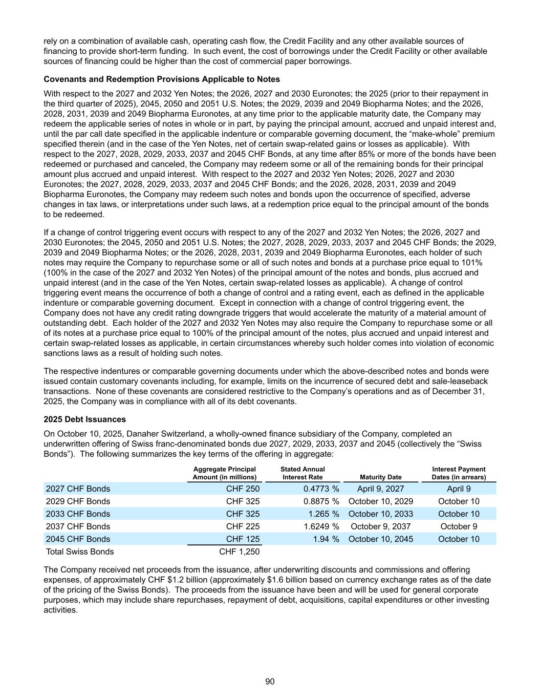 rely on a combination of available cash, operating cash flow, the Credit Facility and any other available sources of financing to provide short-term funding. In such event, the cost of borrowings under the Credit Facility or other available sources of financing could be higher than the cost of commercial paper borrowings. Covenants and Redemption Provisions Applicable to Notes With respect to the 2027 and 2032 Yen Notes; the 2026, 2027 and 2030 Euronotes; the 2025 (prior to their repayment in the third quarter of 2025), 2045, 2050 and 2051 U.S. Notes; the 2029, 2039 and 2049 Biopharma Notes; and the 2026, 2028, 2031, 2039 and 2049 Biopharma Euronotes, at any time prior to the applicable maturity date, the Company may redeem the applicable series of notes in whole or in part, by paying the principal amount, accrued and unpaid interest and, until the par call date specified in the applicable indenture or comparable governing document, the “make-whole” premium specified therein (and in the case of the Yen Notes, net of certain swap-related gains or losses as applicable). With respect to the 2027, 2028, 2029, 2033, 2037 and 2045 CHF Bonds, at any time after 85% or more of the bonds have been redeemed or purchased and canceled, the Company may redeem some or all of the remaining bonds for their principal amount plus accrued and unpaid interest. With respect to the 2027 and 2032 Yen Notes; 2026, 2027 and 2030 Euronotes; the 2027, 2028, 2029, 2033, 2037 and 2045 CHF Bonds; and the 2026, 2028, 2031, 2039 and 2049 Biopharma Euronotes, the Company may redeem such notes and bonds upon the occurrence of specified, adverse changes in tax laws, or interpretations under such laws, at a redemption price equal to the principal amount of the bonds to be redeemed. If a change of control triggering event occurs with respect to any of the 2027 and 2032 Yen Notes; the 2026, 2027 and 2030 Euronotes; the 2045, 2050 and 2051 U.S. Notes; the 2027, 2028, 2029, 2033, 2037 and 2045 CHF Bonds; the 2029, 2039 and 2049 Biopharma Notes; or the 2026, 2028, 2031, 2039 and 2049 Biopharma Euronotes, each holder of such notes may require the Company to repurchase some or all of such notes and bonds at a purchase price equal to 101% (100% in the case of the 2027 and 2032 Yen Notes) of the principal amount of the notes and bonds, plus accrued and unpaid interest (and in the case of the Yen Notes, certain swap-related losses as applicable). A change of control triggering event means the occurrence of both a change of control and a rating event, each as defined in the applicable indenture or comparable governing document. Except in connection with a change of control triggering event, the Company does not have any credit rating downgrade triggers that would accelerate the maturity of a material amount of outstanding debt. Each holder of the 2027 and 2032 Yen Notes may also require the Company to repurchase some or all of its notes at a purchase price equal to 100% of the principal amount of the notes, plus accrued and unpaid interest and certain swap-related losses as applicable, in certain circumstances whereby such holder comes into violation of economic sanctions laws as a result of holding such notes. The respective indentures or comparable governing documents under which the above-described notes and bonds were issued contain customary covenants including, for example, limits on the incurrence of secured debt and sale-leaseback transactions. None of these covenants are considered restrictive to the Company’s operations and as of December 31, 2025, the Company was in compliance with all of its debt covenants. 2025 Debt Issuances On October 10, 2025, Danaher Switzerland, a wholly-owned finance subsidiary of the Company, completed an underwritten offering of Swiss franc-denominated bonds due 2027, 2029, 2033, 2037 and 2045 (collectively the “Swiss Bonds”). The following summarizes the key terms of the offering in aggregate: Aggregate Principal Amount (in millions) Stated Annual Interest Rate Maturity Date Interest Payment Dates (in arrears) 2027 CHF Bonds CHF 250 0.4773 % April 9, 2027 April 9 2029 CHF Bonds CHF 325 0.8875 % October 10, 2029 October 10 2033 CHF Bonds CHF 325 1.265 % October 10, 2033 October 10 2037 CHF Bonds CHF 225 1.6249 % October 9, 2037 October 9 2045 CHF Bonds CHF 125 1.94 % October 10, 2045 October 10 Total Swiss Bonds CHF 1,250 The Company received net proceeds from the issuance, after underwriting discounts and commissions and offering expenses, of approximately CHF $1.2 billion (approximately $1.6 billion based on currency exchange rates as of the date of the pricing of the Swiss Bonds). The proceeds from the issuance have been and will be used for general corporate purposes, which may include share repurchases, repayment of debt, acquisitions, capital expenditures or other investing activities. 90