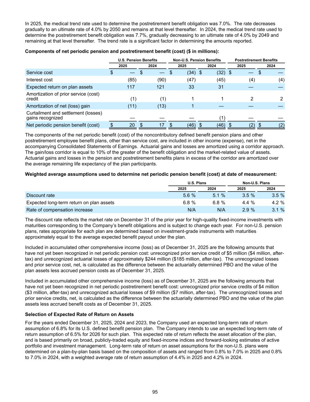 In 2025, the medical trend rate used to determine the postretirement benefit obligation was 7.0%. The rate decreases gradually to an ultimate rate of 4.0% by 2050 and remains at that level thereafter. In 2024, the medical trend rate used to determine the postretirement benefit obligation was 7.7%, gradually decreasing to an ultimate rate of 4.0% by 2049 and remaining at that level thereafter. The trend rate is a significant factor in determining the amounts reported. Components of net periodic pension and postretirement benefit (cost) ($ in millions): U.S. Pension Benefits Non-U.S. Pension Benefits Postretirement Benefits 2025 2024 2025 2024 2025 2024 Service cost $ — $ — $ (34) $ (32) $ — $ — Interest cost (85) (90) (47) (45) (4) (4) Expected return on plan assets 117 121 33 31 — — Amortization of prior service (cost) credit (1) (1) 1 1 2 2 Amortization of net (loss) gain (11) (13) 1 — — — Curtailment and settlement (losses) gains recognized — — — (1) — — Net periodic pension benefit (cost) $ 20 $ 17 $ (46) $ (46) $ (2) $ (2) The components of the net periodic benefit (cost) of the noncontributory defined benefit pension plans and other postretirement employee benefit plans, other than service cost, are included in other income (expense), net in the accompanying Consolidated Statements of Earnings. Actuarial gains and losses are amortized using a corridor approach. The gain/loss corridor is equal to 10% of the greater of the benefit obligation and the market-related value of assets. Actuarial gains and losses in the pension and postretirement benefits plans in excess of the corridor are amortized over the average remaining life expectancy of the plan participants. Weighted average assumptions used to determine net periodic pension benefit (cost) at date of measurement: U.S. Plans Non-U.S. Plans 2025 2024 2025 2024 Discount rate 5.6 % 5.1 % 3.5 % 3.5 % Expected long-term return on plan assets 6.8 % 6.8 % 4.4 % 4.2 % Rate of compensation increase N/A N/A 2.9 % 3.1 % The discount rate reflects the market rate on December 31 of the prior year for high-quality fixed-income investments with maturities corresponding to the Company’s benefit obligations and is subject to change each year. For non-U.S. pension plans, rates appropriate for each plan are determined based on investment-grade instruments with maturities approximately equal to the average expected benefit payout under the plan. Included in accumulated other comprehensive income (loss) as of December 31, 2025 are the following amounts that have not yet been recognized in net periodic pension cost: unrecognized prior service credit of $5 million ($4 million, after- tax) and unrecognized actuarial losses of approximately $244 million ($185 million, after-tax). The unrecognized losses and prior service cost, net, is calculated as the difference between the actuarially determined PBO and the value of the plan assets less accrued pension costs as of December 31, 2025. Included in accumulated other comprehensive income (loss) as of December 31, 2025 are the following amounts that have not yet been recognized in net periodic postretirement benefit cost: unrecognized prior service credits of $4 million ($3 million, after-tax) and unrecognized actuarial losses of $9 million ($7 million, after-tax). The unrecognized losses and prior service credits, net, is calculated as the difference between the actuarially determined PBO and the value of the plan assets less accrued benefit costs as of December 31, 2025. Selection of Expected Rate of Return on Assets For the years ended December 31, 2025, 2024 and 2023, the Company used an expected long-term rate of return assumption of 6.8% for its U.S. defined benefit pension plan. The Company intends to use an expected long-term rate of return assumption of 6.5% for 2026 for such plan. This expected rate of return reflects the asset allocation of the plan, and is based primarily on broad, publicly-traded equity and fixed-income indices and forward-looking estimates of active portfolio and investment management. Long-term rate of return on asset assumptions for the non-U.S. plans were determined on a plan-by-plan basis based on the composition of assets and ranged from 0.8% to 7.0% in 2025 and 0.8% to 7.0% in 2024, with a weighted average rate of return assumption of 4.4% in 2025 and 4.2% in 2024. 95