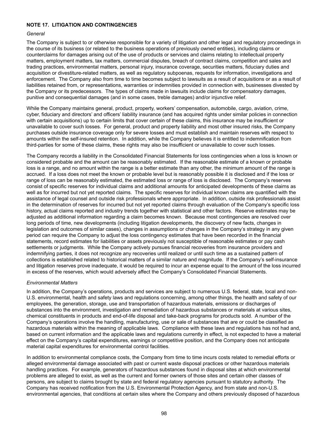 NOTE 17. LITIGATION AND CONTINGENCIES General The Company is subject to or otherwise responsible for a variety of litigation and other legal and regulatory proceedings in the course of its business (or related to the business operations of previously owned entities), including claims or counterclaims for damages arising out of the use of products or services and claims relating to intellectual property matters, employment matters, tax matters, commercial disputes, breach of contract claims, competition and sales and trading practices, environmental matters, personal injury, insurance coverage, securities matters, fiduciary duties and acquisition or divestiture-related matters, as well as regulatory subpoenas, requests for information, investigations and enforcement. The Company also from time to time becomes subject to lawsuits as a result of acquisitions or as a result of liabilities retained from, or representations, warranties or indemnities provided in connection with, businesses divested by the Company or its predecessors. The types of claims made in lawsuits include claims for compensatory damages, punitive and consequential damages (and in some cases, treble damages) and/or injunctive relief. While the Company maintains general, product, property, workers’ compensation, automobile, cargo, aviation, crime, cyber, fiduciary and directors’ and officers’ liability insurance (and has acquired rights under similar policies in connection with certain acquisitions) up to certain limits that cover certain of these claims, this insurance may be insufficient or unavailable to cover such losses. For general, product and property liability and most other insured risks, the Company purchases outside insurance coverage only for severe losses and must establish and maintain reserves with respect to amounts within the self-insured retention. In addition, while the Company believes it is entitled to indemnification from third-parties for some of these claims, these rights may also be insufficient or unavailable to cover such losses. The Company records a liability in the Consolidated Financial Statements for loss contingencies when a loss is known or considered probable and the amount can be reasonably estimated. If the reasonable estimate of a known or probable loss is a range, and no amount within the range is a better estimate than any other, the minimum amount of the range is accrued. If a loss does not meet the known or probable level but is reasonably possible it is disclosed and if the loss or range of loss can be reasonably estimated, the estimated loss or range of loss is disclosed. The Company’s reserves consist of specific reserves for individual claims and additional amounts for anticipated developments of these claims as well as for incurred but not yet reported claims. The specific reserves for individual known claims are quantified with the assistance of legal counsel and outside risk professionals where appropriate. In addition, outside risk professionals assist in the determination of reserves for incurred but not yet reported claims through evaluation of the Company’s specific loss history, actual claims reported and industry trends together with statistical and other factors. Reserve estimates may be adjusted as additional information regarding a claim becomes known. Because most contingencies are resolved over long periods of time, new developments (including litigation developments, the discovery of new facts, changes in legislation and outcomes of similar cases), changes in assumptions or changes in the Company’s strategy in any given period can require the Company to adjust the loss contingency estimates that have been recorded in the financial statements, record estimates for liabilities or assets previously not susceptible of reasonable estimates or pay cash settlements or judgments. While the Company actively pursues financial recoveries from insurance providers and indemnifying parties, it does not recognize any recoveries until realized or until such time as a sustained pattern of collections is established related to historical matters of a similar nature and magnitude. If the Company’s self-insurance and litigation reserves prove inadequate, it would be required to incur an expense equal to the amount of the loss incurred in excess of the reserves, which would adversely affect the Company’s Consolidated Financial Statements. Environmental Matters In addition, the Company’s operations, products and services are subject to numerous U.S. federal, state, local and non- U.S. environmental, health and safety laws and regulations concerning, among other things, the health and safety of our employees, the generation, storage, use and transportation of hazardous materials, emissions or discharges of substances into the environment, investigation and remediation of hazardous substances or materials at various sites, chemical constituents in products and end-of-life disposal and take-back programs for products sold. A number of the Company’s operations involve the handling, manufacturing, use or sale of substances that are or could be classified as hazardous materials within the meaning of applicable laws. Compliance with these laws and regulations has not had and, based on current information and the applicable laws and regulations currently in effect, is not expected to have a material effect on the Company’s capital expenditures, earnings or competitive position, and the Company does not anticipate material capital expenditures for environmental control facilities. In addition to environmental compliance costs, the Company from time to time incurs costs related to remedial efforts or alleged environmental damage associated with past or current waste disposal practices or other hazardous materials handling practices. For example, generators of hazardous substances found in disposal sites at which environmental problems are alleged to exist, as well as the 