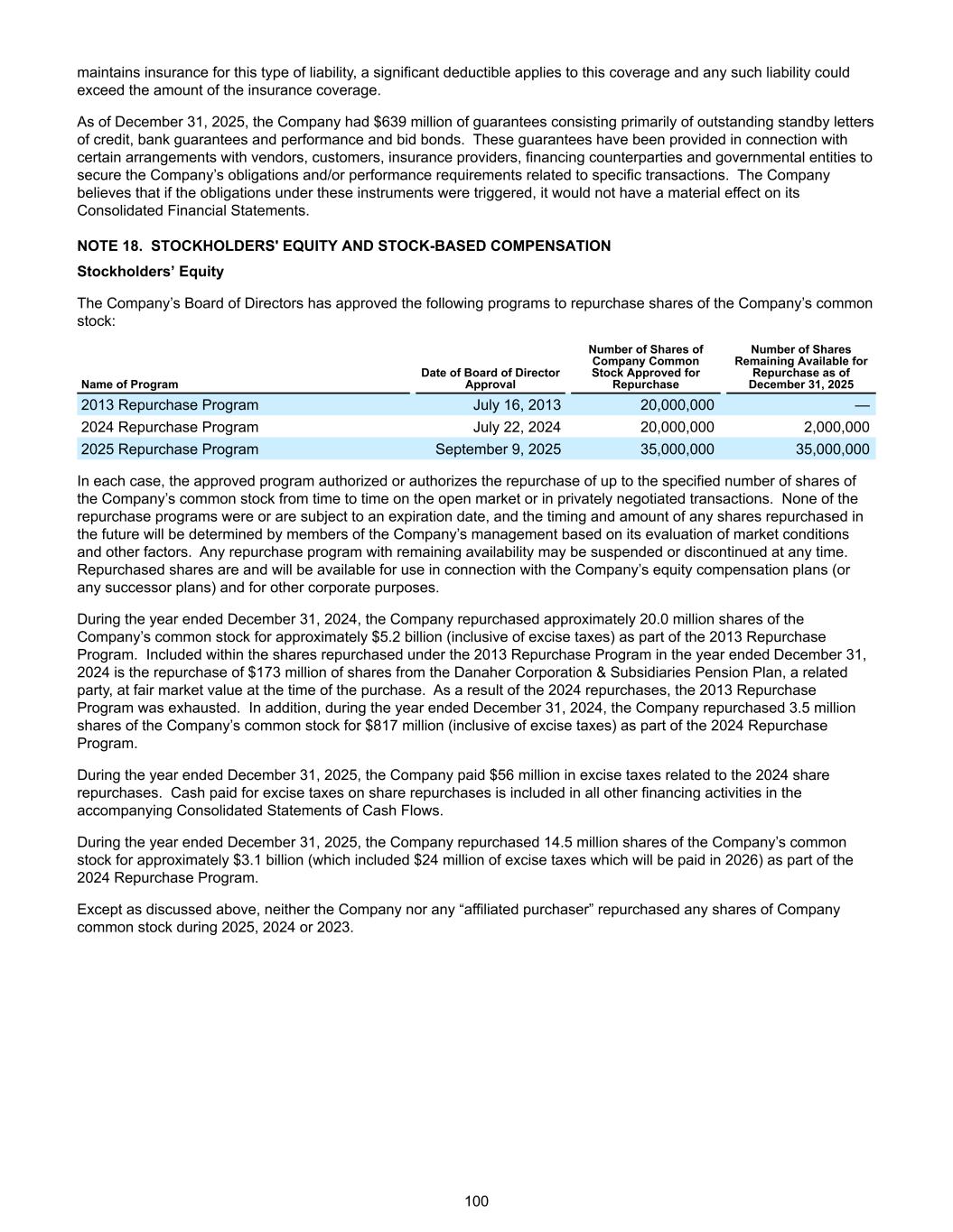 maintains insurance for this type of liability, a significant deductible applies to this coverage and any such liability could exceed the amount of the insurance coverage. As of December 31, 2025, the Company had $639 million of guarantees consisting primarily of outstanding standby letters of credit, bank guarantees and performance and bid bonds. These guarantees have been provided in connection with certain arrangements with vendors, customers, insurance providers, financing counterparties and governmental entities to secure the Company’s obligations and/or performance requirements related to specific transactions. The Company believes that if the obligations under these instruments were triggered, it would not have a material effect on its Consolidated Financial Statements. NOTE 18. STOCKHOLDERS' EQUITY AND STOCK-BASED COMPENSATION Stockholders’ Equity The Company’s Board of Directors has approved the following programs to repurchase shares of the Company’s common stock: Name of Program Date of Board of Director Approval Number of Shares of Company Common Stock Approved for Repurchase Number of Shares Remaining Available for Repurchase as of December 31, 2025 2013 Repurchase Program July 16, 2013 20,000,000 — 2024 Repurchase Program July 22, 2024 20,000,000 2,000,000 2025 Repurchase Program September 9, 2025 35,000,000 35,000,000 In each case, the approved program authorized or authorizes the repurchase of up to the specified number of shares of the Company’s common stock from time to time on the open market or in privately negotiated transactions. None of the repurchase programs were or are subject to an expiration date, and the timing and amount of any shares repurchased in the future will be determined by members of the Company’s management based on its evaluation of market conditions and other factors. Any repurchase program with remaining availability may be suspended or discontinued at any time. Repurchased shares are and will be available for use in connection with the Company’s equity compensation plans (or any successor plans) and for other corporate purposes. During the year ended December 31, 2024, the Company repurchased approximately 20.0 million shares of the Company’s common stock for approximately $5.2 billion (inclusive of excise taxes) as part of the 2013 Repurchase Program. Included within the shares repurchased under the 2013 Repurchase Program in the year ended December 31, 2024 is the repurchase of $173 million of shares from the Danaher Corporation & Subsidiaries Pension Plan, a related party, at fair market value at the time of the purchase. As a result of the 2024 repurchases, the 2013 Repurchase Program was exhausted. In addition, during the year ended December 31, 2024, the Company repurchased 3.5 million shares of the Company’s common stock for $817 million (inclusive of excise taxes) as part of the 2024 Repurchase Program. During the year ended December 31, 2025, the Company paid $56 million in excise taxes related to the 2024 share repurchases. Cash paid for excise taxes on share repurchases is included in all other financing activities in the accompanying Consolidated Statements of Cash Flows. During the year ended December 31, 2025, the Company repurchased 14.5 million shares of the Company’s common stock for approximately $3.1 billion (which included $24 million of excise taxes which will be paid in 2026) as part of the 2024 Repurchase Program. Except as discussed above, neither the Company nor any “affiliated purchaser” repurchased any shares of Company common stock during 2025, 2024 or 2023. 100