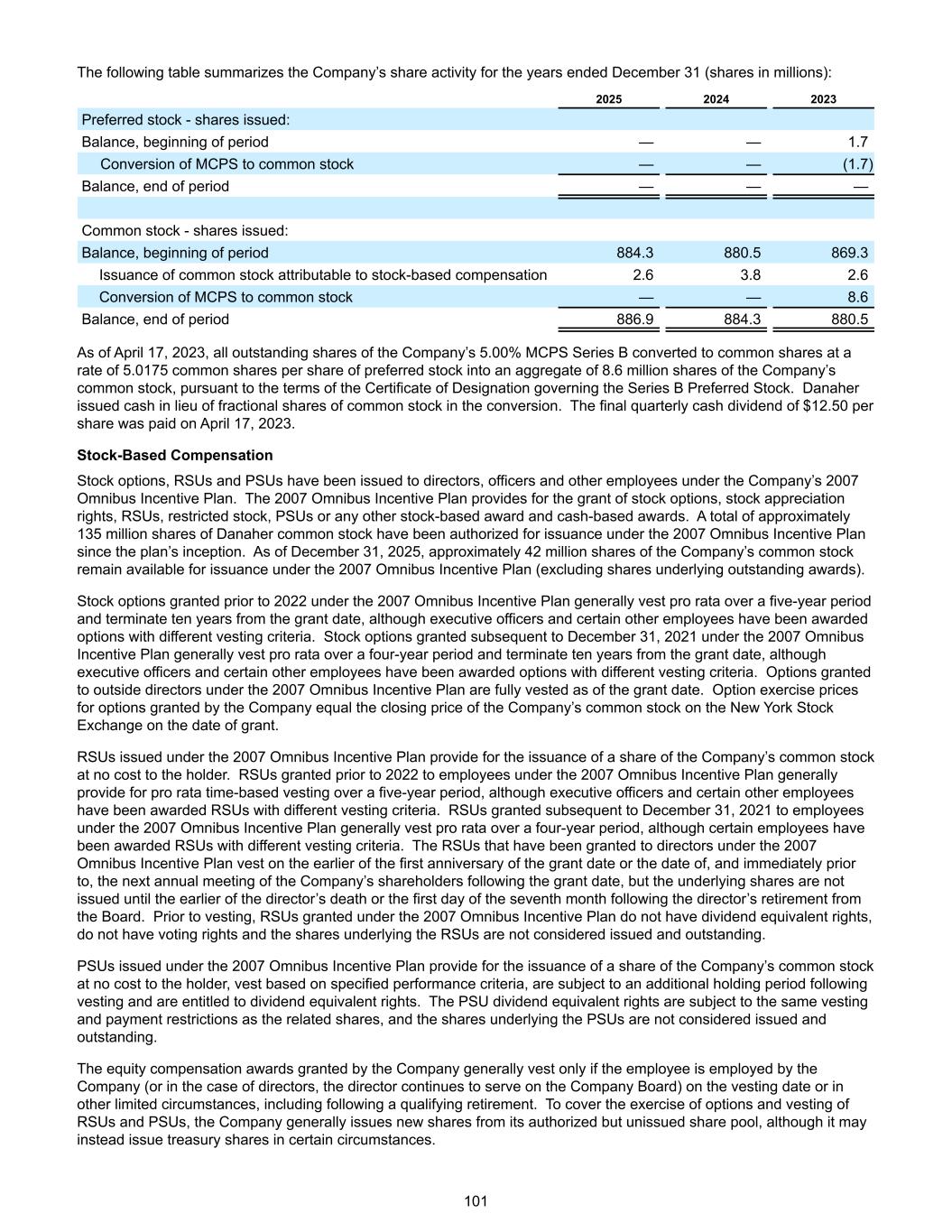 The following table summarizes the Company’s share activity for the years ended December 31 (shares in millions): 2025 2024 2023 Preferred stock - shares issued: Balance, beginning of period — — 1.7 Conversion of MCPS to common stock — — (1.7) Balance, end of period — — — Common stock - shares issued: Balance, beginning of period 884.3 880.5 869.3 Issuance of common stock attributable to stock-based compensation 2.6 3.8 2.6 Conversion of MCPS to common stock — — 8.6 Balance, end of period 886.9 884.3 880.5 As of April 17, 2023, all outstanding shares of the Company’s 5.00% MCPS Series B converted to common shares at a rate of 5.0175 common shares per share of preferred stock into an aggregate of 8.6 million shares of the Company’s common stock, pursuant to the terms of the Certificate of Designation governing the Series B Preferred Stock. Danaher issued cash in lieu of fractional shares of common stock in the conversion. The final quarterly cash dividend of $12.50 per share was paid on April 17, 2023. Stock-Based Compensation Stock options, RSUs and PSUs have been issued to directors, officers and other employees under the Company’s 2007 Omnibus Incentive Plan. The 2007 Omnibus Incentive Plan provides for the grant of stock options, stock appreciation rights, RSUs, restricted stock, PSUs or any other stock-based award and cash-based awards. A total of approximately 135 million shares of Danaher common stock have been authorized for issuance under the 2007 Omnibus Incentive Plan since the plan’s inception. As of December 31, 2025, approximately 42 million shares of the Company’s common stock remain available for issuance under the 2007 Omnibus Incentive Plan (excluding shares underlying outstanding awards). Stock options granted prior to 2022 under the 2007 Omnibus Incentive Plan generally vest pro rata over a five-year period and terminate ten years from the grant date, although executive officers and certain other employees have been awarded options with different vesting criteria. Stock options granted subsequent to December 31, 2021 under the 2007 Omnibus Incentive Plan generally vest pro rata over a four-year period and terminate ten years from the grant date, although executive officers and certain other employees have been awarded options with different vesting criteria. Options granted to outside directors under the 2007 Omnibus Incentive Plan are fully vested as of the grant date. Option exercise prices for options granted by the Company equal the closing price of the Company’s common stock on the New York Stock Exchange on the date of grant. RSUs issued under the 2007 Omnibus Incentive Plan provide for the issuance of a share of the Company’s common stock at no cost to the holder. RSUs granted prior to 2022 to employees under the 2007 Omnibus Incentive Plan generally provide for pro rata time-based vesting over a five-year period, although executive officers and certain other employees have been awarded RSUs with different vesting criteria. RSUs granted subsequent to December 31, 2021 to employees under the 2007 Omnibus Incentive Plan generally vest pro rata over a four-year period, although certain employees have been awarded RSUs with different vesting criteria. The RSUs that have been granted to directors under the 2007 Omnibus Incentive Plan vest on the earlier of the first anniversary of the grant date or the date of, and immediately prior to, the next annual meeting of the Company’s shareholders following the grant date, but the underlying shares are not issued until the earlier of the director’s death or the first day of the seventh month following the director’s retirement from the Board. Prior to vesting, RSUs granted under the 2007 Omnibus Incentive Plan do not have dividend equivalent rights, do not have voting rights and the shares underlying the RSUs are not considered issued and outstanding. PSUs issued under the 2007 Omnibus Incentive Plan provide for the issuance of a share of the Company’s common stock at no cost to the holder, vest based on specified performance criteria, are subject to an additional holding period following vesting and are entitled to dividend equivalent rights. The PSU dividend equivalent rights are subject to the same vesting and payment restrictions as the related shares, and the shares underlying the PSUs are not considered issued and outstanding. The equity compensation awards granted by the Company generally vest only if the employee is employed by the Company (or in the case of directors, the director continues to serve on the Company Board) on the vesting date or in other limited circumstances, including following a qualifying retirement. To cover the exercise of options and vesting of RSUs and PSUs, the Company generally issues new shares from its authorized but unissued share pool, although it may instead issue treasury shares in certain circumstances. 101
