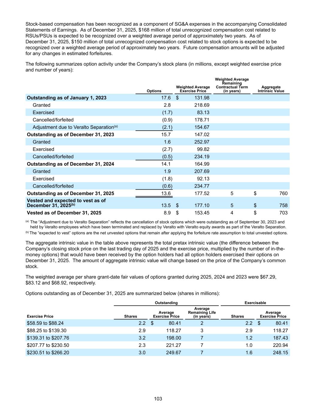 Stock-based compensation has been recognized as a component of SG&A expenses in the accompanying Consolidated Statements of Earnings. As of December 31, 2025, $168 million of total unrecognized compensation cost related to RSUs/PSUs is expected to be recognized over a weighted average period of approximately two years. As of December 31, 2025, $150 million of total unrecognized compensation cost related to stock options is expected to be recognized over a weighted average period of approximately two years. Future compensation amounts will be adjusted for any changes in estimated forfeitures. The following summarizes option activity under the Company’s stock plans (in millions, except weighted exercise price and number of years): Options Weighted Average Exercise Price Weighted Average Remaining Contractual Term (in years) Aggregate Intrinsic Value Outstanding as of January 1, 2023 17.6 $ 131.98 Granted 2.8 218.69 Exercised (1.7) 83.13 Cancelled/forfeited (0.9) 178.71 Adjustment due to Veralto Separation(a) (2.1) 154.67 Outstanding as of December 31, 2023 15.7 147.02 Granted 1.6 252.97 Exercised (2.7) 99.82 Cancelled/forfeited (0.5) 234.19 Outstanding as of December 31, 2024 14.1 164.99 Granted 1.9 207.69 Exercised (1.8) 92.13 Cancelled/forfeited (0.6) 234.77 Outstanding as of December 31, 2025 13.6 177.52 5 $ 760 Vested and expected to vest as of December 31, 2025(b) 13.5 $ 177.10 5 $ 758 Vested as of December 31, 2025 8.9 $ 153.45 4 $ 703 (a) The “Adjustment due to Veralto Separation” reflects the cancellation of stock options which were outstanding as of September 30, 2023 and held by Veralto employees which have been terminated and replaced by Veralto with Veralto equity awards as part of the Veralto Separation. (b) The “expected to vest” options are the net unvested options that remain after applying the forfeiture rate assumption to total unvested options. The aggregate intrinsic value in the table above represents the total pretax intrinsic value (the difference between the Company’s closing stock price on the last trading day of 2025 and the exercise price, multiplied by the number of in-the- money options) that would have been received by the option holders had all option holders exercised their options on December 31, 2025. The amount of aggregate intrinsic value will change based on the price of the Company’s common stock. The weighted average per share grant-date fair values of options granted during 2025, 2024 and 2023 were $67.29, $83.12 and $68.92, respectively. Options outstanding as of December 31, 2025 are summarized below (shares in millions): Outstanding Exercisable Exercise Price Shares Average Exercise Price Average Remaining Life (in years) Shares Average Exercise Price $58.59 to $88.24 2.2 $ 80.41 2 2.2 $ 80.41 $88.25 to $139.30 2.9 118.27 3 2.9 118.27 $139.31 to $207.76 3.2 198.00 7 1.2 187.43 $207.77 to $230.50 2.3 221.27 7 1.0 220.94 $230.51 to $266.20 3.0 249.67 7 1.6 248.15 103