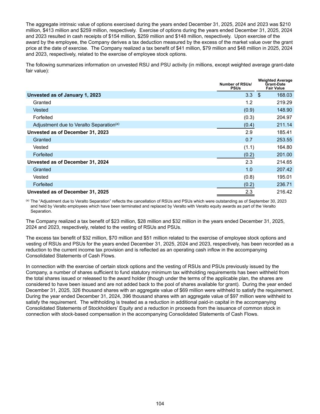 The aggregate intrinsic value of options exercised during the years ended December 31, 2025, 2024 and 2023 was $210 million, $413 million and $259 million, respectively. Exercise of options during the years ended December 31, 2025, 2024 and 2023 resulted in cash receipts of $154 million, $259 million and $148 million, respectively. Upon exercise of the award by the employee, the Company derives a tax deduction measured by the excess of the market value over the grant price at the date of exercise. The Company realized a tax benefit of $41 million, $79 million and $48 million in 2025, 2024 and 2023, respectively, related to the exercise of employee stock options. The following summarizes information on unvested RSU and PSU activity (in millions, except weighted average grant-date fair value): Number of RSUs/ PSUs Weighted Average Grant-Date Fair Value Unvested as of January 1, 2023 3.3 $ 168.03 Granted 1.2 219.29 Vested (0.9) 148.90 Forfeited (0.3) 204.97 Adjustment due to Veralto Separation(a) (0.4) 211.14 Unvested as of December 31, 2023 2.9 185.41 Granted 0.7 253.55 Vested (1.1) 164.80 Forfeited (0.2) 201.00 Unvested as of December 31, 2024 2.3 214.65 Granted 1.0 207.42 Vested (0.8) 195.01 Forfeited (0.2) 236.71 Unvested as of December 31, 2025 2.3 216.42 (a) The “Adjustment due to Veralto Separation” reflects the cancellation of RSUs and PSUs which were outstanding as of September 30, 2023 and held by Veralto employees which have been terminated and replaced by Veralto with Veralto equity awards as part of the Veralto Separation. The Company realized a tax benefit of $23 million, $28 million and $32 million in the years ended December 31, 2025, 2024 and 2023, respectively, related to the vesting of RSUs and PSUs. The excess tax benefit of $32 million, $70 million and $51 million related to the exercise of employee stock options and vesting of RSUs and PSUs for the years ended December 31, 2025, 2024 and 2023, respectively, has been recorded as a reduction to the current income tax provision and is reflected as an operating cash inflow in the accompanying Consolidated Statements of Cash Flows. In connection with the exercise of certain stock options and the vesting of RSUs and PSUs previously issued by the Company, a number of shares sufficient to fund statutory minimum tax withholding requirements has been withheld from the total shares issued or released to the award holder (though under the terms of the applicable plan, the shares are considered to have been issued and are not added back to the pool of shares available for grant). During the year ended December 31, 2025, 326 thousand shares with an aggregate value of $69 million were withheld to satisfy the requirement. During the year ended December 31, 2024, 396 thousand shares with an aggregate value of $97 million were withheld to satisfy the requirement. The withholding is treated as a reduction in additional paid-in capital in the accompanying Consolidated Statements of Stockholders’ Equity and a reduction in proceeds from the issuance of common stock in connection with stock-based compensation in the accompanying Consolidated Statements of Cash Flows. 104