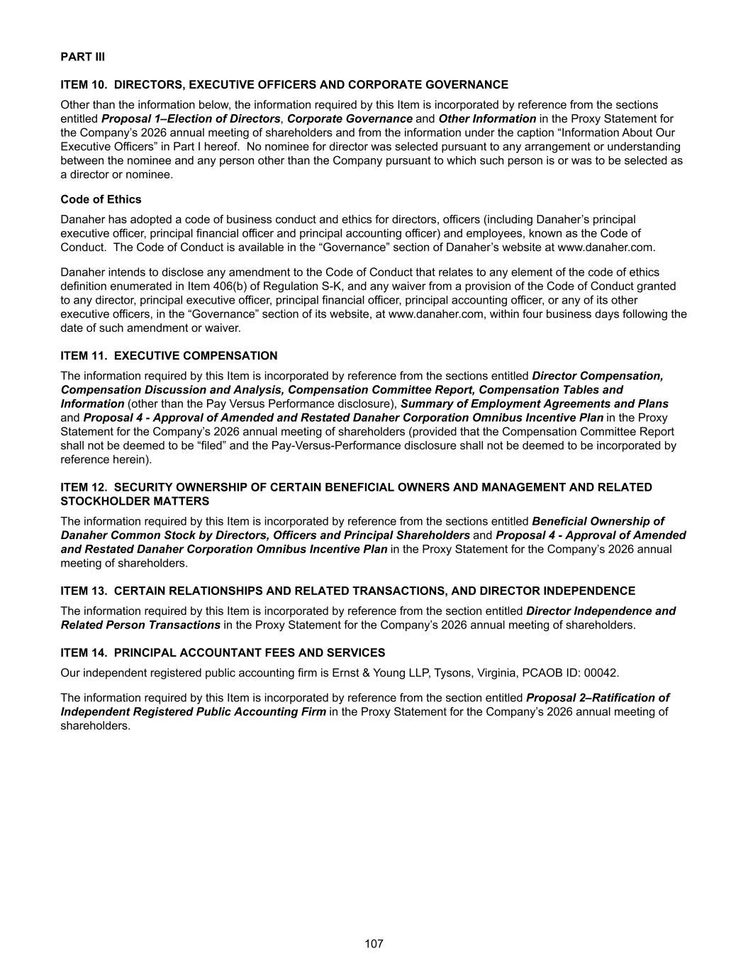 PART III ITEM 10. DIRECTORS, EXECUTIVE OFFICERS AND CORPORATE GOVERNANCE Other than the information below, the information required by this Item is incorporated by reference from the sections entitled Proposal 1–Election of Directors, Corporate Governance and Other Information in the Proxy Statement for the Company’s 2026 annual meeting of shareholders and from the information under the caption “Information About Our Executive Officers” in Part I hereof. No nominee for director was selected pursuant to any arrangement or understanding between the nominee and any person other than the Company pursuant to which such person is or was to be selected as a director or nominee. Code of Ethics Danaher has adopted a code of business conduct and ethics for directors, officers (including Danaher’s principal executive officer, principal financial officer and principal accounting officer) and employees, known as the Code of Conduct. The Code of Conduct is available in the “Governance” section of Danaher’s website at www.danaher.com. Danaher intends to disclose any amendment to the Code of Conduct that relates to any element of the code of ethics definition enumerated in Item 406(b) of Regulation S-K, and any waiver from a provision of the Code of Conduct granted to any director, principal executive officer, principal financial officer, principal accounting officer, or any of its other executive officers, in the “Governance” section of its website, at www.danaher.com, within four business days following the date of such amendment or waiver. ITEM 11. EXECUTIVE COMPENSATION The information required by this Item is incorporated by reference from the sections entitled Director Compensation, Compensation Discussion and Analysis, Compensation Committee Report, Compensation Tables and Information (other than the Pay Versus Performance disclosure), Summary of Employment Agreements and Plans and Proposal 4 - Approval of Amended and Restated Danaher Corporation Omnibus Incentive Plan in the Proxy Statement for the Company’s 2026 annual meeting of shareholders (provided that the Compensation Committee Report shall not be deemed to be “filed” and the Pay-Versus-Performance disclosure shall not be deemed to be incorporated by reference herein). ITEM 12. SECURITY OWNERSHIP OF CERTAIN BENEFICIAL OWNERS AND MANAGEMENT AND RELATED STOCKHOLDER MATTERS The information required by this Item is incorporated by reference from the sections entitled Beneficial Ownership of Danaher Common Stock by Directors, Officers and Principal Shareholders and Proposal 4 - Approval of Amended and Restated Danaher Corporation Omnibus Incentive Plan in the Proxy Statement for the Company’s 2026 annual meeting of shareholders. ITEM 13. CERTAIN RELATIONSHIPS AND RELATED TRANSACTIONS, AND DIRECTOR INDEPENDENCE The information required by this Item is incorporated by reference from the section entitled Director Independence and Related Person Transactions in the Proxy Statement for the Company’s 2026 annual meeting of shareholders. ITEM 14. PRINCIPAL ACCOUNTANT FEES AND SERVICES Our independent registered public accounting firm is Ernst & Young LLP, Tysons, Virginia, PCAOB ID: 00042. The information required by this Item is incorporated by reference from the section entitled Proposal 2–Ratification of Independent Registered Public Accounting Firm in the Proxy Statement for the Company’s 2026 annual meeting of shareholders. 107