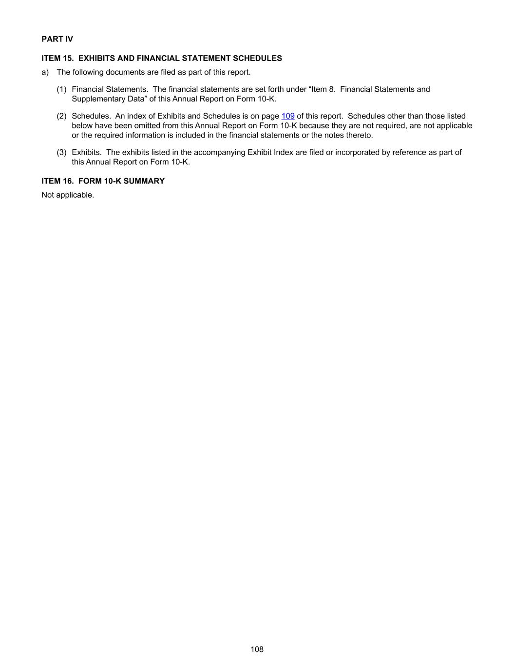 PART IV ITEM 15. EXHIBITS AND FINANCIAL STATEMENT SCHEDULES a) The following documents are filed as part of this report. (1) Financial Statements. The financial statements are set forth under “Item 8. Financial Statements and Supplementary Data” of this Annual Report on Form 10-K. (2) Schedules. An index of Exhibits and Schedules is on page 109 of this report. Schedules other than those listed below have been omitted from this Annual Report on Form 10-K because they are not required, are not applicable or the required information is included in the financial statements or the notes thereto. (3) Exhibits. The exhibits listed in the accompanying Exhibit Index are filed or incorporated by reference as part of this Annual Report on Form 10-K. ITEM 16. FORM 10-K SUMMARY Not applicable. 108