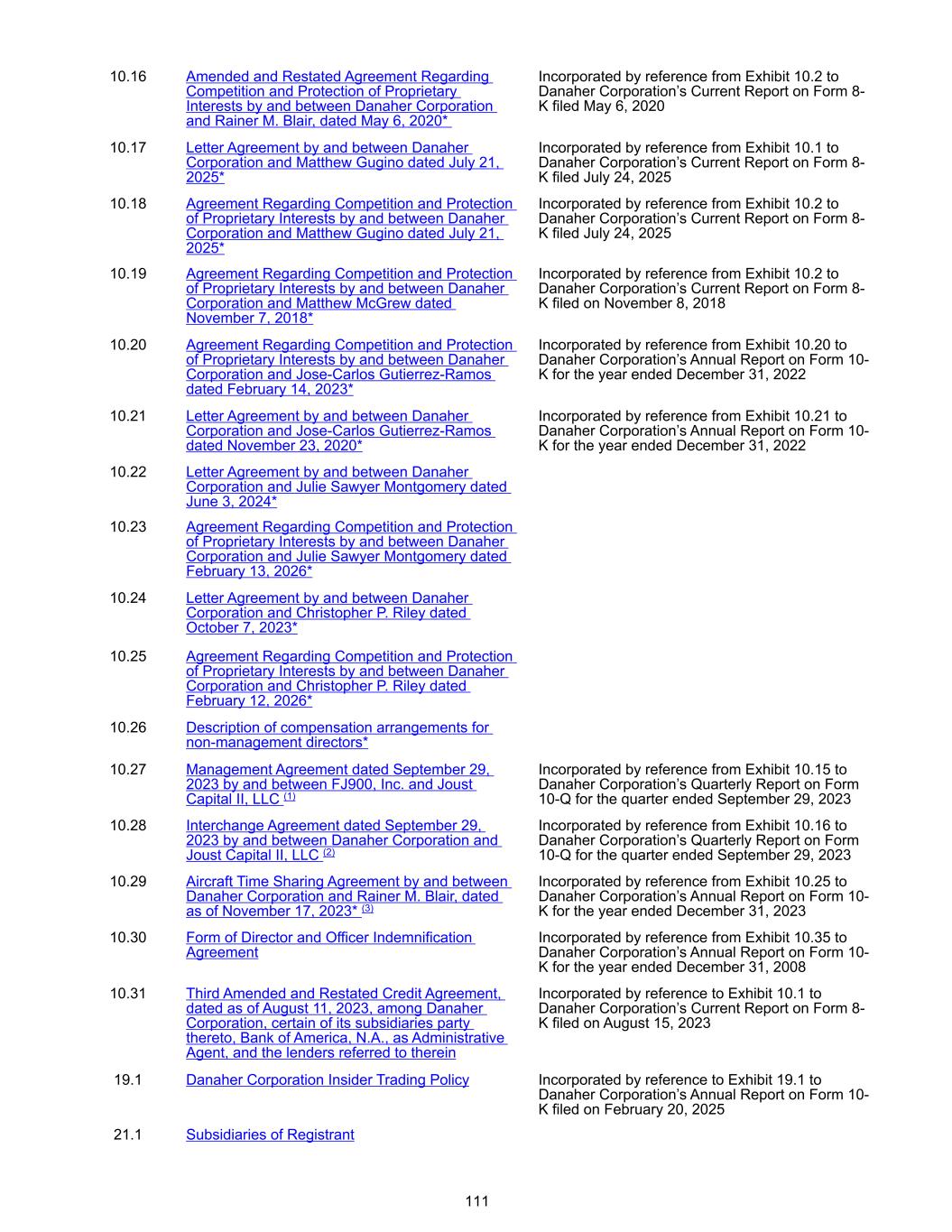 10.16 Amended and Restated Agreement Regarding Competition and Protection of Proprietary Interests by and between Danaher Corporation and Rainer M. Blair, dated May 6, 2020* Incorporated by reference from Exhibit 10.2 to Danaher Corporation’s Current Report on Form 8- K filed May 6, 2020 10.17 Letter Agreement by and between Danaher Corporation and Matthew Gugino dated July 21, 2025* Incorporated by reference from Exhibit 10.1 to Danaher Corporation’s Current Report on Form 8- K filed July 24, 2025 10.18 Agreement Regarding Competition and Protection of Proprietary Interests by and between Danaher Corporation and Matthew Gugino dated July 21, 2025* Incorporated by reference from Exhibit 10.2 to Danaher Corporation’s Current Report on Form 8- K filed July 24, 2025 10.19 Agreement Regarding Competition and Protection of Proprietary Interests by and between Danaher Corporation and Matthew McGrew dated November 7, 2018* Incorporated by reference from Exhibit 10.2 to Danaher Corporation’s Current Report on Form 8- K filed on November 8, 2018 10.20 Agreement Regarding Competition and Protection of Proprietary Interests by and between Danaher Corporation and Jose-Carlos Gutierrez-Ramos dated February 14, 2023* Incorporated by reference from Exhibit 10.20 to Danaher Corporation’s Annual Report on Form 10- K for the year ended December 31, 2022 10.21 Letter Agreement by and between Danaher Corporation and Jose-Carlos Gutierrez-Ramos dated November 23, 2020* Incorporated by reference from Exhibit 10.21 to Danaher Corporation’s Annual Report on Form 10- K for the year ended December 31, 2022 10.22 Letter Agreement by and between Danaher Corporation and Julie Sawyer Montgomery dated June 3, 2024* 10.23 Agreement Regarding Competition and Protection of Proprietary Interests by and between Danaher Corporation and Julie Sawyer Montgomery dated February 13, 2026* 10.24 Letter Agreement by and between Danaher Corporation and Christopher P. Riley dated October 7, 2023* 10.25 Agreement Regarding Competition and Protection of Proprietary Interests by and between Danaher Corporation and Christopher P. Riley dated February 12, 2026* 10.26 Description of compensation arrangements for non-management directors* 10.27 Management Agreement dated September 29, 2023 by and between FJ900, Inc. and Joust Capital II, LLC (1) Incorporated by reference from Exhibit 10.15 to Danaher Corporation’s Quarterly Report on Form 10-Q for the quarter ended September 29, 2023 10.28 Interchange Agreement dated September 29, 2023 by and between Danaher Corporation and Joust Capital II, LLC (2) Incorporated by reference from Exhibit 10.16 to Danaher Corporation’s Quarterly Report on Form 10-Q for the quarter ended September 29, 2023 10.29 Aircraft Time Sharing Agreement by and between Danaher Corporation and Rainer M. Blair, dated as of November 17, 2023* (3) Incorporated by reference from Exhibit 10.25 to Danaher Corporation’s Annual Report on Form 10- K for the year ended December 31, 2023 10.30 Form of Director and Officer Indemnification Agreement Incorporated by reference from Exhibit 10.35 to Danaher Corporation’s Annual Report on Form 10- K for the year ended December 31, 2008 10.31 Third Amended and Restated Credit Agreement, dated as of August 11, 2023, among Danaher Corporation, certain of its subsidiaries party thereto, Bank of America, N.A., as Administrative Agent, and the lenders referred to therein Incorporated by reference to Exhibit 10.1 to Danaher Corporation’s Current Report on Form 8- K filed on August 15, 2023 19.1 Danaher Corporation Insider Trading Policy Incorporated by reference to Exhibit 19.1 to Danaher Corporation’s Annual Report on Form 10- K filed on February 20, 2025 21.1 Subsidiaries of Registrant 111