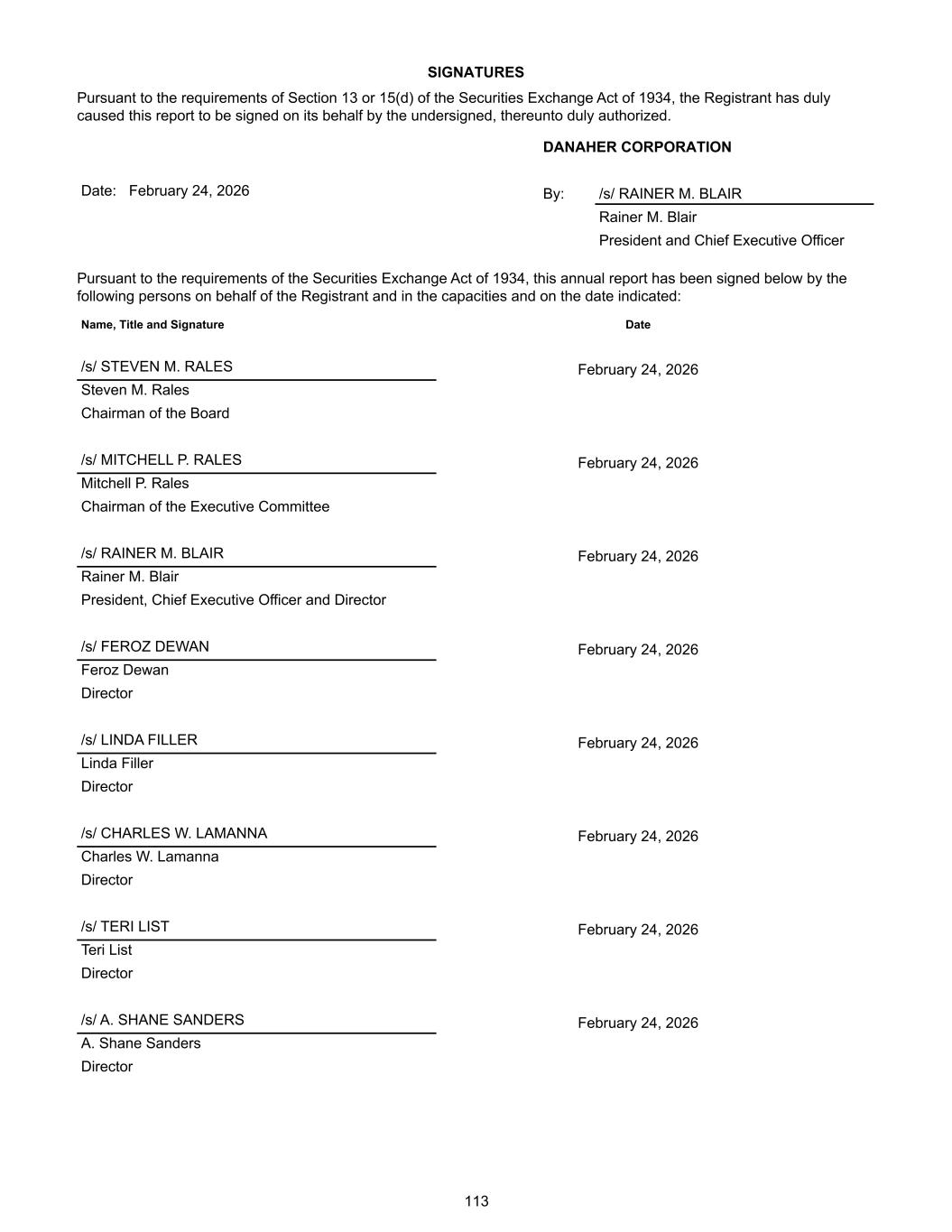 SIGNATURES Pursuant to the requirements of Section 13 or 15(d) of the Securities Exchange Act of 1934, the Registrant has duly caused this report to be signed on its behalf by the undersigned, thereunto duly authorized. DANAHER CORPORATION Date: February 24, 2026 By: /s/ RAINER M. BLAIR Rainer M. Blair President and Chief Executive Officer Pursuant to the requirements of the Securities Exchange Act of 1934, this annual report has been signed below by the following persons on behalf of the Registrant and in the capacities and on the date indicated: Name, Title and Signature Date /s/ STEVEN M. RALES February 24, 2026 Steven M. Rales Chairman of the Board /s/ MITCHELL P. RALES February 24, 2026 Mitchell P. Rales Chairman of the Executive Committee /s/ RAINER M. BLAIR February 24, 2026 Rainer M. Blair President, Chief Executive Officer and Director /s/ FEROZ DEWAN February 24, 2026 Feroz Dewan Director /s/ LINDA FILLER February 24, 2026 Linda Filler Director /s/ CHARLES W. LAMANNA February 24, 2026 Charles W. Lamanna Director /s/ TERI LIST February 24, 2026 Teri List Director /s/ A. SHANE SANDERS February 24, 2026 A. Shane Sanders Director 113