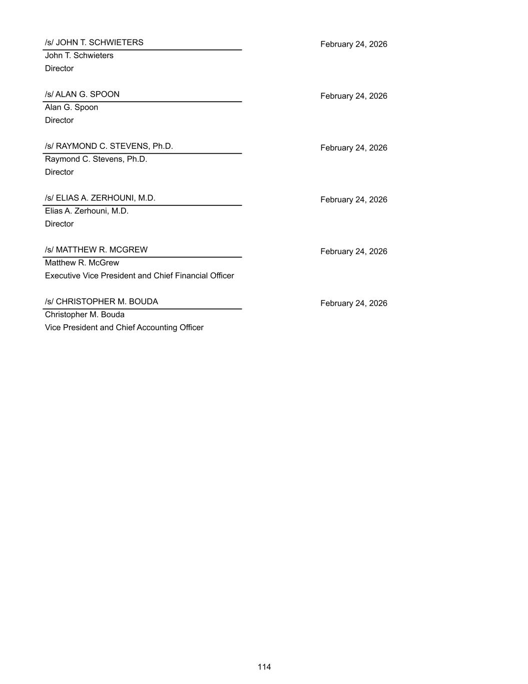 /s/ JOHN T. SCHWIETERS February 24, 2026 John T. Schwieters Director /s/ ALAN G. SPOON February 24, 2026 Alan G. Spoon Director /s/ RAYMOND C. STEVENS, Ph.D. February 24, 2026 Raymond C. Stevens, Ph.D. Director /s/ ELIAS A. ZERHOUNI, M.D. February 24, 2026 Elias A. Zerhouni, M.D. Director /s/ MATTHEW R. MCGREW February 24, 2026 Matthew R. McGrew Executive Vice President and Chief Financial Officer /s/ CHRISTOPHER M. BOUDA February 24, 2026 Christopher M. Bouda Vice President and Chief Accounting Officer 114