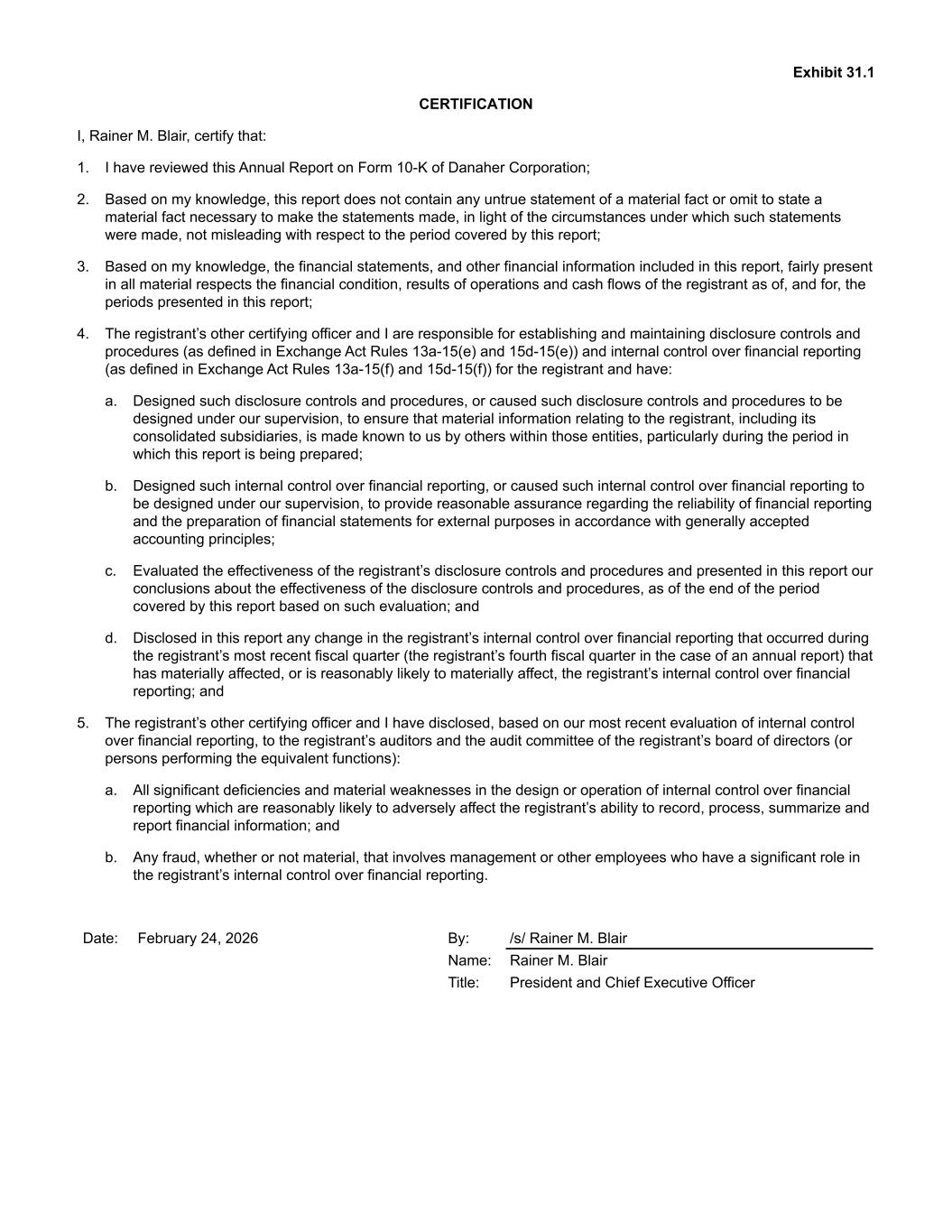 Exhibit 31.1 CERTIFICATION I, Rainer M. Blair, certify that: 1. I have reviewed this Annual Report on Form 10-K of Danaher Corporation; 2. Based on my knowledge, this report does not contain any untrue statement of a material fact or omit to state a material fact necessary to make the statements made, in light of the circumstances under which such statements were made, not misleading with respect to the period covered by this report; 3. Based on my knowledge, the financial statements, and other financial information included in this report, fairly present in all material respects the financial condition, results of operations and cash flows of the registrant as of, and for, the periods presented in this report; 4. The registrant’s other certifying officer and I are responsible for establishing and maintaining disclosure controls and procedures (as defined in Exchange Act Rules 13a-15(e) and 15d-15(e)) and internal control over financial reporting (as defined in Exchange Act Rules 13a-15(f) and 15d-15(f)) for the registrant and have: a. Designed such disclosure controls and procedures, or caused such disclosure controls and procedures to be designed under our supervision, to ensure that material information relating to the registrant, including its consolidated subsidiaries, is made known to us by others within those entities, particularly during the period in which this report is being prepared; b. Designed such internal control over financial reporting, or caused such internal control over financial reporting to be designed under our supervision, to provide reasonable assurance regarding the reliability of financial reporting and the preparation of financial statements for external purposes in accordance with generally accepted accounting principles; c. Evaluated the effectiveness of the registrant’s disclosure controls and procedures and presented in this report our conclusions about the effectiveness of the disclosure controls and procedures, as of the end of the period covered by this report based on such evaluation; and d. Disclosed in this report any change in the registrant’s internal control over financial reporting that occurred during the registrant’s most recent fiscal quarter (the registrant’s fourth fiscal quarter in the case of an annual report) that has materially affected, or is reasonably likely to materially affect, the registrant’s internal control over financial reporting; and 5. The registrant’s other certifying officer and I have disclosed, based on our most recent evaluation of internal control over financial reporting, to the registrant’s auditors and the audit committee of the registrant’s board of directors (or persons performing the equivalent functions): a. All significant deficiencies and material weaknesses in the design or operation of internal control over financial reporting which are reasonably likely to adversely affect the registrant’s ability to record, process, summarize and report financial information; and b. Any fraud, whether or not material, that involves management or other employees who have a significant role in the registrant’s internal control over financial reporting. Date: February 24, 2026 By: /s/ Rainer M. Blair Name: Rainer M. Blair Title: President and Chief Executive Officer