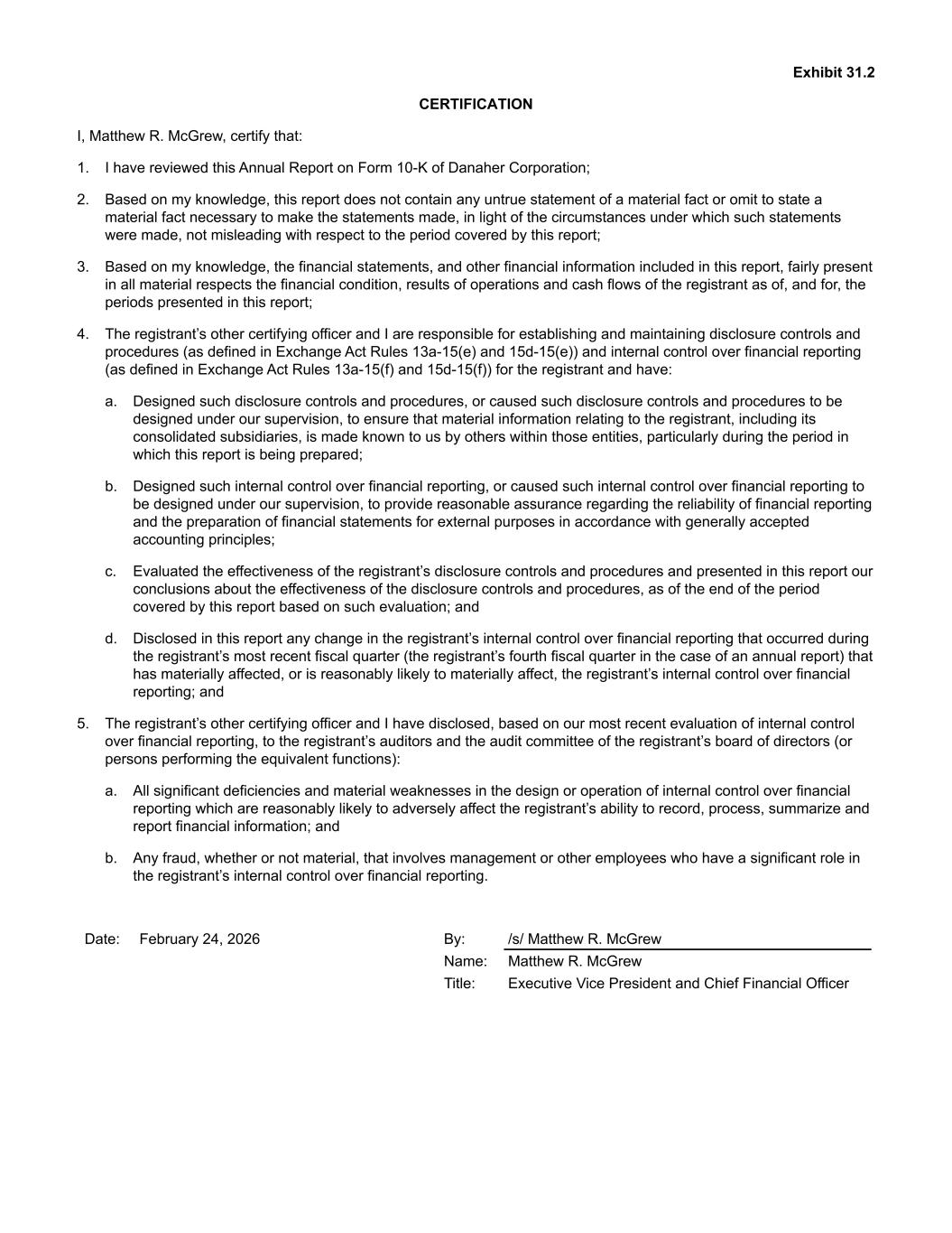 Exhibit 31.2 CERTIFICATION I, Matthew R. McGrew, certify that: 1. I have reviewed this Annual Report on Form 10-K of Danaher Corporation; 2. Based on my knowledge, this report does not contain any untrue statement of a material fact or omit to state a material fact necessary to make the statements made, in light of the circumstances under which such statements were made, not misleading with respect to the period covered by this report; 3. Based on my knowledge, the financial statements, and other financial information included in this report, fairly present in all material respects the financial condition, results of operations and cash flows of the registrant as of, and for, the periods presented in this report; 4. The registrant’s other certifying officer and I are responsible for establishing and maintaining disclosure controls and procedures (as defined in Exchange Act Rules 13a-15(e) and 15d-15(e)) and internal control over financial reporting (as defined in Exchange Act Rules 13a-15(f) and 15d-15(f)) for the registrant and have: a. Designed such disclosure controls and procedures, or caused such disclosure controls and procedures to be designed under our supervision, to ensure that material information relating to the registrant, including its consolidated subsidiaries, is made known to us by others within those entities, particularly during the period in which this report is being prepared; b. Designed such internal control over financial reporting, or caused such internal control over financial reporting to be designed under our supervision, to provide reasonable assurance regarding the reliability of financial reporting and the preparation of financial statements for external purposes in accordance with generally accepted accounting principles; c. Evaluated the effectiveness of the registrant’s disclosure controls and procedures and presented in this report our conclusions about the effectiveness of the disclosure controls and procedures, as of the end of the period covered by this report based on such evaluation; and d. Disclosed in this report any change in the registrant’s internal control over financial reporting that occurred during the registrant’s most recent fiscal quarter (the registrant’s fourth fiscal quarter in the case of an annual report) that has materially affected, or is reasonably likely to materially affect, the registrant’s internal control over financial reporting; and 5. The registrant’s other certifying officer and I have disclosed, based on our most recent evaluation of internal control over financial reporting, to the registrant’s auditors and the audit committee of the registrant’s board of directors (or persons performing the equivalent functions): a. All significant deficiencies and material weaknesses in the design or operation of internal control over financial reporting which are reasonably likely to adversely affect the registrant’s ability to record, process, summarize and report financial information; and b. Any fraud, whether or not material, that involves management or other employees who have a significant role in the registrant’s internal control over financial reporting. Date: February 24, 2026 By: /s/ Matthew R. McGrew Name: Matthew R. McGrew Title: Executive Vice President and Chief Financial Officer