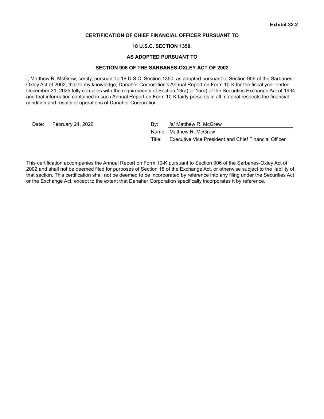 Exhibit 32.2 CERTIFICATION OF CHIEF FINANCIAL OFFICER PURSUANT TO 18 U.S.C. SECTION 1350, AS ADOPTED PURSUANT TO SECTION 906 OF THE SARBANES-OXLEY ACT OF 2002 I, Matthew R. McGrew, certify, pursuant to 18 U.S.C. Section 1350, as adopted pursuant to Section 906 of the Sarbanes- Oxley Act of 2002, that to my knowledge, Danaher Corporation’s Annual Report on Form 10-K for the fiscal year ended December 31, 2025 fully complies with the requirements of Section 13(a) or 15(d) of the Securities Exchange Act of 1934 and that information contained in such Annual Report on Form 10-K fairly presents in all material respects the financial condition and results of operations of Danaher Corporation. Date: February 24, 2026 By: /s/ Matthew R. McGrew Name: Matthew R. McGrew Title: Executive Vice President and Chief Financial Officer This certification accompanies the Annual Report on Form 10-K pursuant to Section 906 of the Sarbanes-Oxley Act of 2002 and shall not be deemed filed for purposes of Section 18 of the Exchange Act, or otherwise subject to the liability of that section. This certification shall not be deemed to be incorporated by reference into any filing under the Securities Act or the Exchange Act, except to the extent that Danaher Corporation specifically incorporates it by reference.