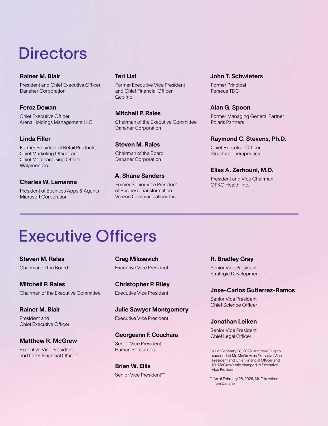Executive Officers Steven M. Rales Chairman of the Board Mitchell P. Rales Chairman of the Executive Committee Rainer M. Blair President and Chief Executive Officer Matthew R. McGrew Executive Vice President and Chief Financial Officer* Greg Milosevich Executive Vice President Christopher P. Riley Executive Vice President Julie Sawyer Montgomery Executive Vice President Georgeann F. Couchara Senior Vice President Human Resources Brian W. Ellis Senior Vice President** R. Bradley Gray Senior Vice President Strategic Development Jose-Carlos Gutierrez-Ramos Senior Vice President Chief Science Officer Jonathan Leiken Senior Vice President Chief Legal Officer * As of February 28, 2026, Matthew Gugino succeeded Mr. McGrew as Executive Vice President and Chief Financial Officer and Mr. McGrew’s title changed to Executive Vice President. ** As of February 28, 2026, Mr. Ellis retired from Danaher. Directors Rainer M. Blair President and Chief Executive Officer Danaher Corporation Feroz Dewan Chief Executive Officer Arena Holdings Management LLC Linda Filler Former President of Retail Products, Chief Marketing Officer and Chief Merchandising Officer Walgreen Co. Charles W. Lamanna President of Business Apps & Agents Microsoft Corporation Teri List Former Executive Vice President and Chief Financial Officer Gap Inc. Mitchell P. Rales Chairman of the Executive Committee Danaher Corporation Steven M. Rales Chairman of the Board Danaher Corporation A. Shane Sanders Former Senior Vice President of Business Transformation Verizon Communications Inc. John T. Schwieters Former Principal Perseus TDC Alan G. Spoon Former Managing General Partner Polaris Partners Raymond C. Stevens, Ph.D. Chief Executive Officer Structure Therapeutics Elias A. Zerhouni, M.D. President and Vice Chairman OPKO Health, Inc.