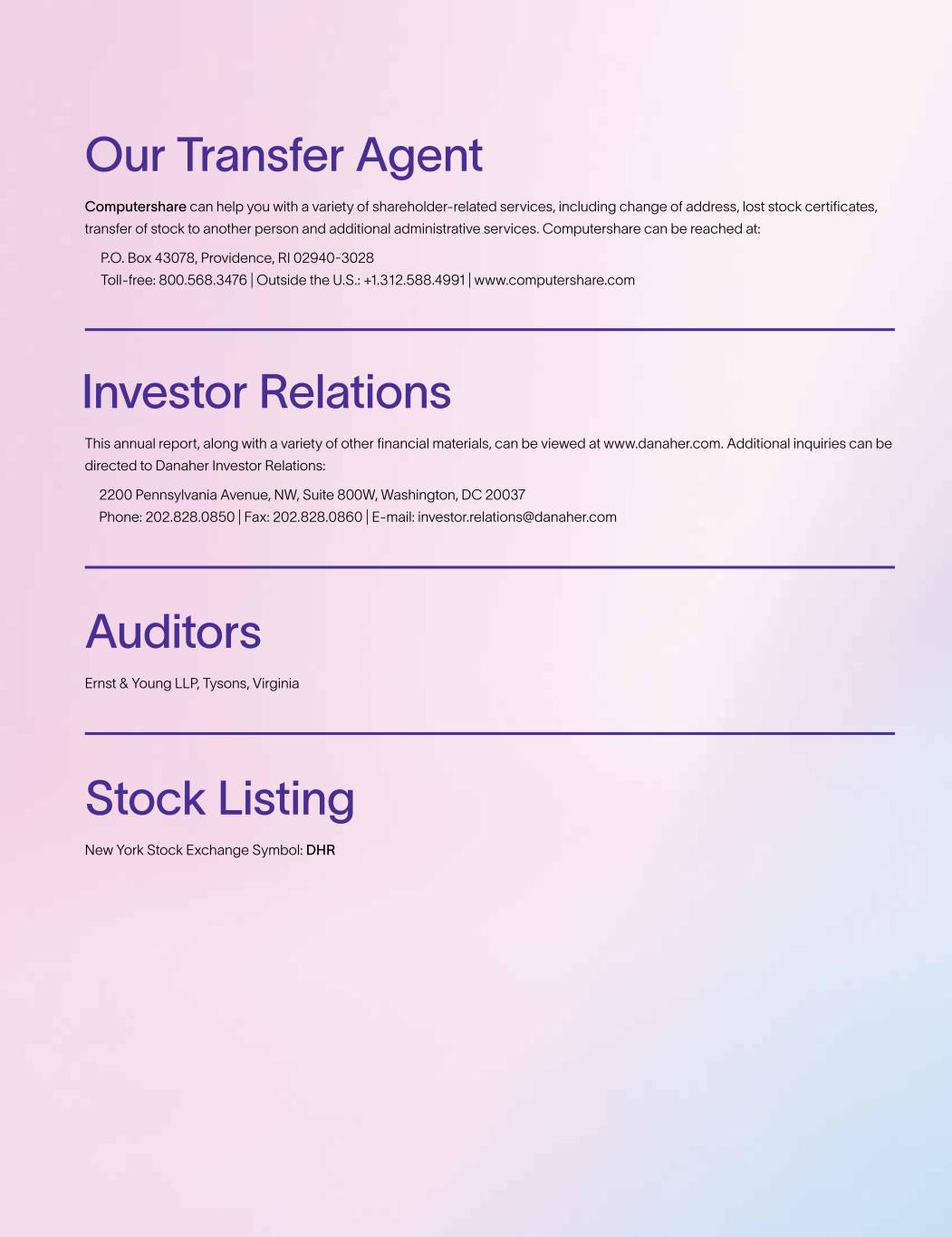 Auditors Ernst & Young LLP, Tysons, Virginia Stock Listing New York Stock Exchange Symbol: DHR Our Transfer Agent Computershare can help you with a variety of shareholder-related services, including change of address, lost stock certificates, transfer of stock to another person and additional administrative services. Computershare can be reached at: P.O. Box 43078, Providence, RI 02940-3028 Toll-free: 800.568.3476 | Outside the U.S.: +1.312.588.4991 | www.computershare.com Investor Relations This annual report, along with a variety of other financial materials, can be viewed at www.danaher.com. Additional inquiries can be directed to Danaher Investor Relations: 2200 Pennsylvania Avenue, NW, Suite 800W, Washington, DC 20037 Phone: 202.828.0850 | Fax: 202.828.0860 | E-mail: investor.relations@danaher.com