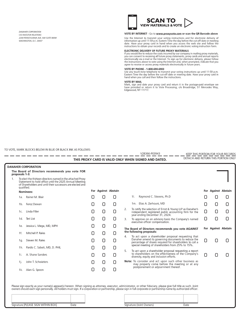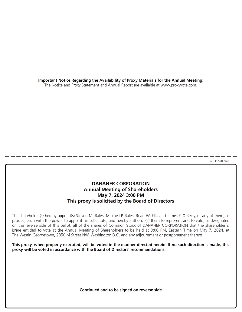 Shareholders of Danaher Common Stock at the close of business on March 8, 2024 can vote at Danaher’s 2024 Annual Meeting. Your vote is important. Please submit your proxy or voting instructions at your earliest convenience, whether or not you plan to attend the annual meeting. | |